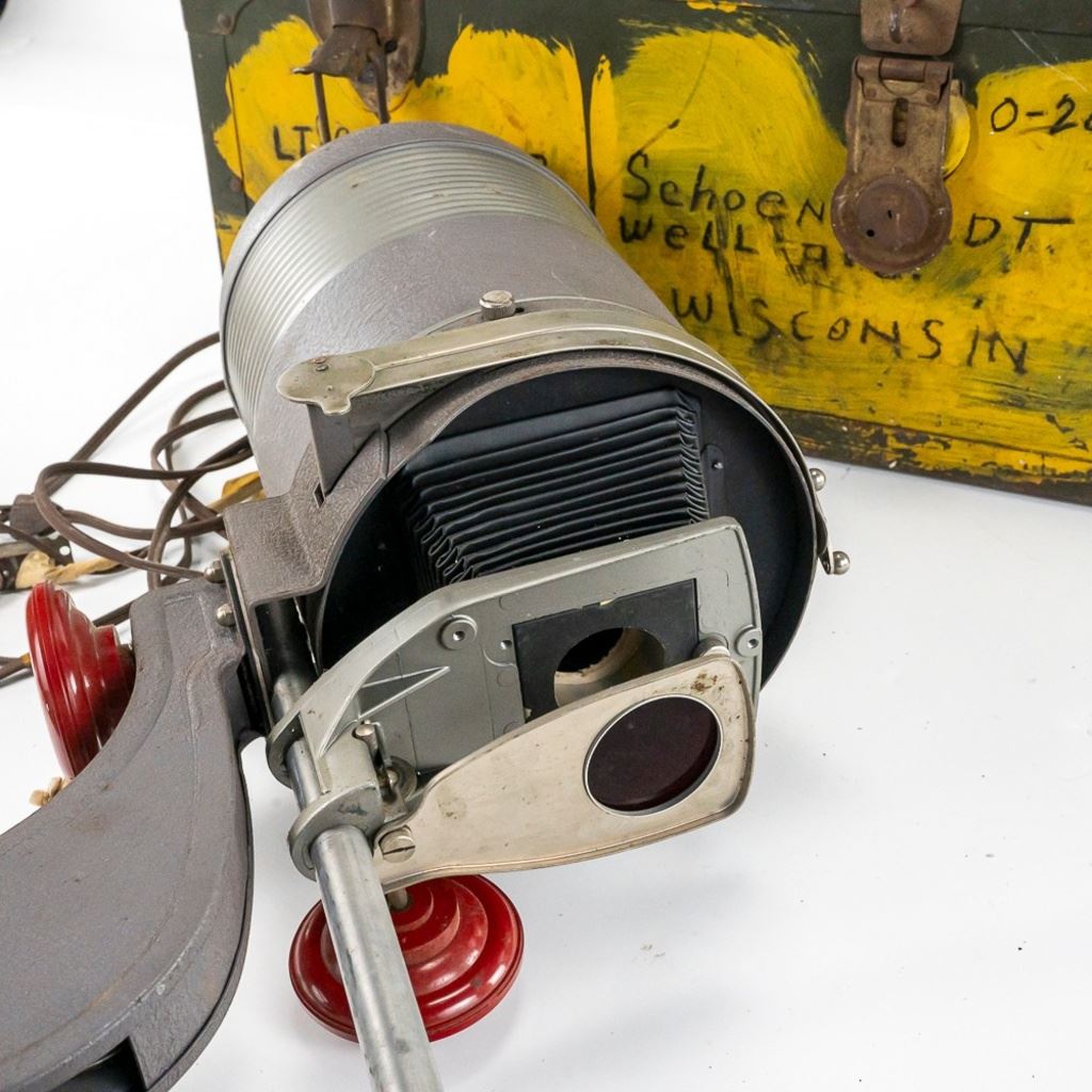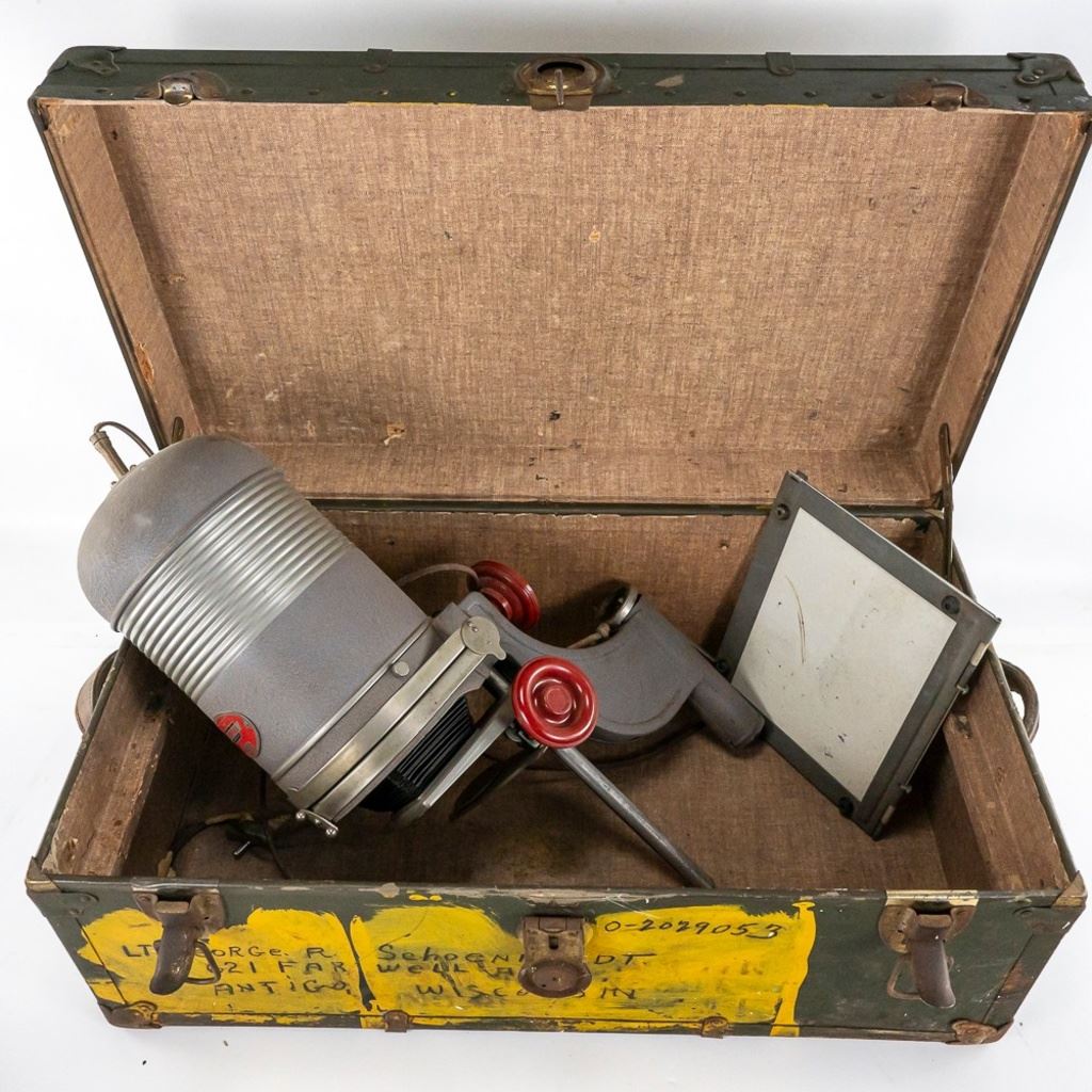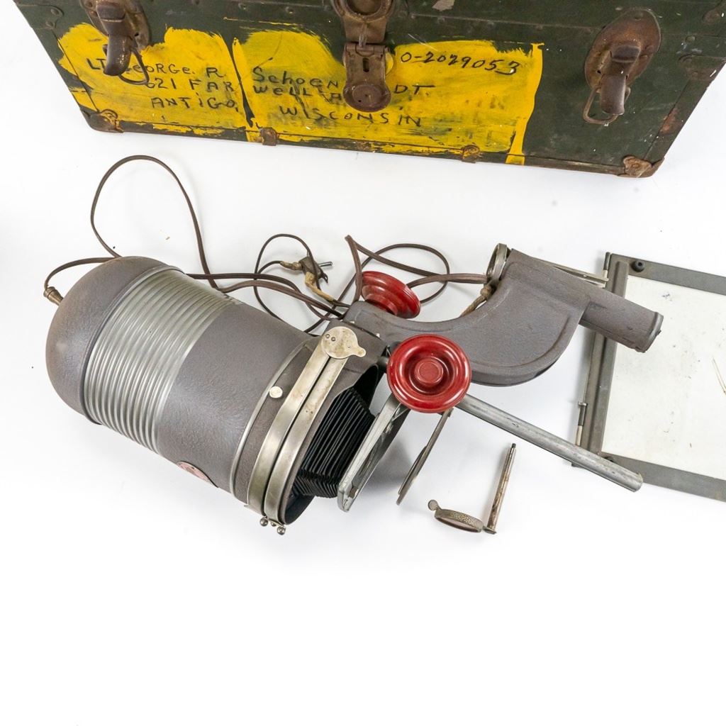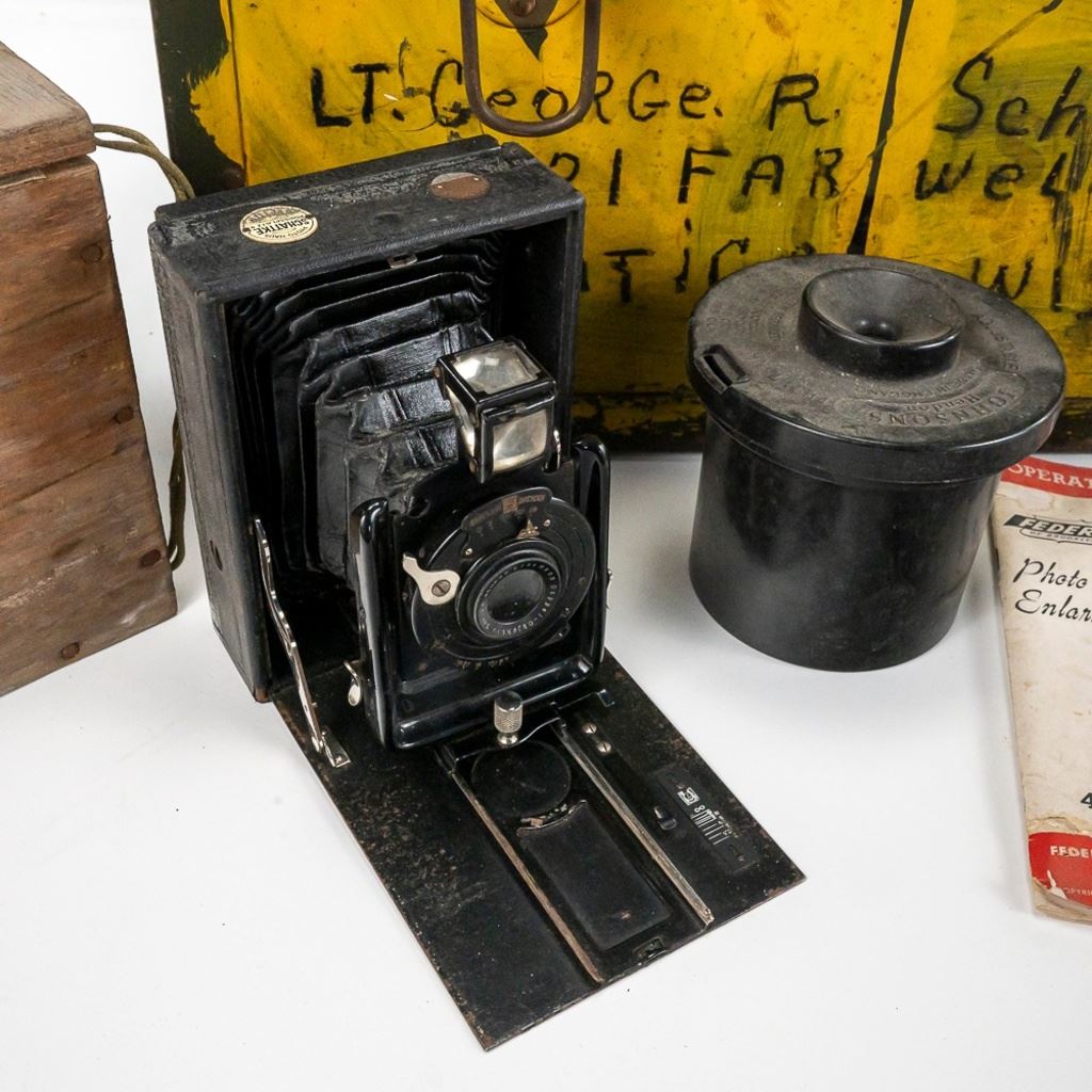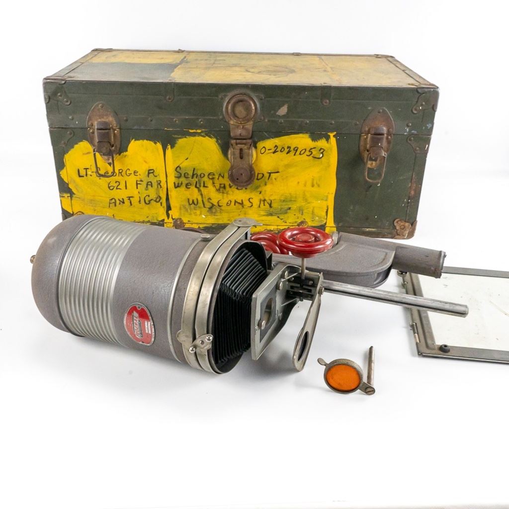 This lot belonged to WWII USAAF Pilot Lt. George Schoeenfeldt of Antigo, Wisconsin. It includes Schattke 4x6 plate camera which George bought in US Zone of Germany in 1945-46. Also included in his service trunk is a home made plate camera and his Federal Photo Enlarger with instructions, roll of muslin paper for photo drying, 2 tongs, measuring glass beaker and other various parts. His pilot Grouping is also in this auction.