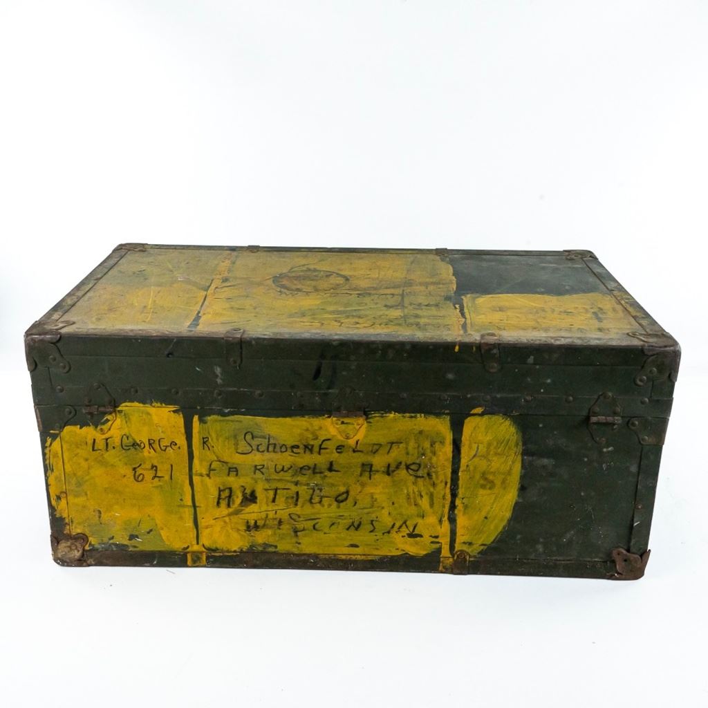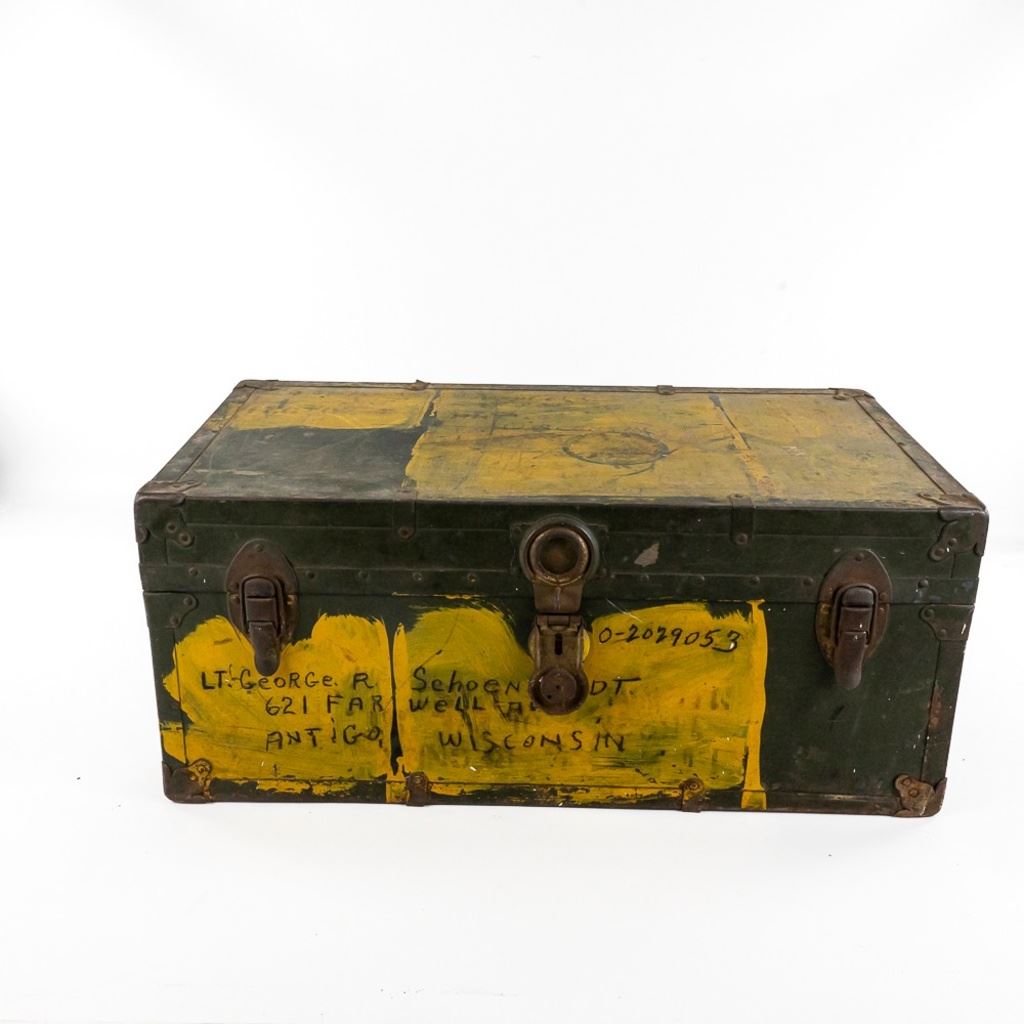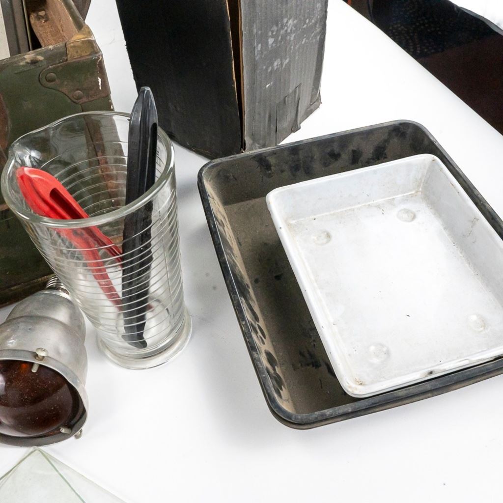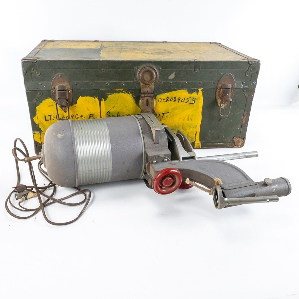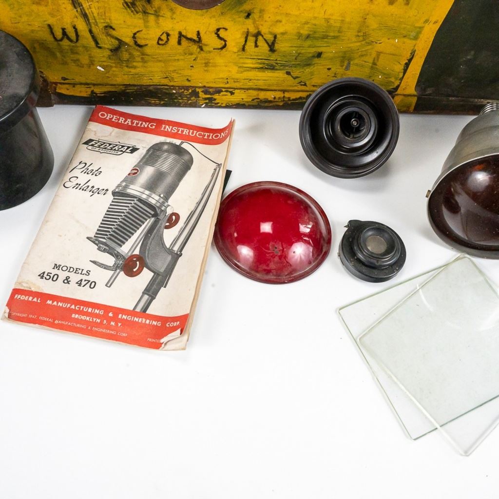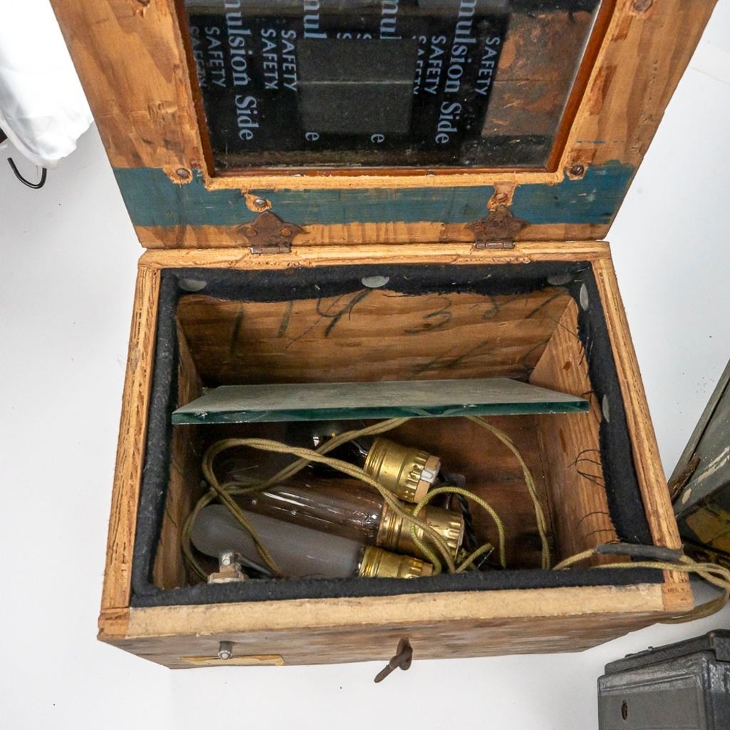 This lot belonged to WWII USAAF Pilot Lt. George Schoeenfeldt of Antigo, Wisconsin. It includes Schattke 4x6 plate camera which George bought in US Zone of Germany in 1945-46. Also included in his service trunk is a home made plate camera and his Federal Photo Enlarger with instructions, roll of muslin paper for photo drying, 2 tongs, measuring glass beaker and other various parts. His pilot Grouping is also in this auction.