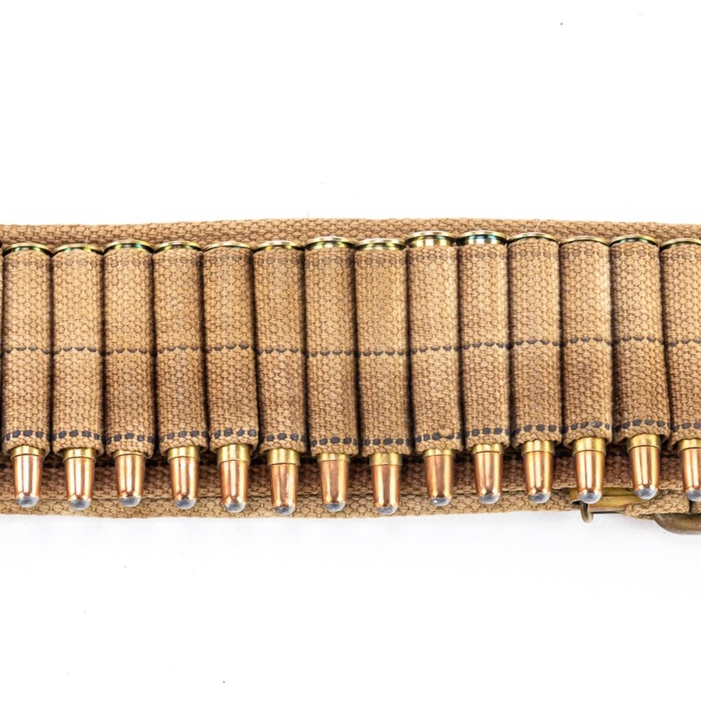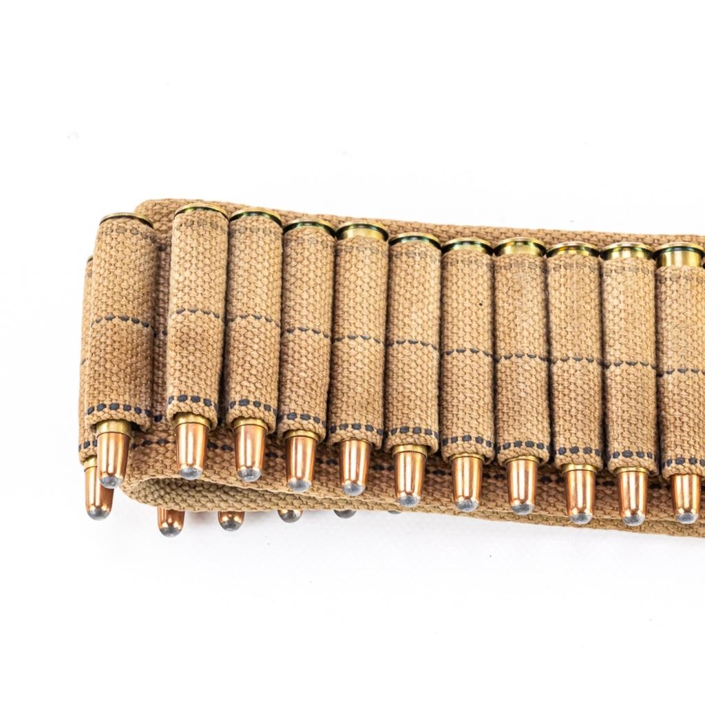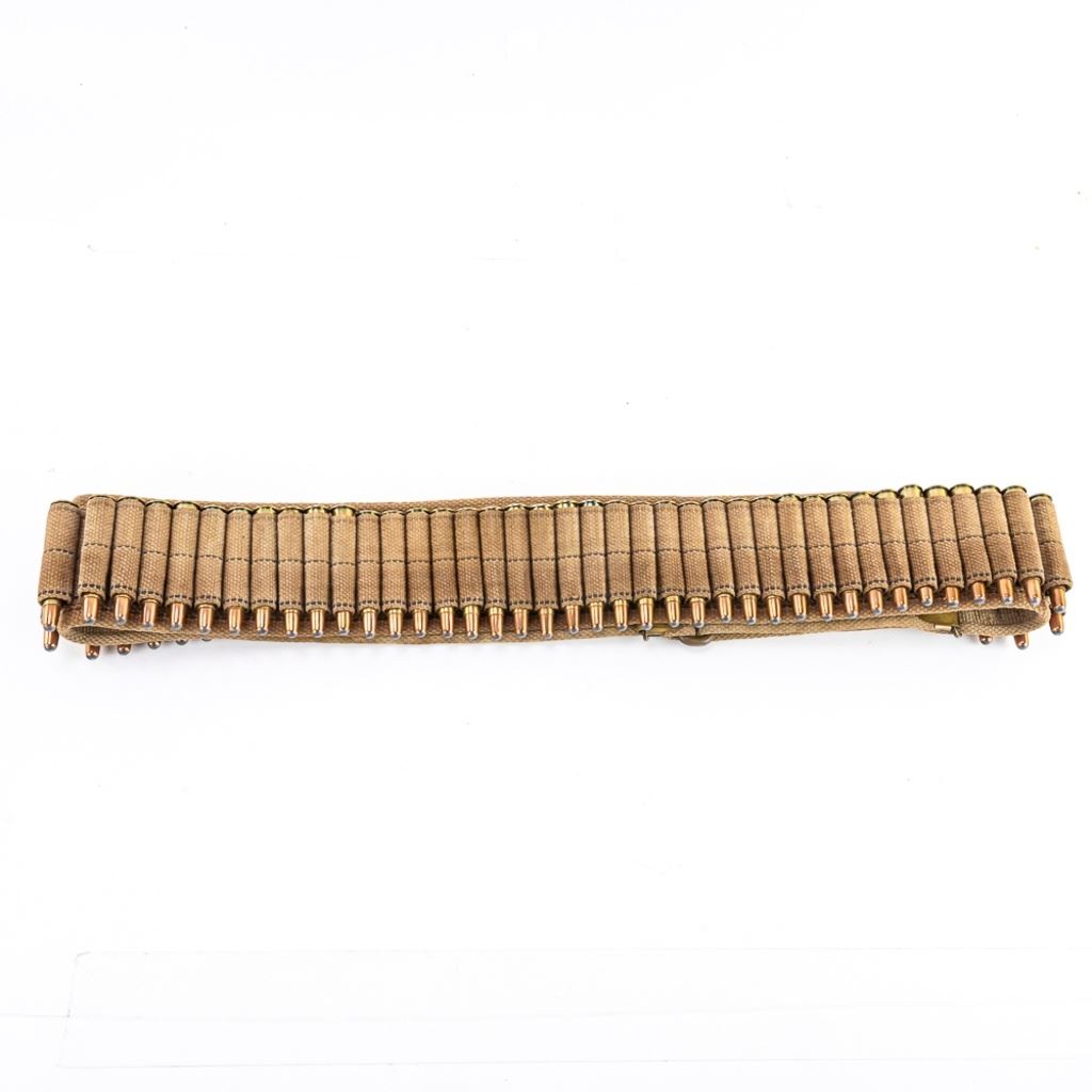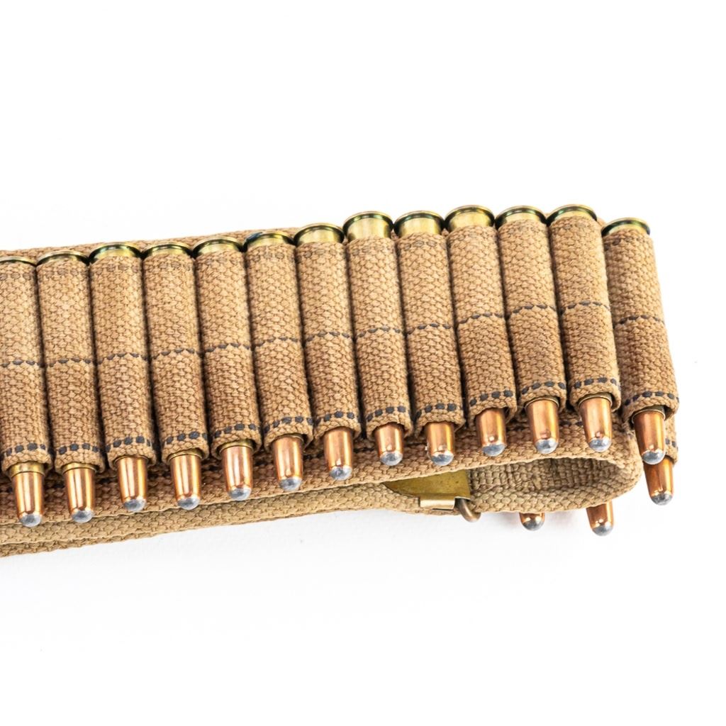 The period khaki web belt has 48 modern lead tipped DUMMY rounds 30-40 caliber Cartridges on it. Condition is very good.