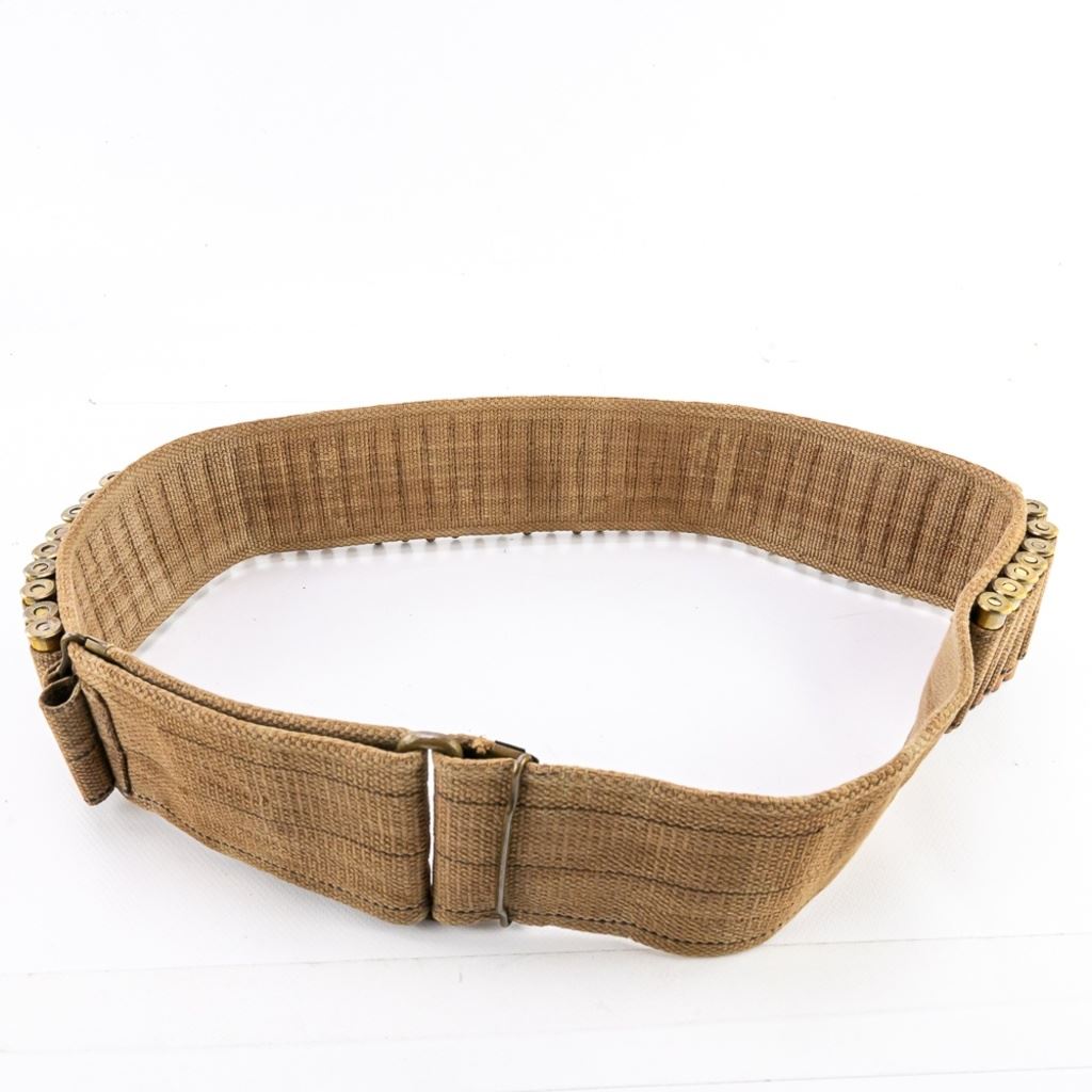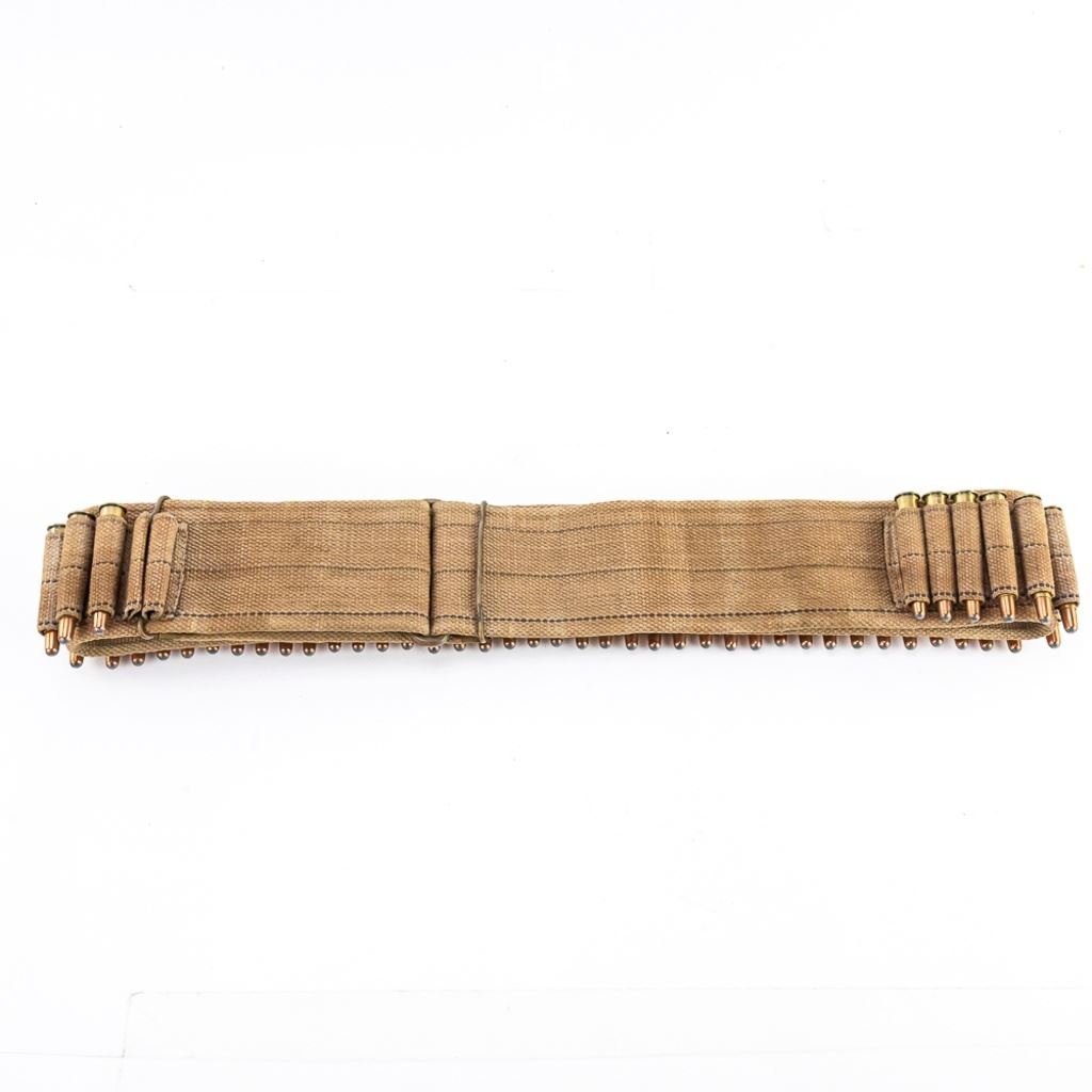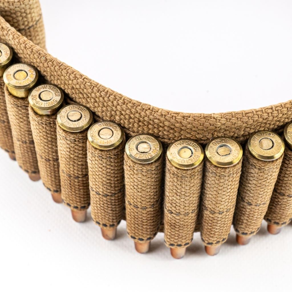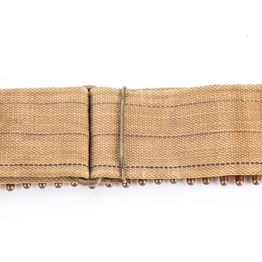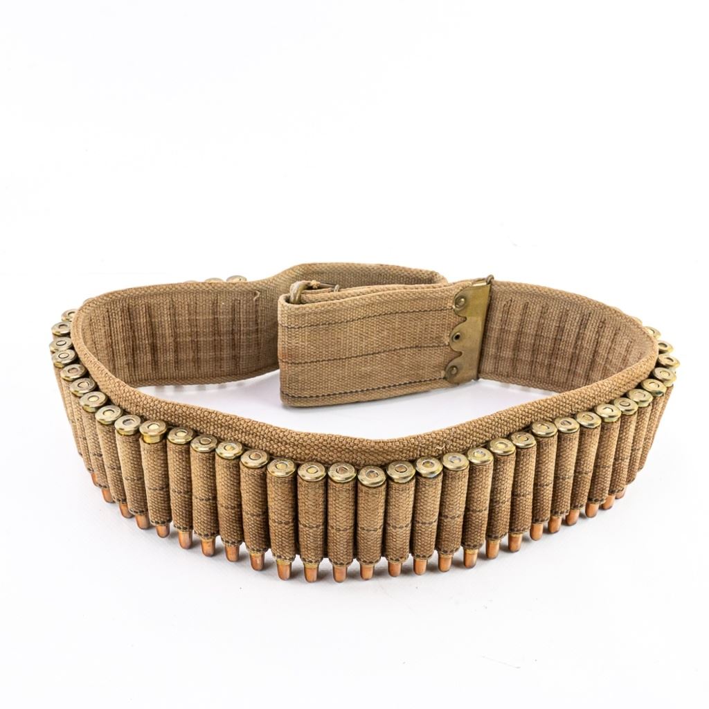 The period khaki web belt has 48 modern lead tipped DUMMY rounds 30-40 caliber Cartridges on it. Condition is very good.
