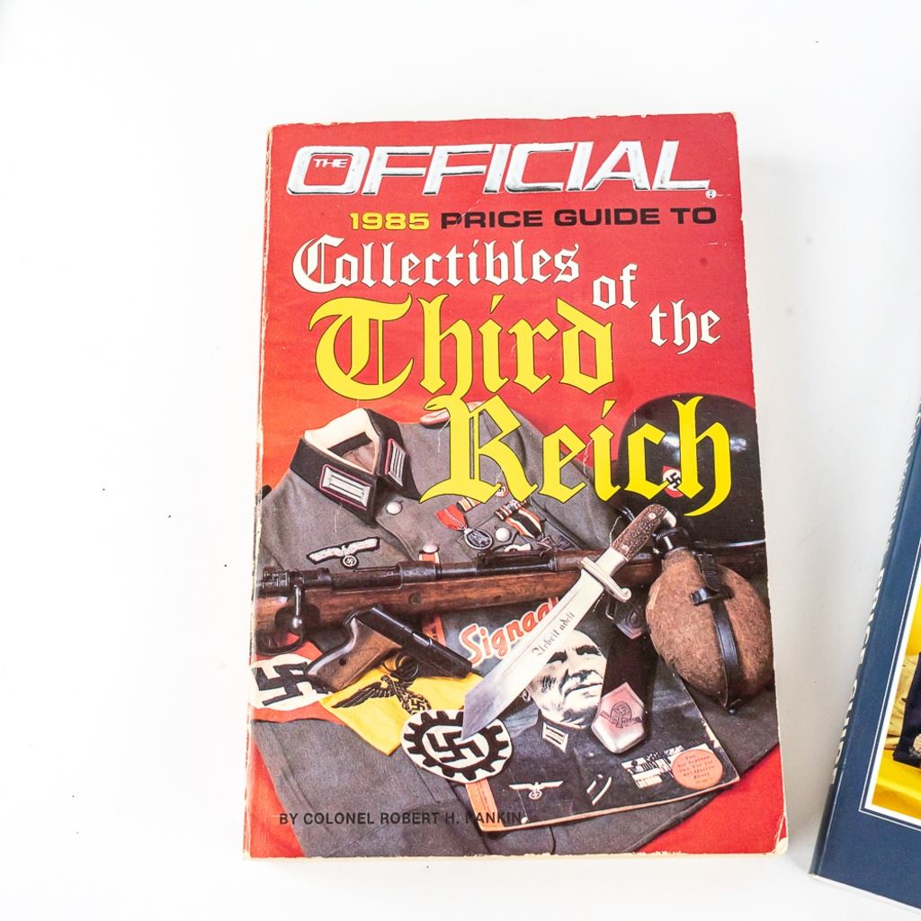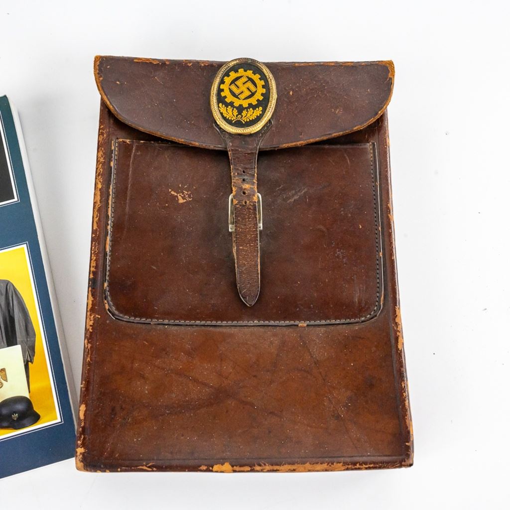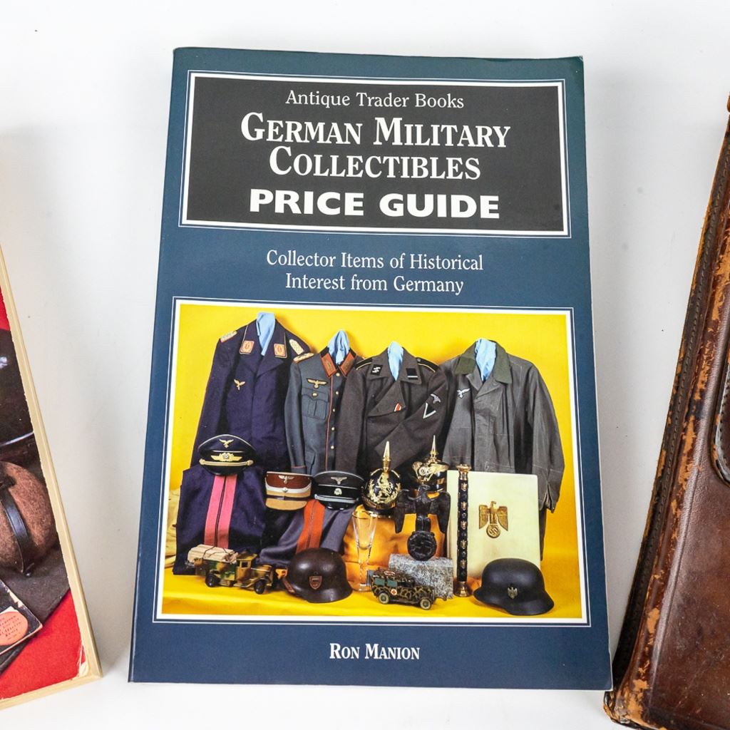 Lot of 5 includes 1) WWII era cigarette and lighter case. The attached jump badge may be post war. Marked with "Dawn" marker logo inside. 2) WWII German leather map case with DAF cap badge attached. Has one brown mechanic pencil under lid. Case shows wear and age. 3) Pair of WWII or later woman's dog tags and 4-5) Two price guide books on WWII German collecting.