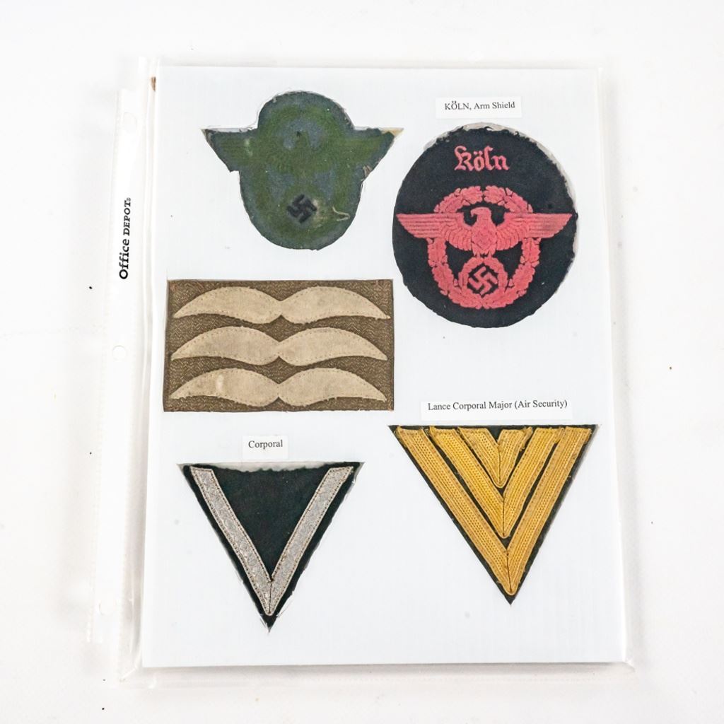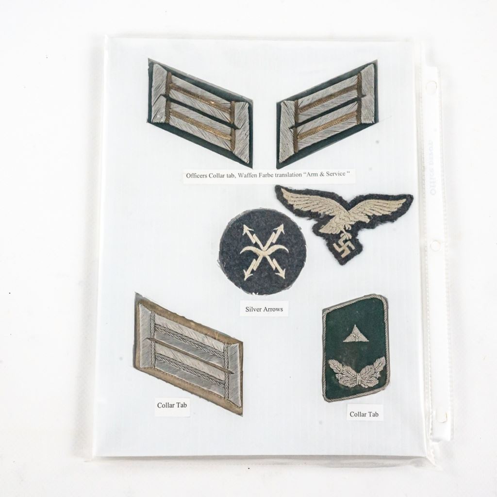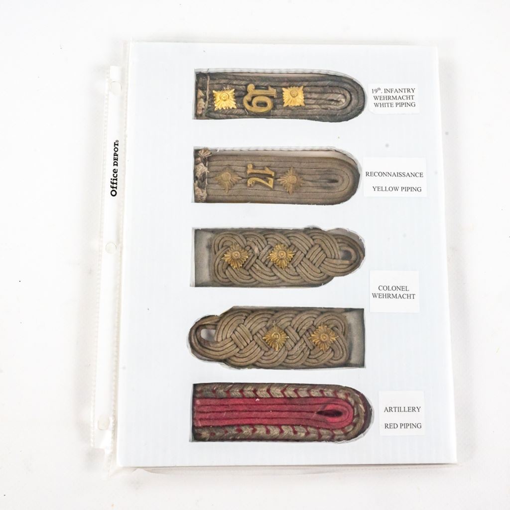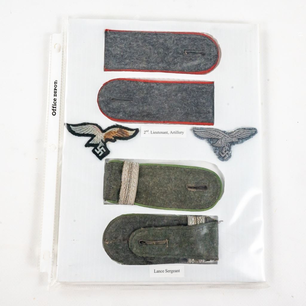 This album was made by the US Army Veteran Cpl. Joseph Brown over 20 years ago with 35 German insignia and two German banner flags he captured in Augsburg, Germany while with the Headquarters Battery 30th Field Artillery. There is Army, Luftwaffe and HJ shoulder boards, breast and cap eagles, Soviet shoulder boards and tab, fire/police insignia and much more. The two flag banners are double signed and 7"x13" and 17"x15". There is another captured group of German medals from same veteran in this auction.