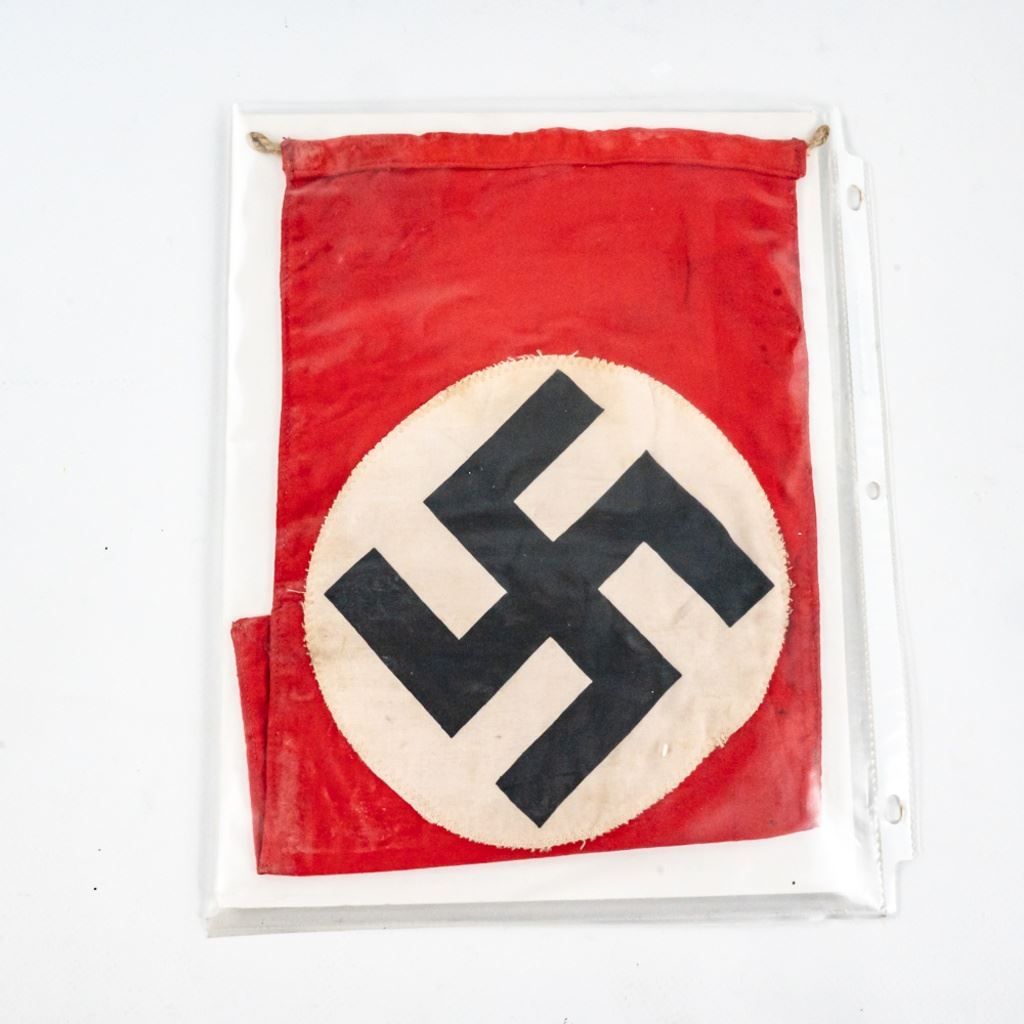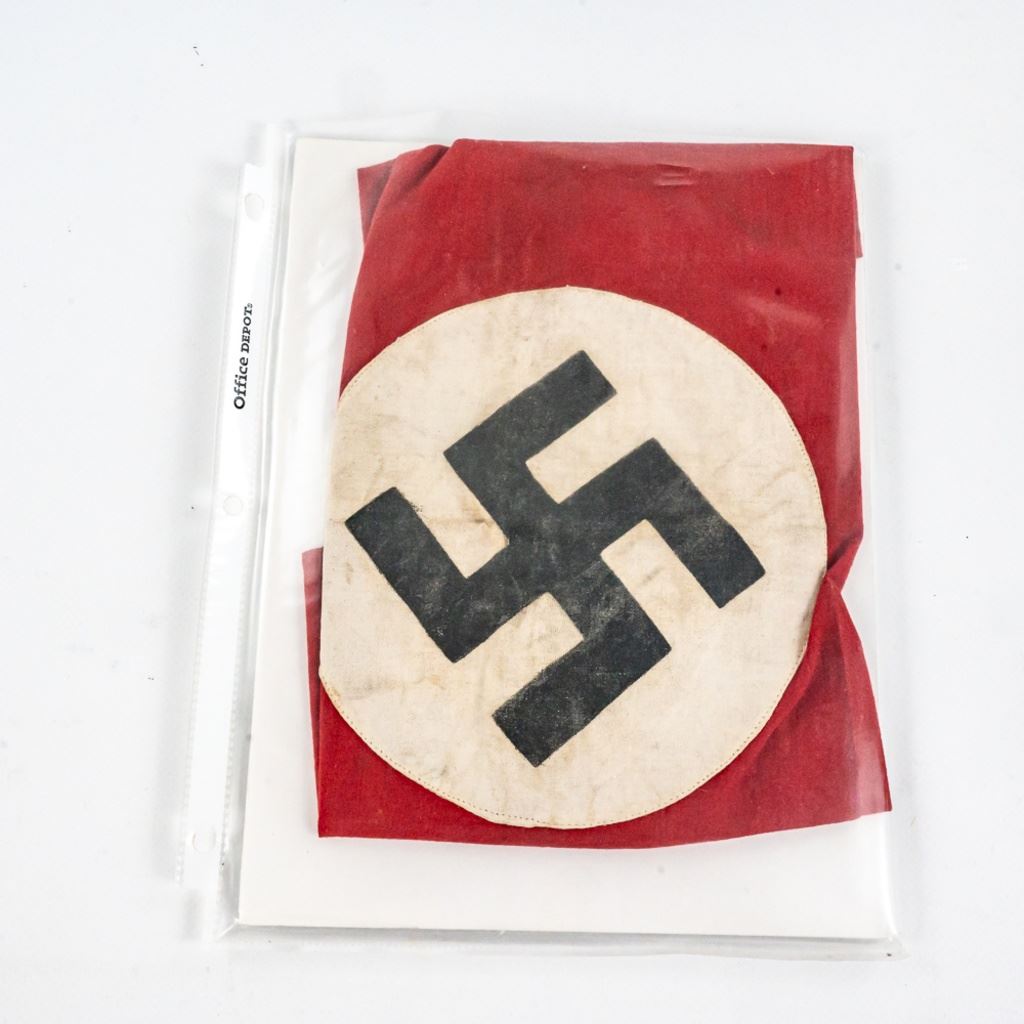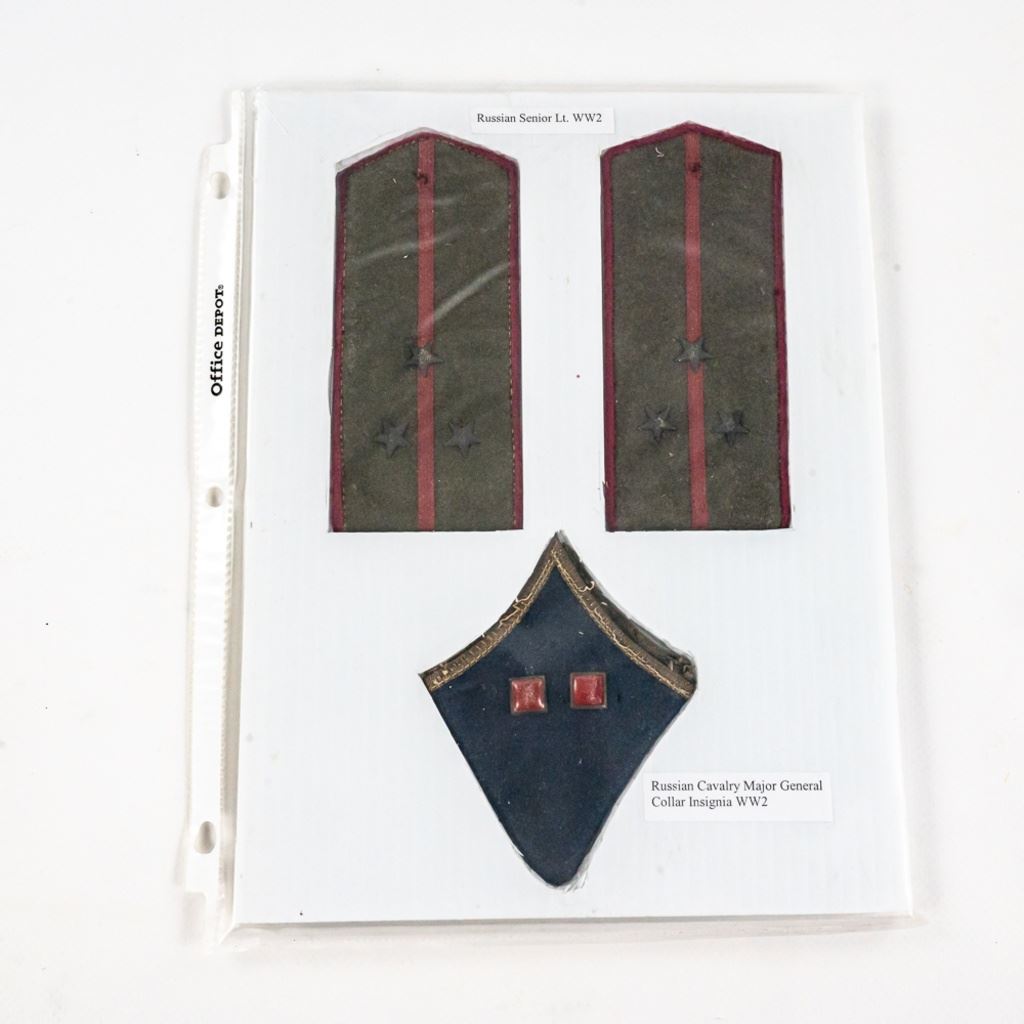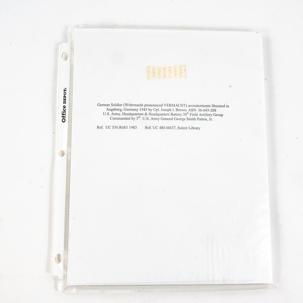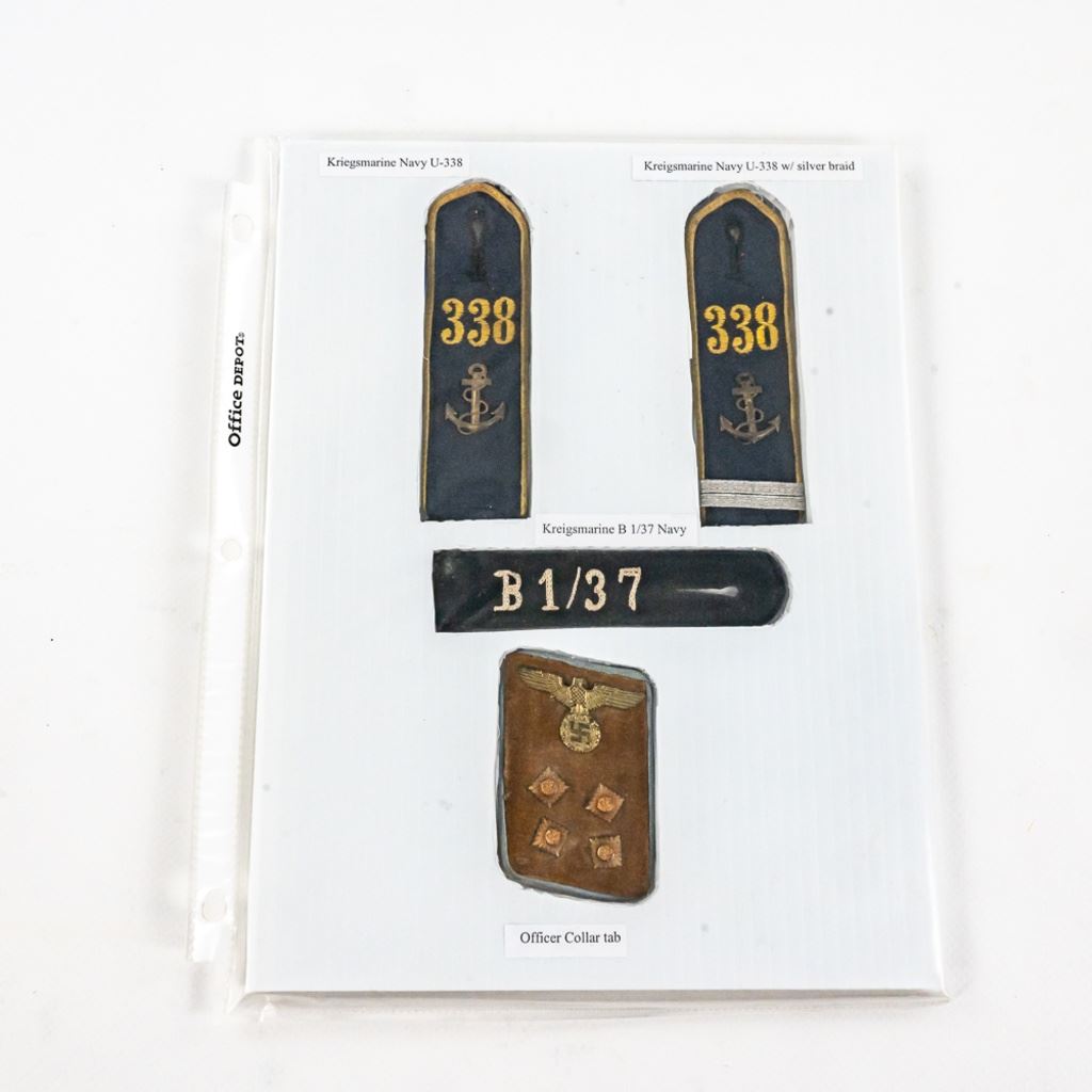 This album was made by the US Army Veteran Cpl. Joseph Brown over 20 years ago with 35 German insignia and two German banner flags he captured in Augsburg, Germany while with the Headquarters Battery 30th Field Artillery. There is Army, Luftwaffe and HJ shoulder boards, breast and cap eagles, Soviet shoulder boards and tab, fire/police insignia and much more. The two flag banners are double signed and 7"x13" and 17"x15". There is another captured group of German medals from same veteran in this auction.
