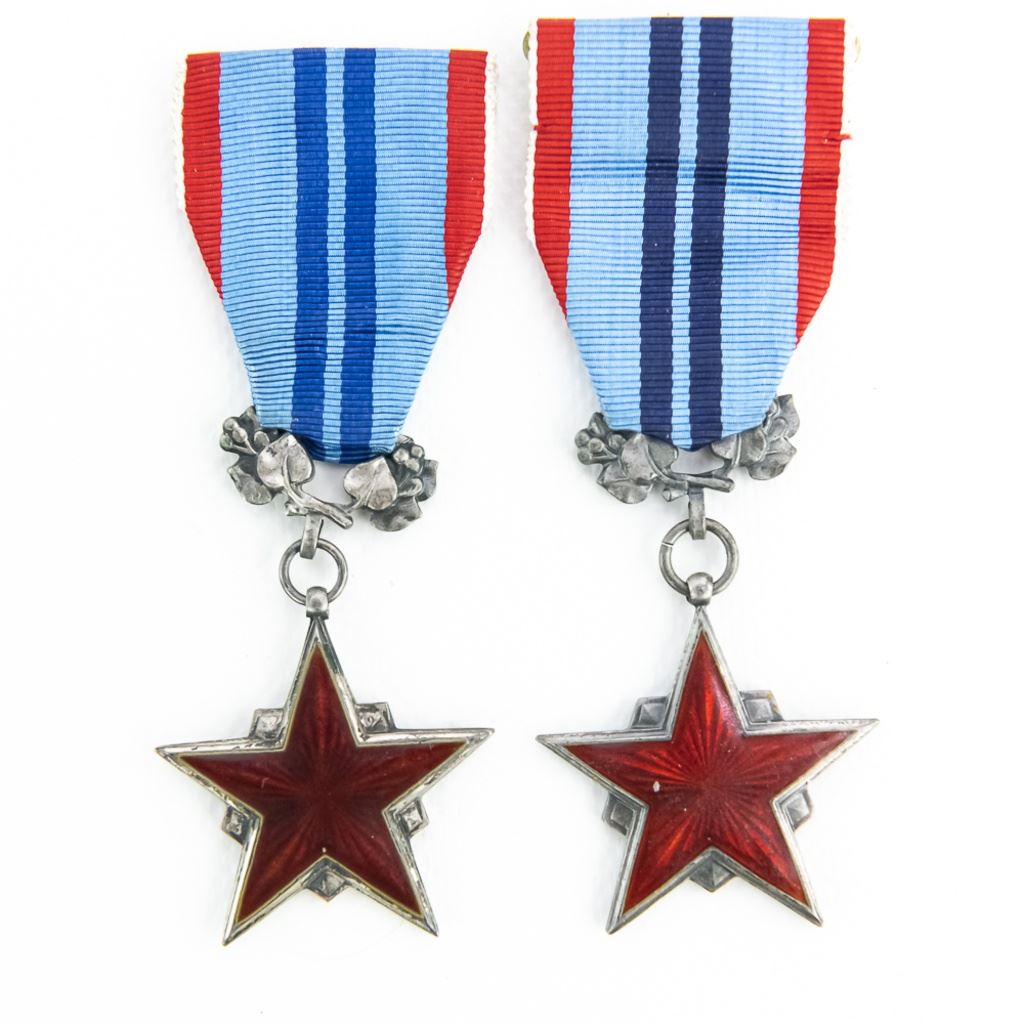 Lot of 4 CSSR and CSR medals include 1) CSSR Order of Red Star numbered 6187 with hallmarks "900" and Zukov, 2) Order of the Red Banner numbered 6067 with "900" and Zukov, 3) CSSR Order of the Red Star of Labor numbered 7387 and hallmarked 925 and Zukov proofs. 4) CSR Order of the Red Star of Labor numbered 0404 and hallmarked 900 and Zukov proofs. All four show age, wear and soiling to ribbons. Very rare set of numbered medals.