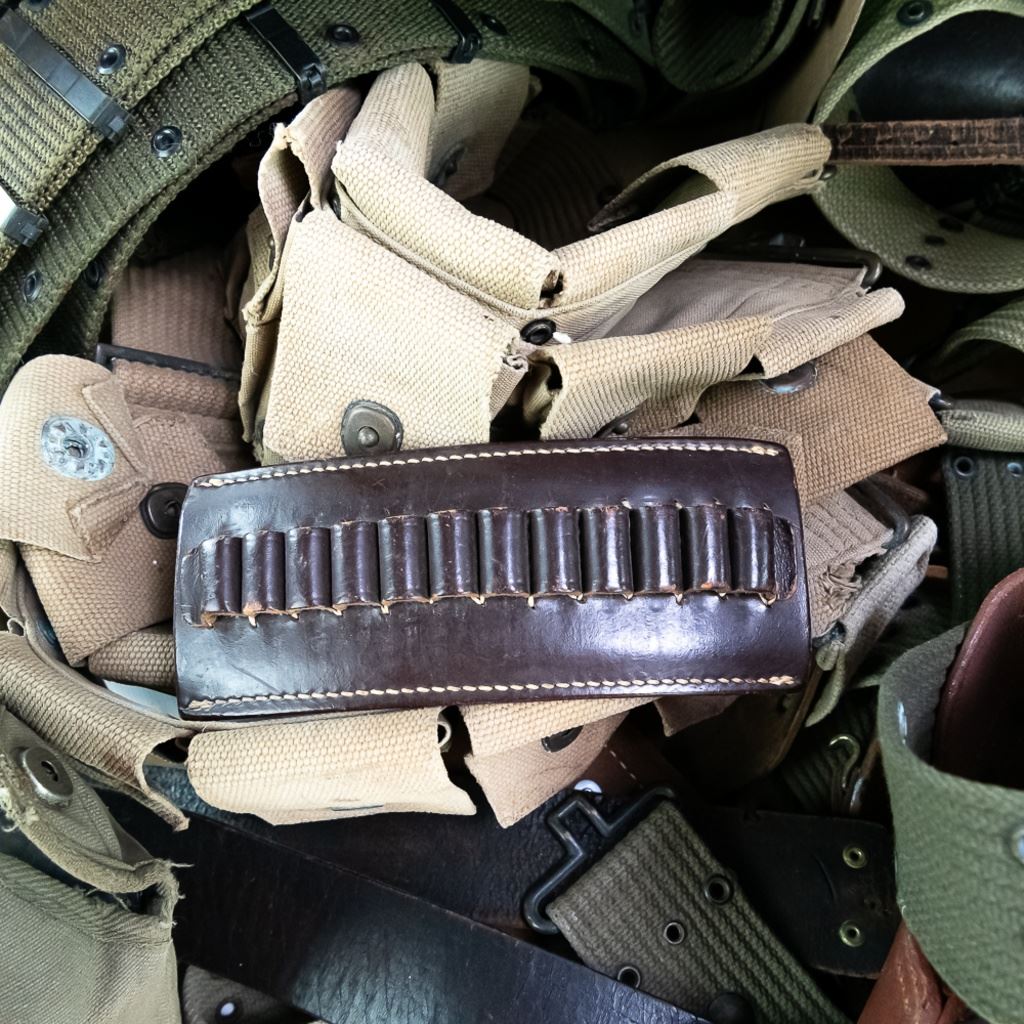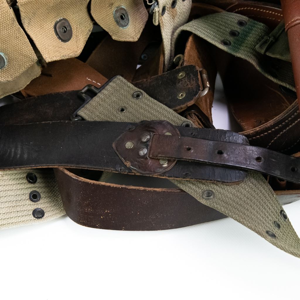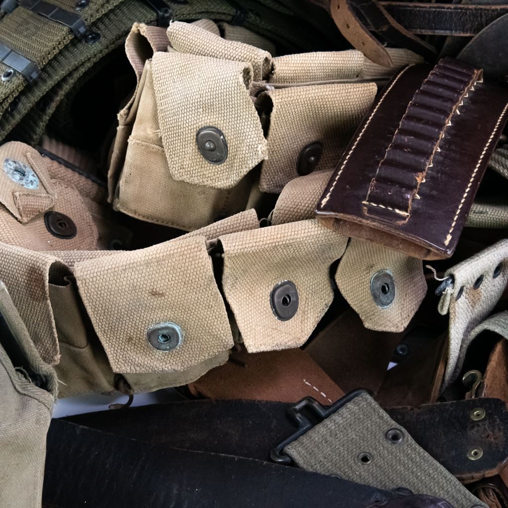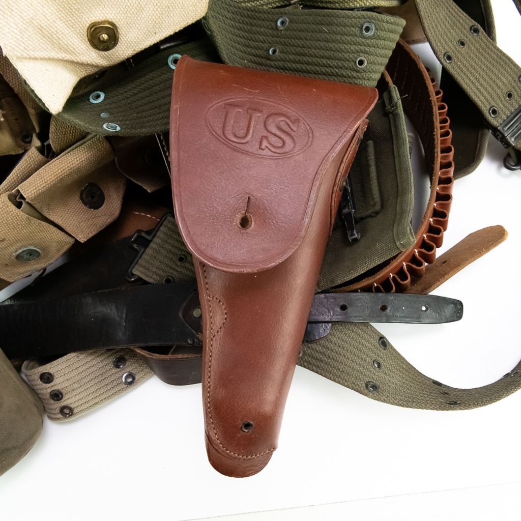 Includes 5 US web pistol belt with DSA tags, 2 pairs of WWI US leggings and one single legging. 2 pairs of US Khaki cartridge belts with faded ink stamps. WWII US pistol belt with 1943 Carlisle pouch and cleaning rod pouch. Modern pistol belt with modern 45 auto holster with white Carlisle pouch ) 1944 canteen and cup, US Vietnam era pouch and pistol belt ) 7" leather 38 cal. 12 pistol round pad, Oklahoma Leather 44/45 Cal Western pistol belt size 34-39, WWII Marine uniform waist belt with no buckle, 19th Century western belt, Heiser cowboy holster belt (small). commercial camping US pistol belt.