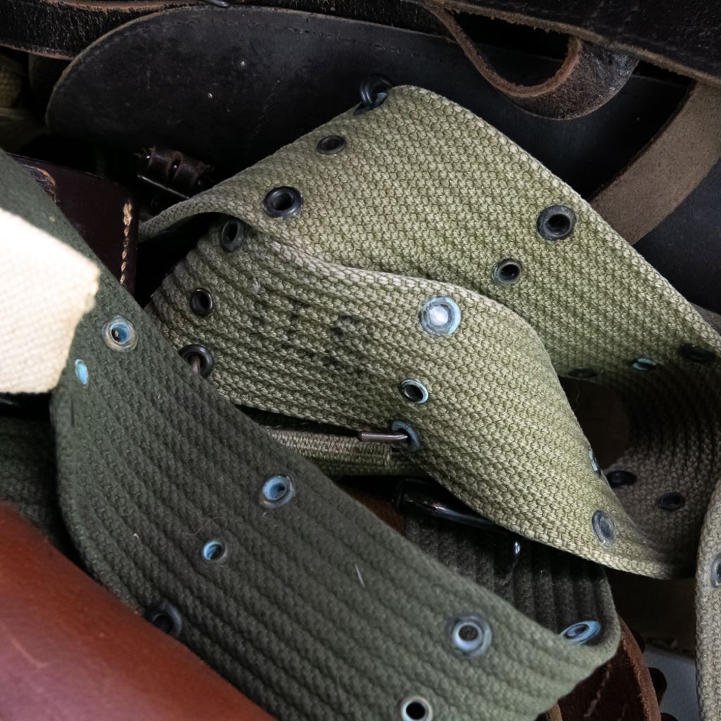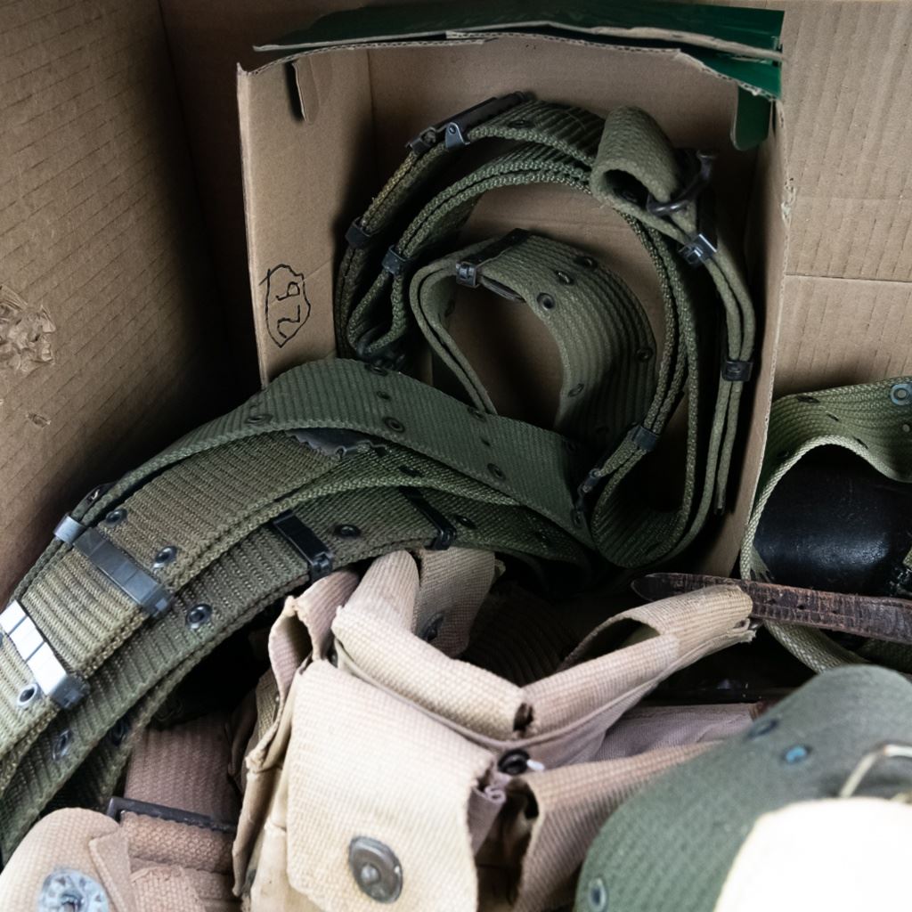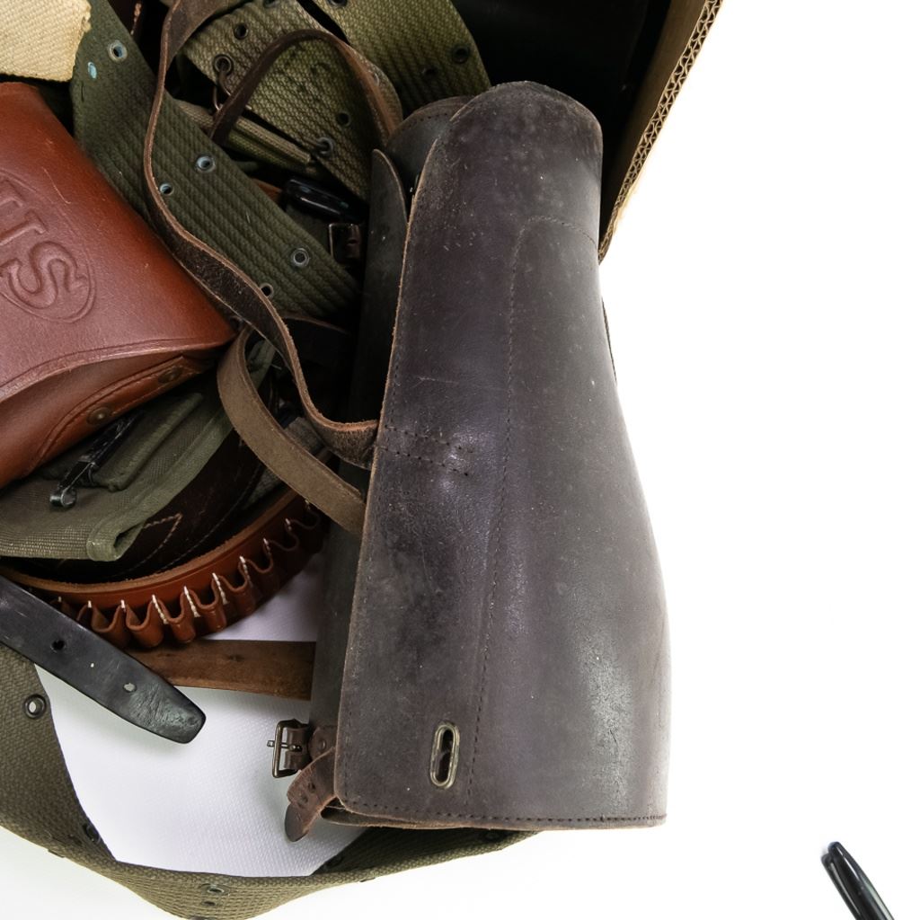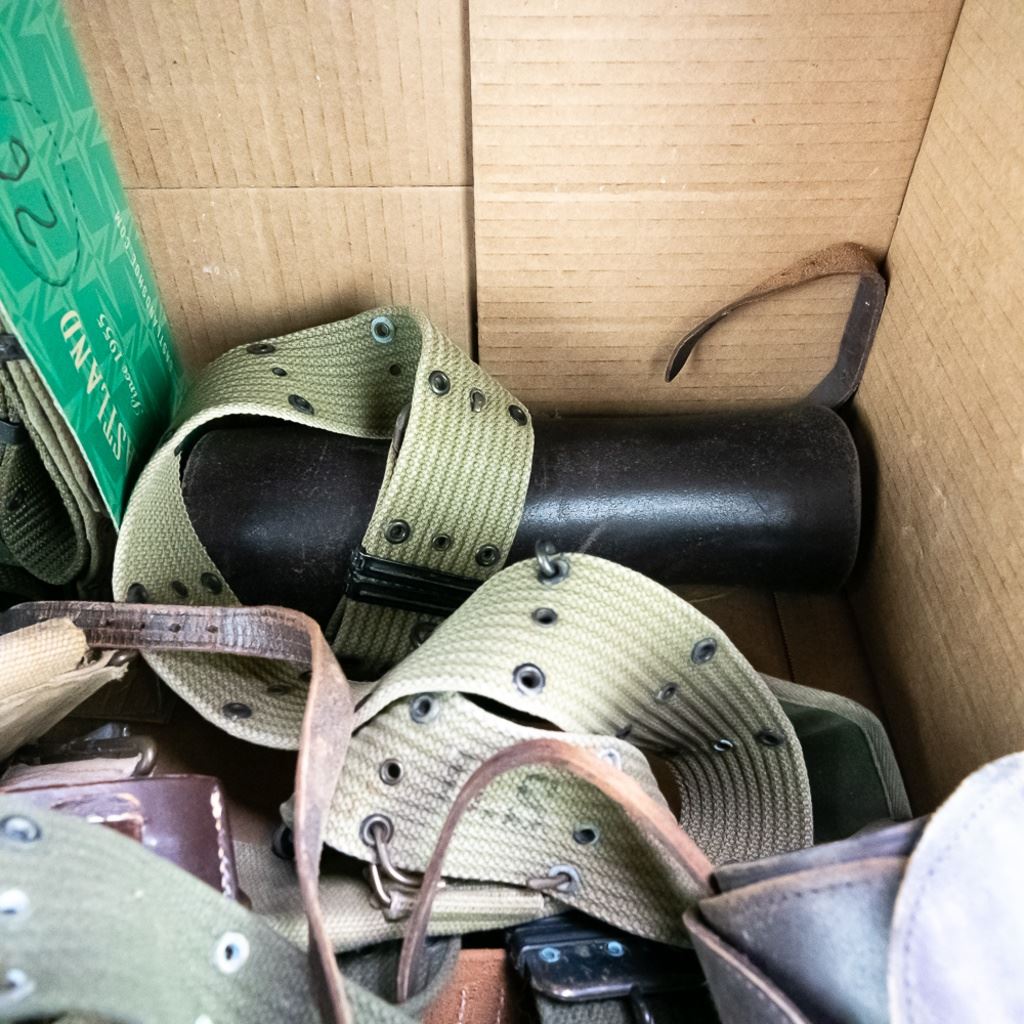 Includes 5 US web pistol belt with DSA tags, 2 pairs of WWI US leggings and one single legging. 2 pairs of US Khaki cartridge belts with faded ink stamps. WWII US pistol belt with 1943 Carlisle pouch and cleaning rod pouch. Modern pistol belt with modern 45 auto holster with white Carlisle pouch ) 1944 canteen and cup, US Vietnam era pouch and pistol belt ) 7" leather 38 cal. 12 pistol round pad, Oklahoma Leather 44/45 Cal Western pistol belt size 34-39, WWII Marine uniform waist belt with no buckle, 19th Century western belt, Heiser cowboy holster belt (small). commercial camping US pistol belt.