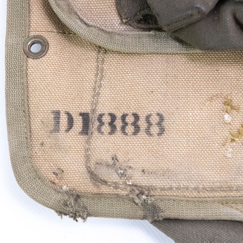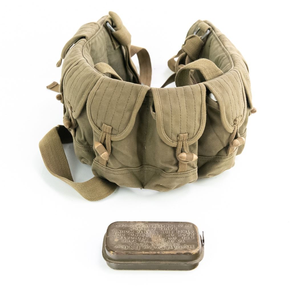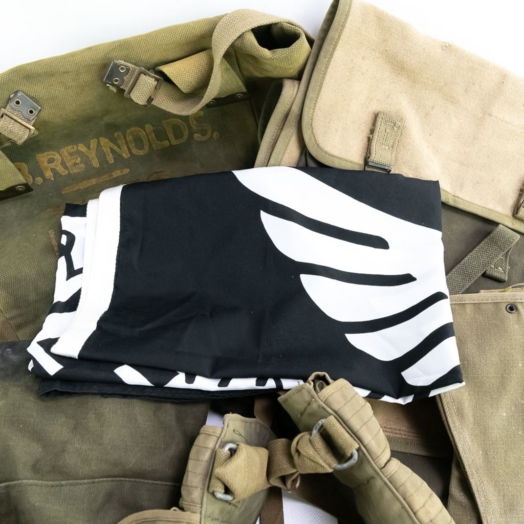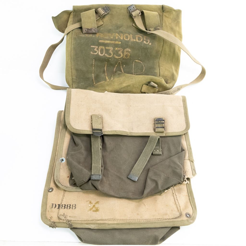 Large group includes 2 German contemporary flags, 2 duffel bags (WWII and 1958). 1944 date British musette bag named and marked LIAP (Leave In Addition Python) for North Africa. Old brass US Carlisle bandage, 2 pairs of WWII US leggings 2R and 3R. Chinese 7.62mm ammo bandoleer. WWII US two-tone jeep/motorcycle tool saddle bag set with corner damage. All have a musty smell.