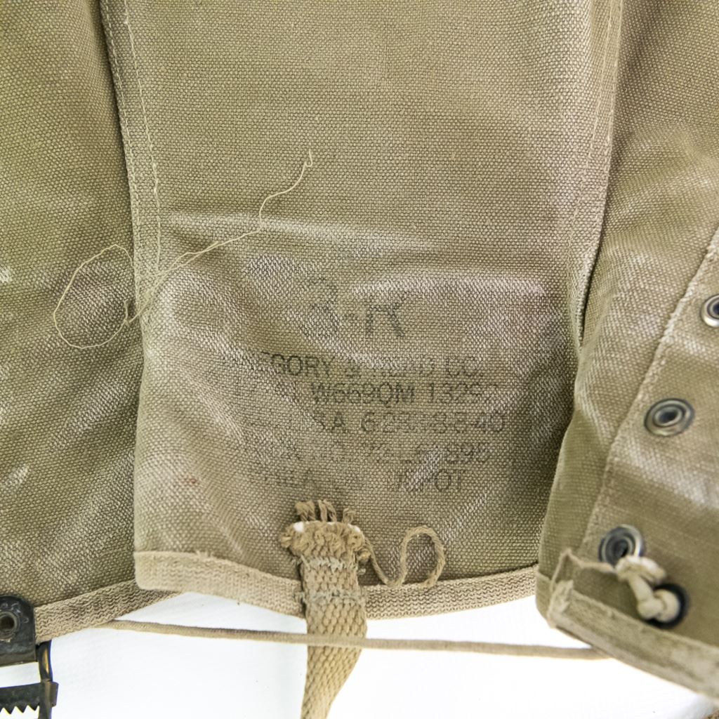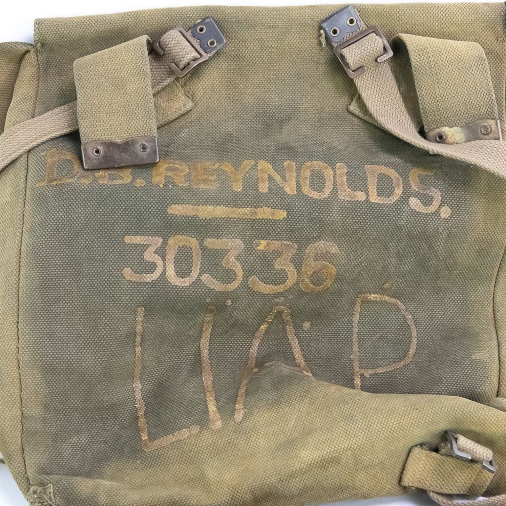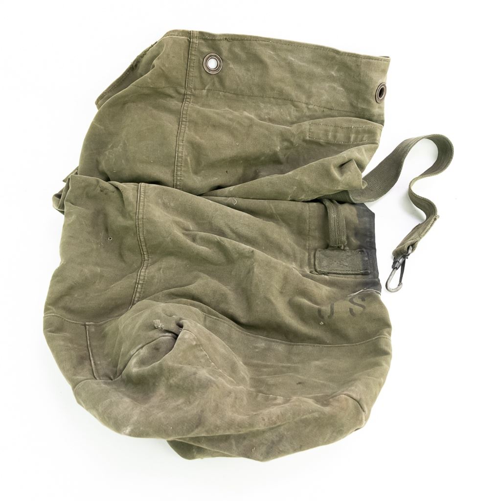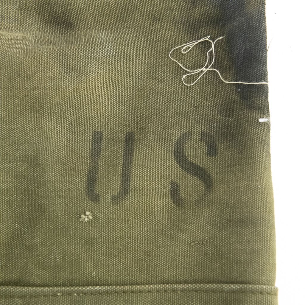 Large group includes 2 German contemporary flags, 2 duffel bags (WWII and 1958). 1944 date British musette bag named and marked LIAP (Leave In Addition Python) for North Africa. Old brass US Carlisle bandage, 2 pairs of WWII US leggings 2R and 3R. Chinese 7.62mm ammo bandoleer. WWII US two-tone jeep/motorcycle tool saddle bag set with corner damage. All have a musty smell.