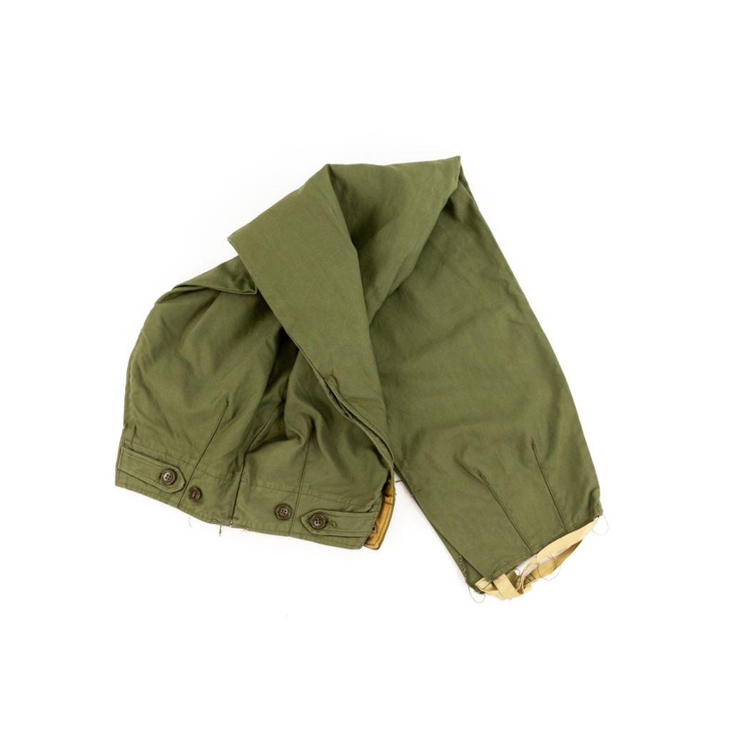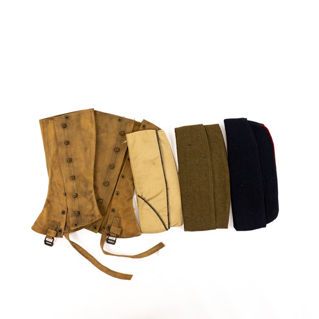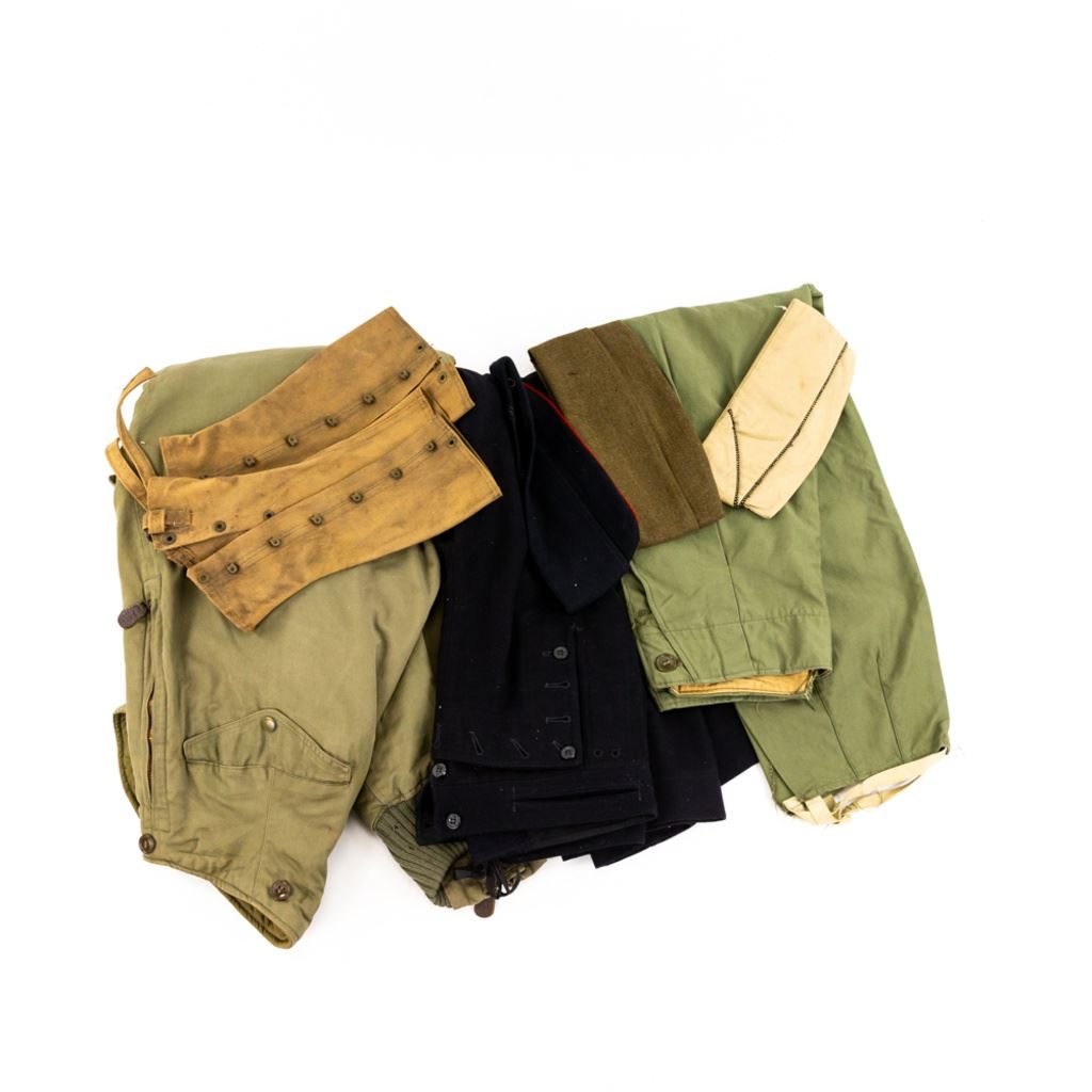 This WWII US lot includes 1) US Army Was Service trousers with size tag 16R and washed out spec tag and in very good condition. 2) US Navy wool bell bottoms with small waist and 28" inseam in excellent condition. 3-4-5) French blue overseas cap, US wool 1950 7 /18" overseas cap and US Khaki officer's overseas cap. 6)Pair of size 1 pre-WWI leggings with ink stamps. 7) USAAF Type A-11 flight trousers waist size 32 in good condition.
