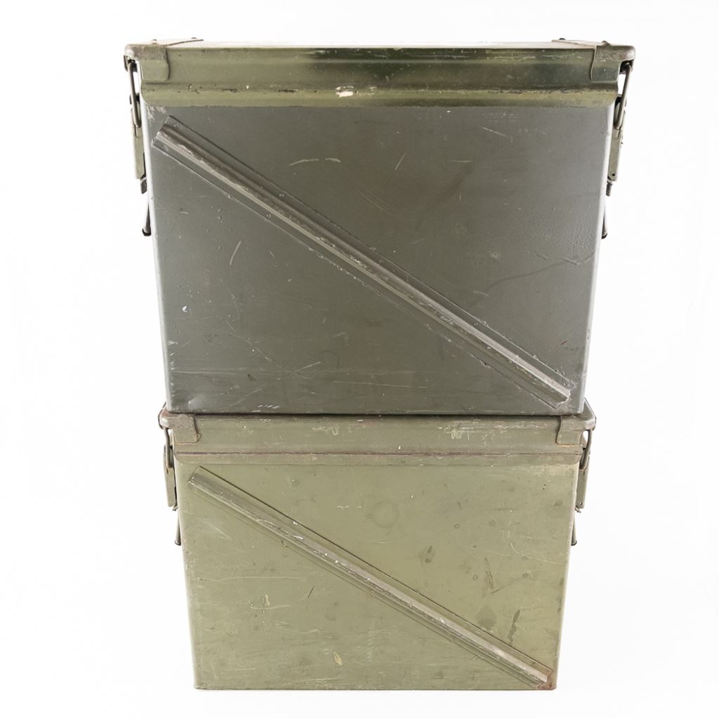 Cal./Size: 17 ½-inches wide, 14 ½-inches high and 7 ½-inches deep Color: Green with white markings Manufacturer: Unknown Country of Origin: United States. Large ammunition can used for such things as 20mm rounds, among others.