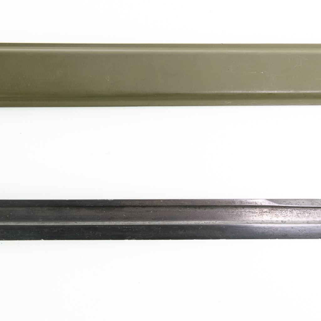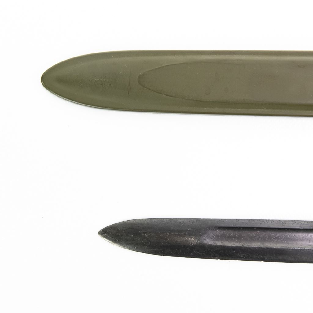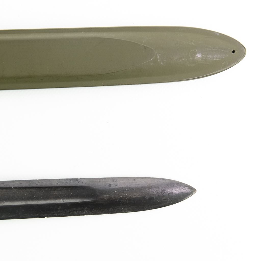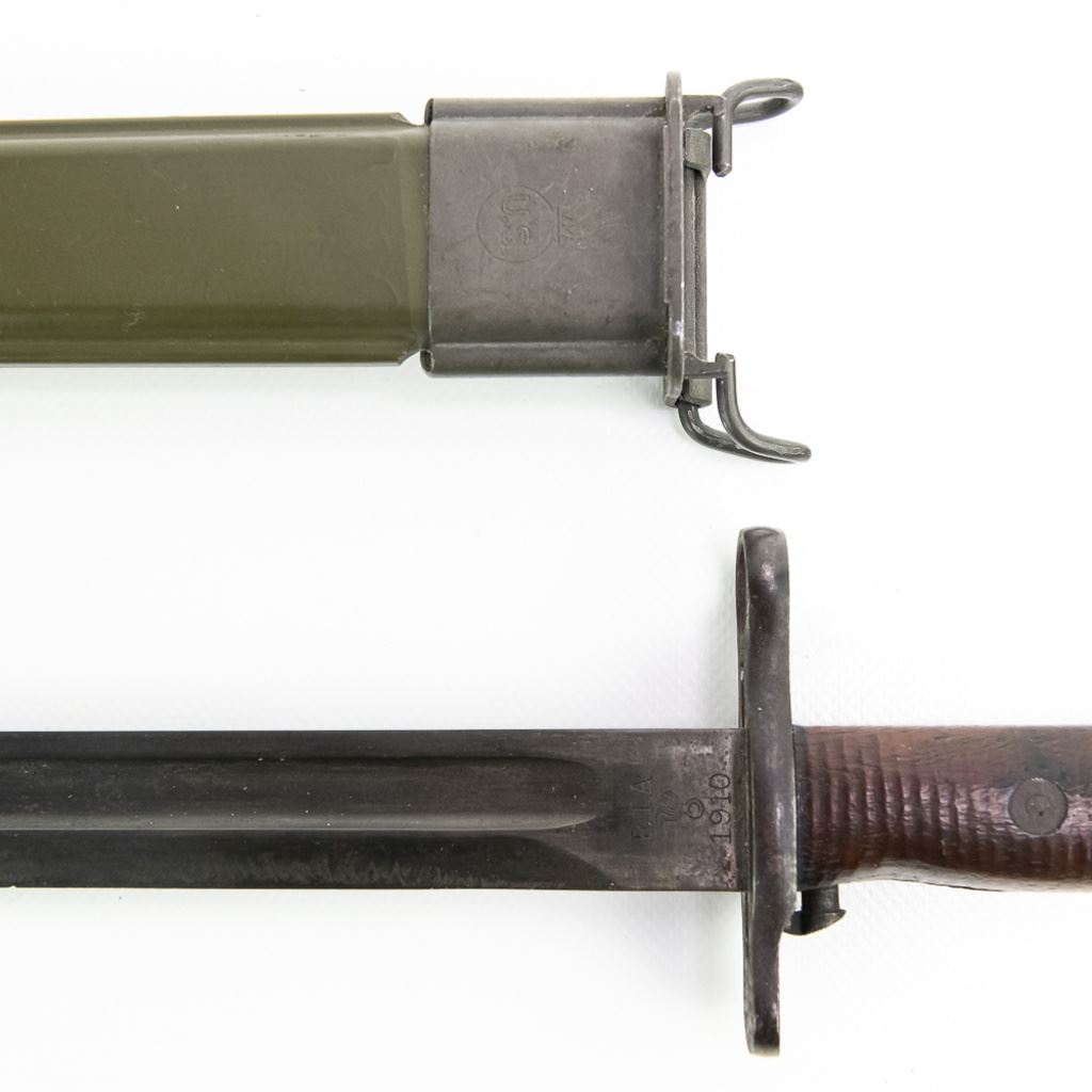 Bayonet is dated 1910 and has serial number 184309. Blade is clean with minor pitting and light nicks to blade. Grips has no chips or cracks and grips have bit of looseness to them. Scabbard is extra nice WWII type.