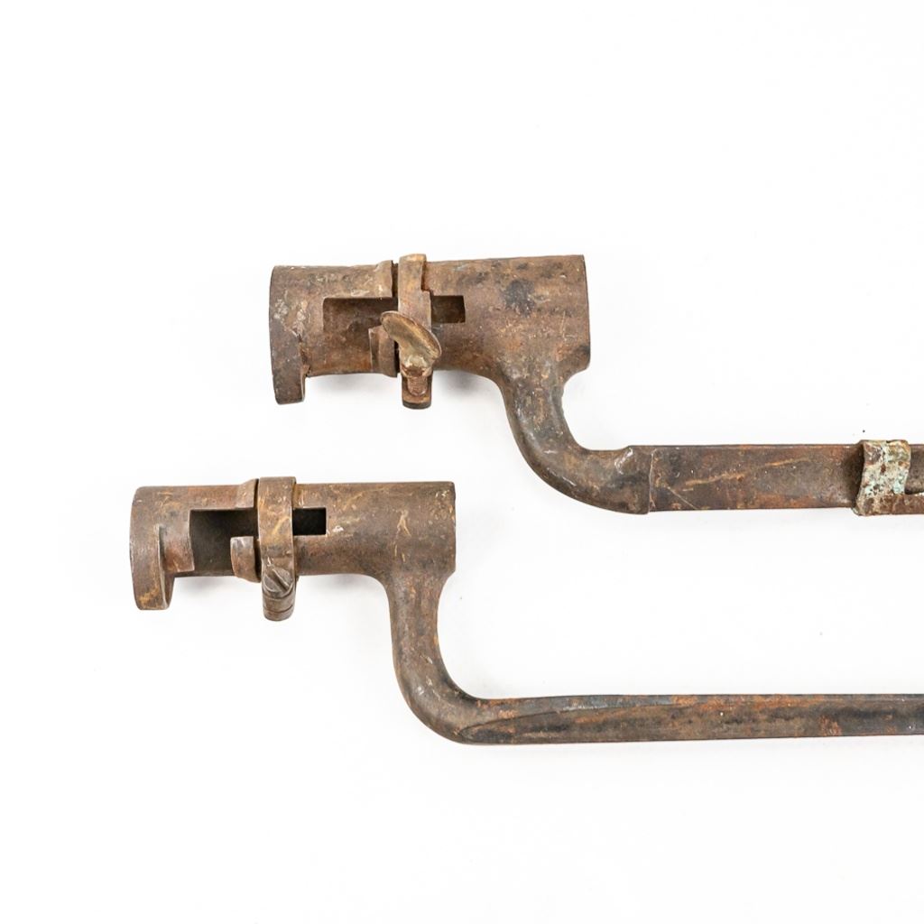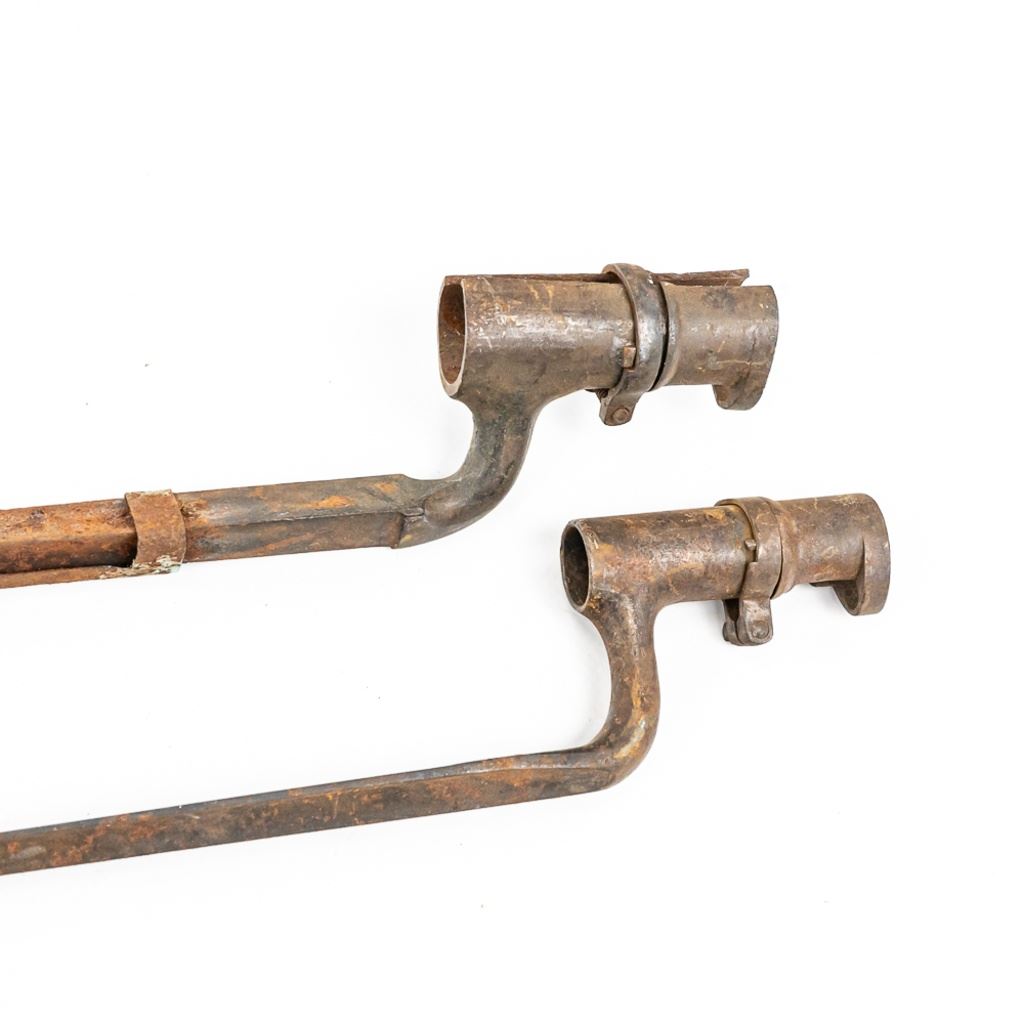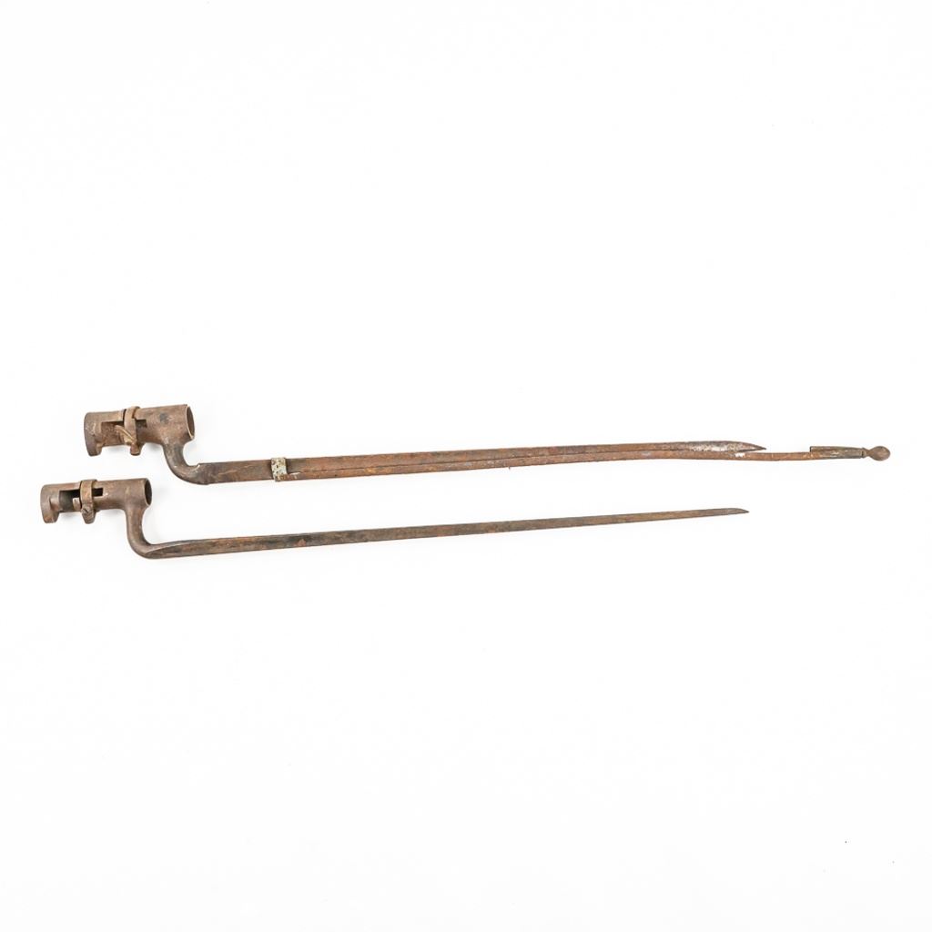 This lot of 2 includes 1 US trapdoor bayonet and unknown larger caliber socket bayonet 17.25" blade with overall length of 20.75" with training guard for practice. Both are in rusted condition.