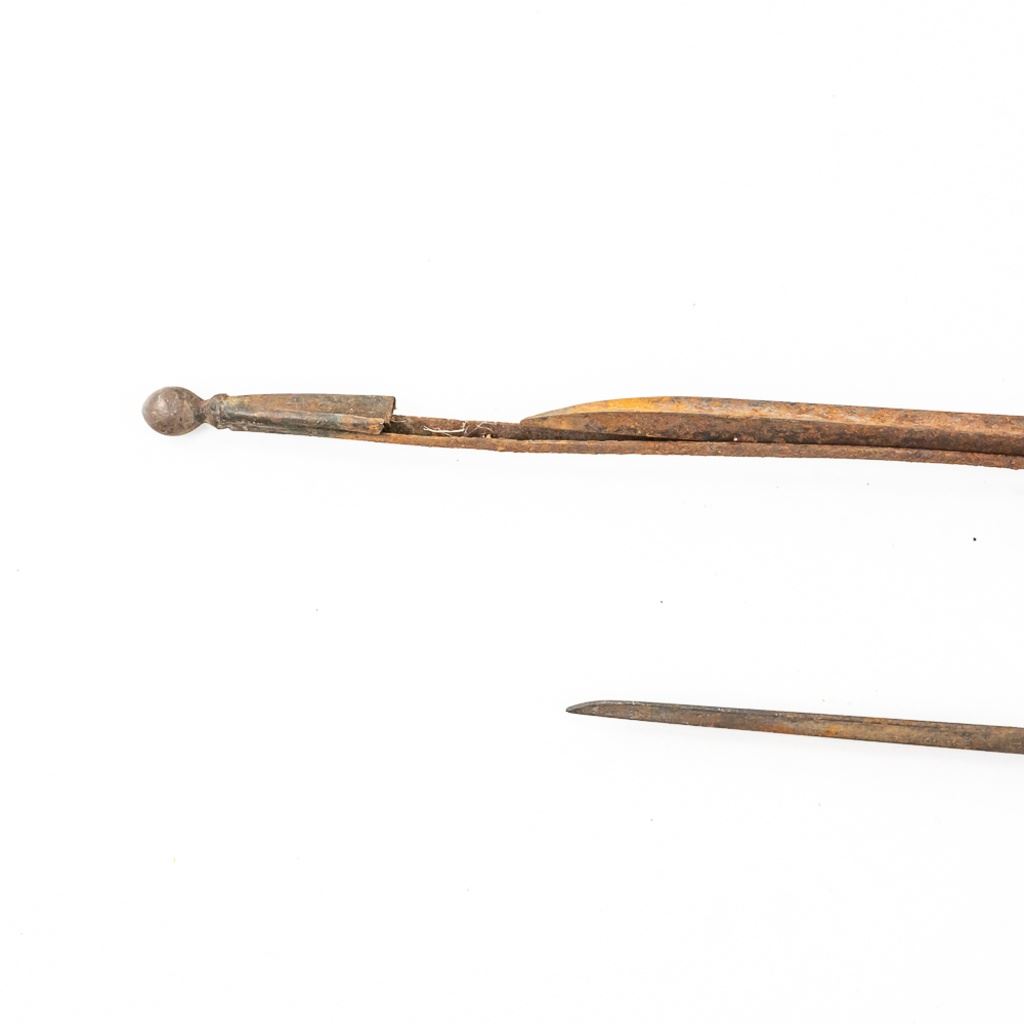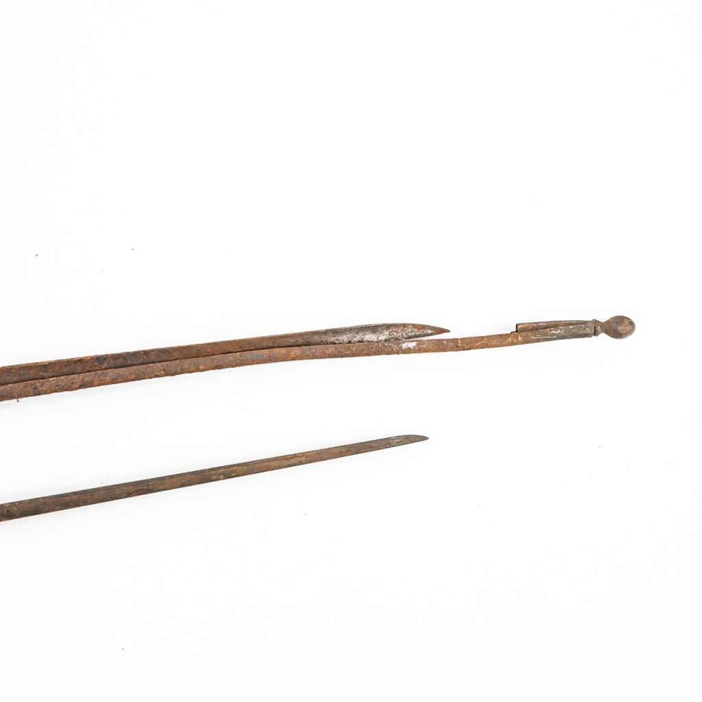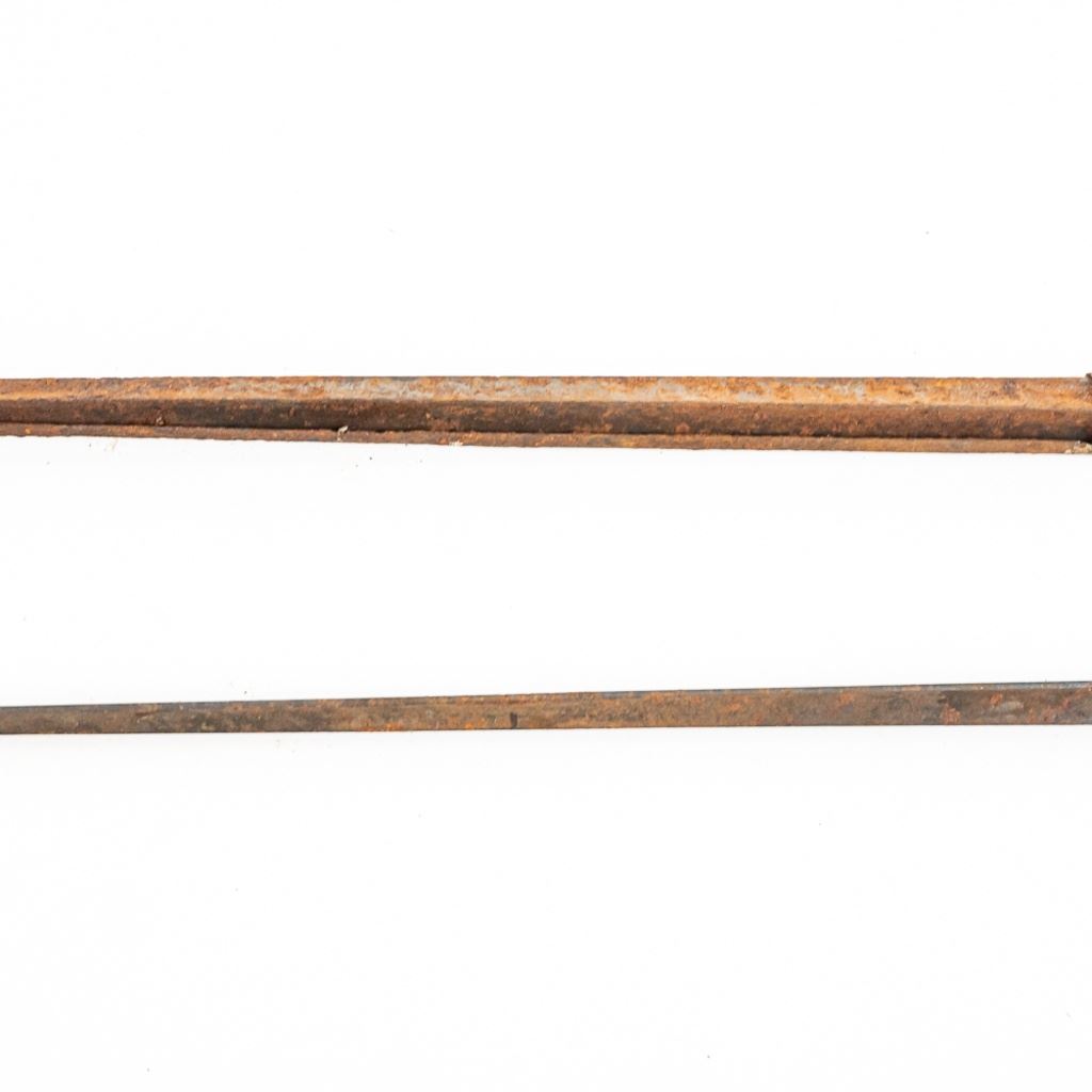 This lot of 2 includes 1 US trapdoor bayonet and unknown larger caliber socket bayonet 17.25" blade with overall length of 20.75" with training guard for practice. Both are in rusted condition.