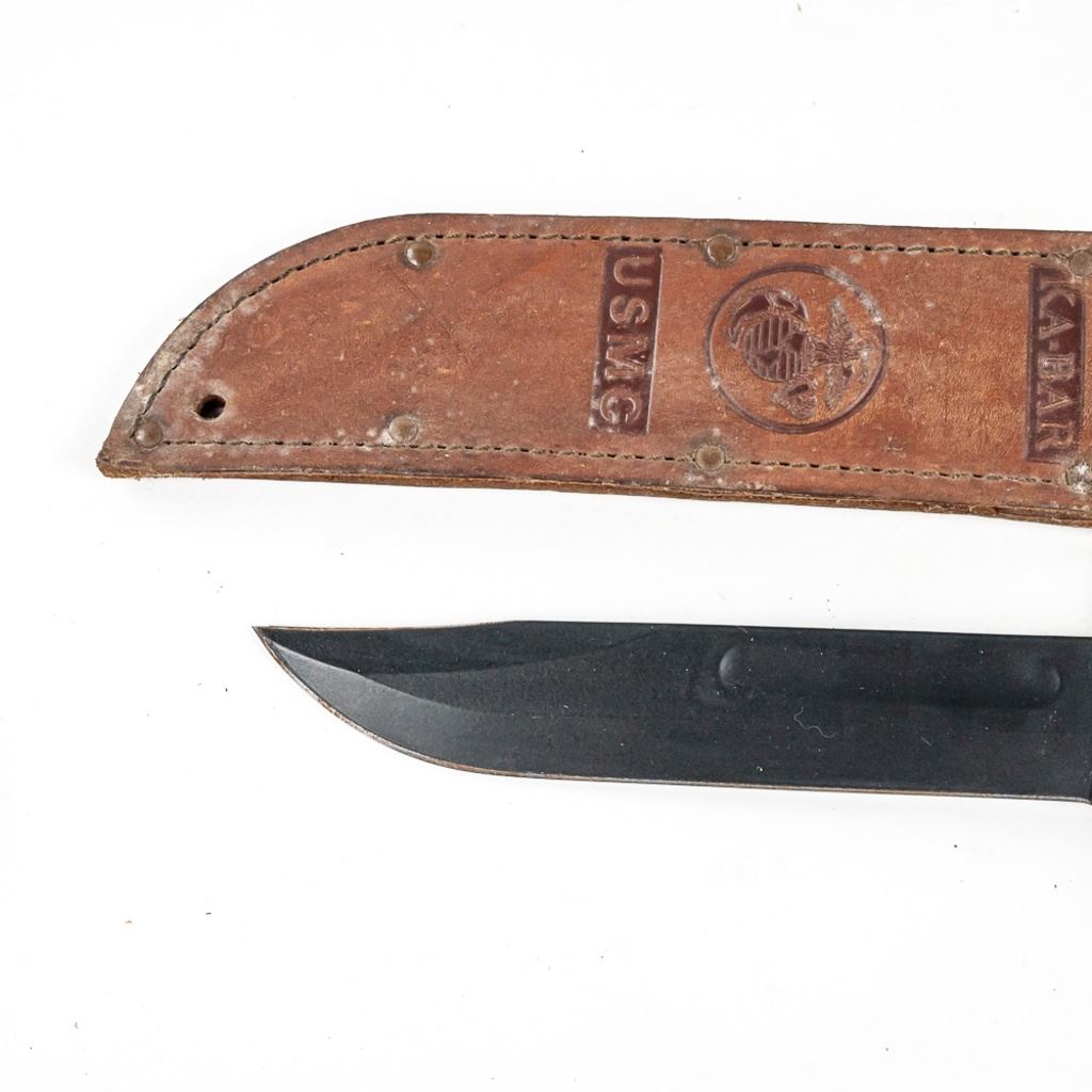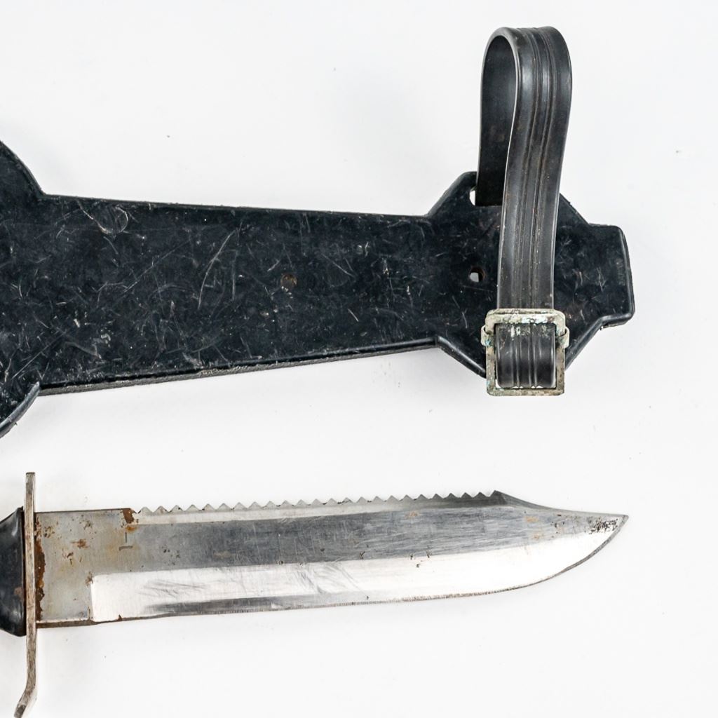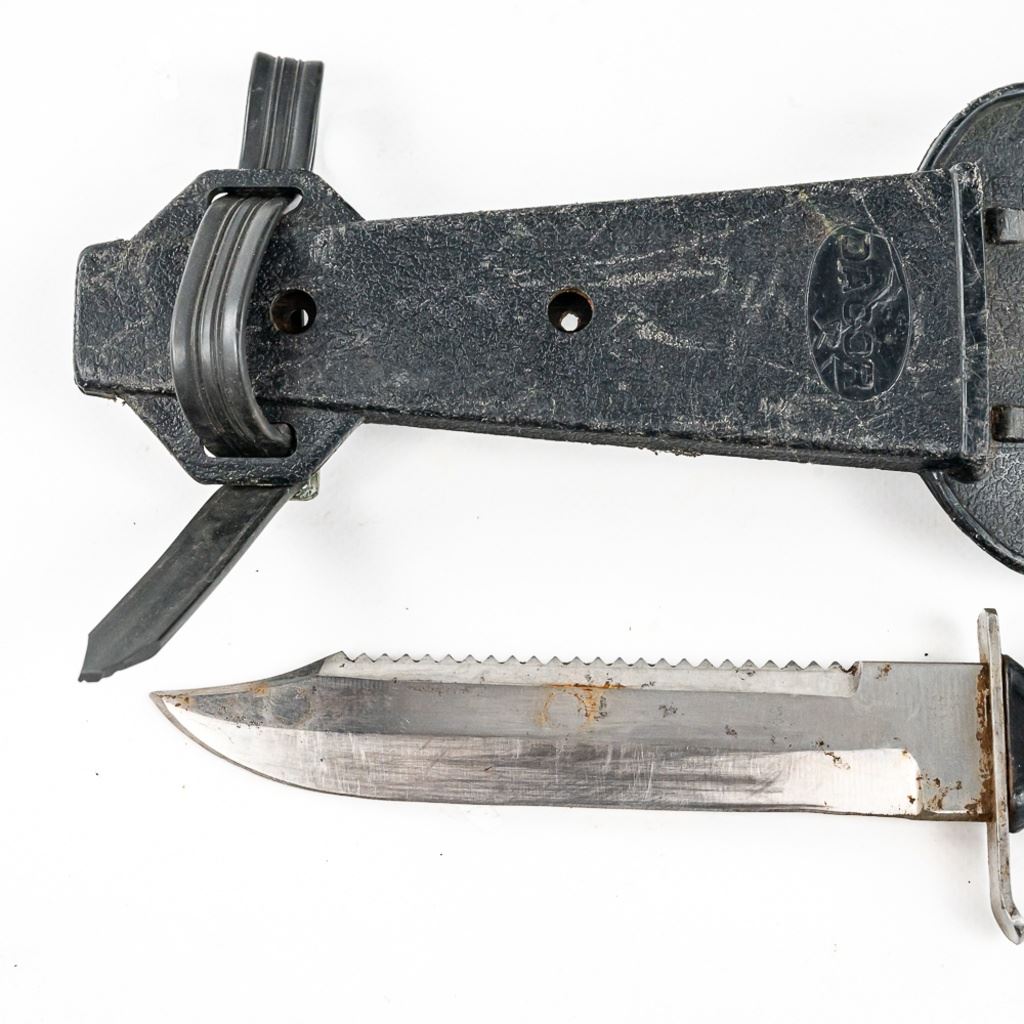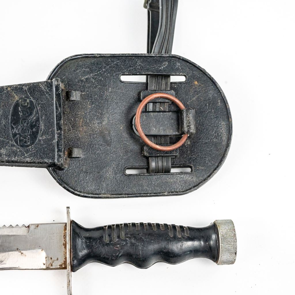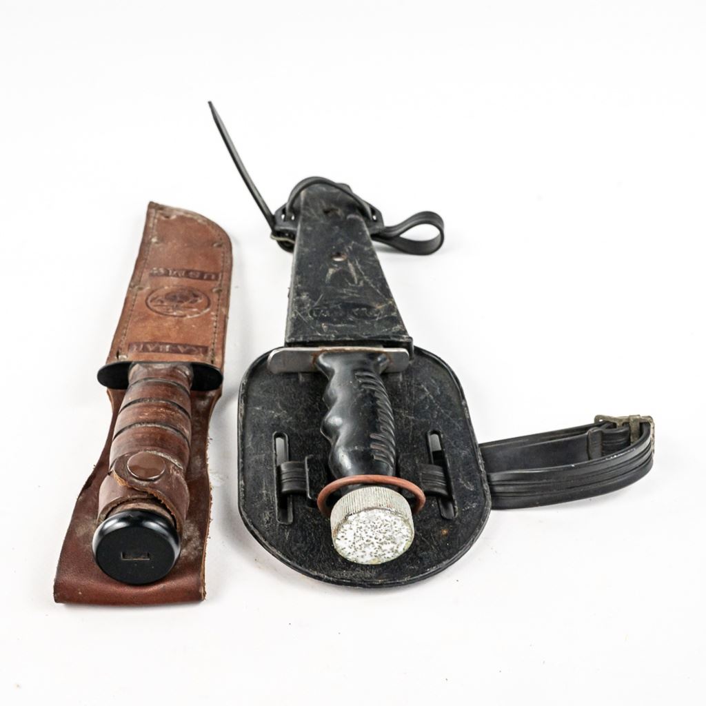 1) USMC marked Ka-bar knife. It is unused and factory sharpened very sharp. Scabbard and handle leather shows age and light oxidation. 2) German Made Dacor scuba knife with 6.75" blade. Shows hard use and salt water corrosion. Very sharp.