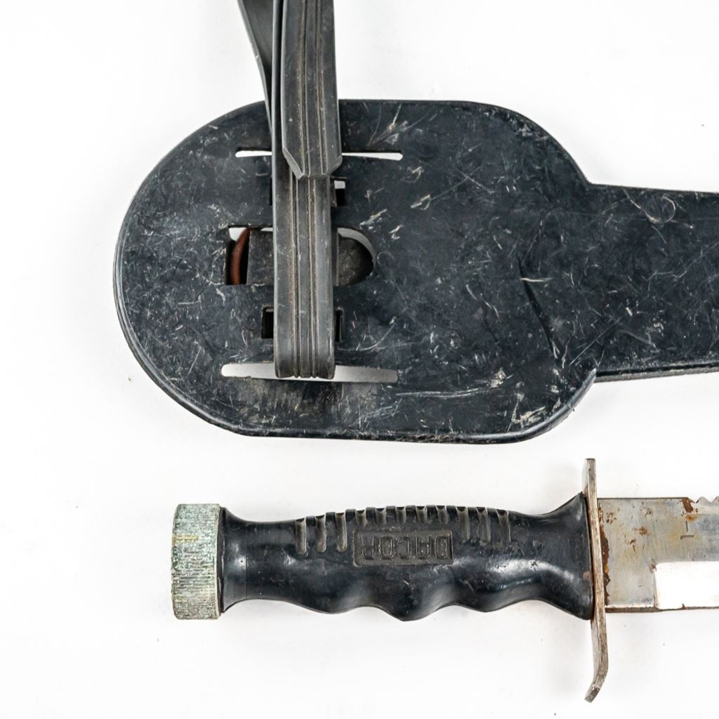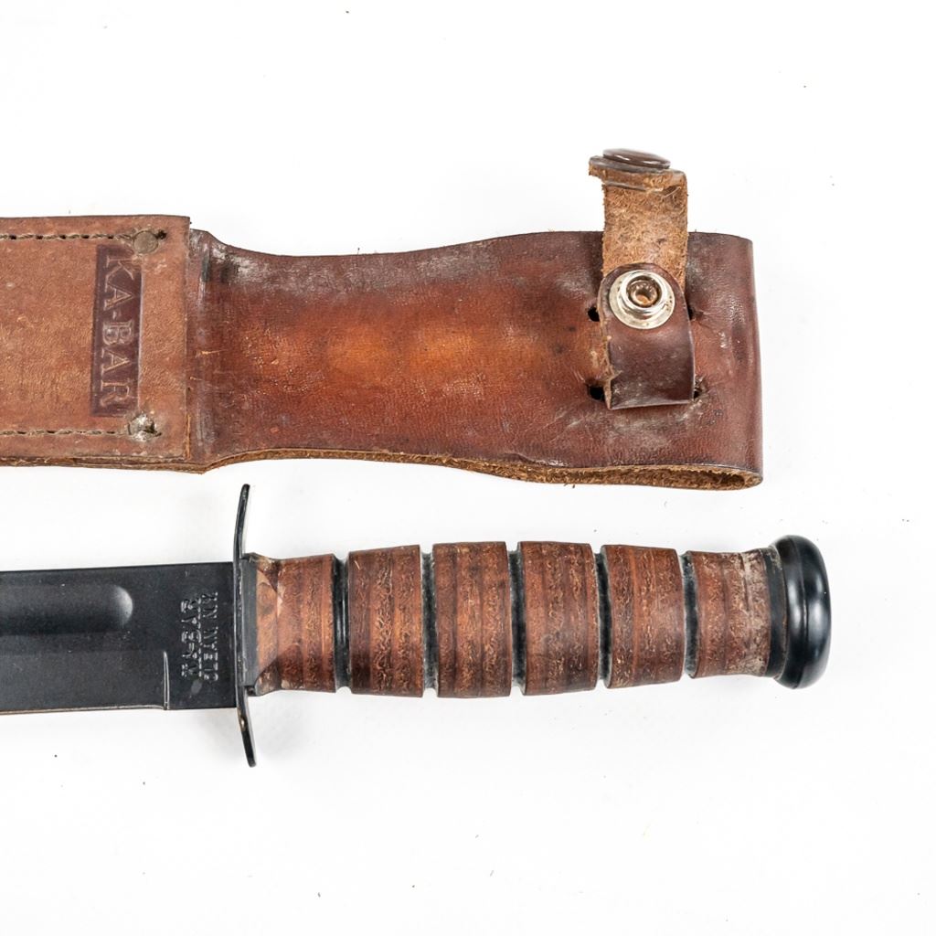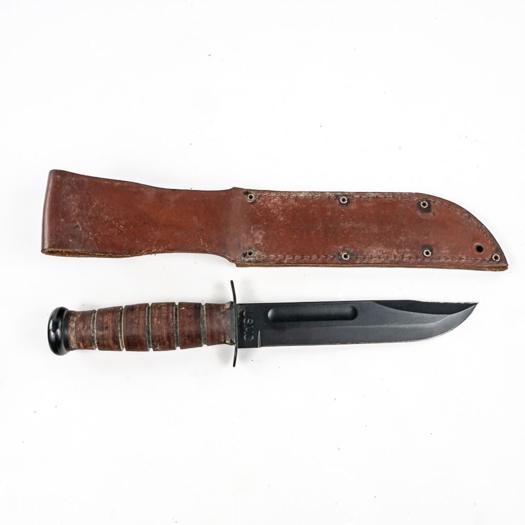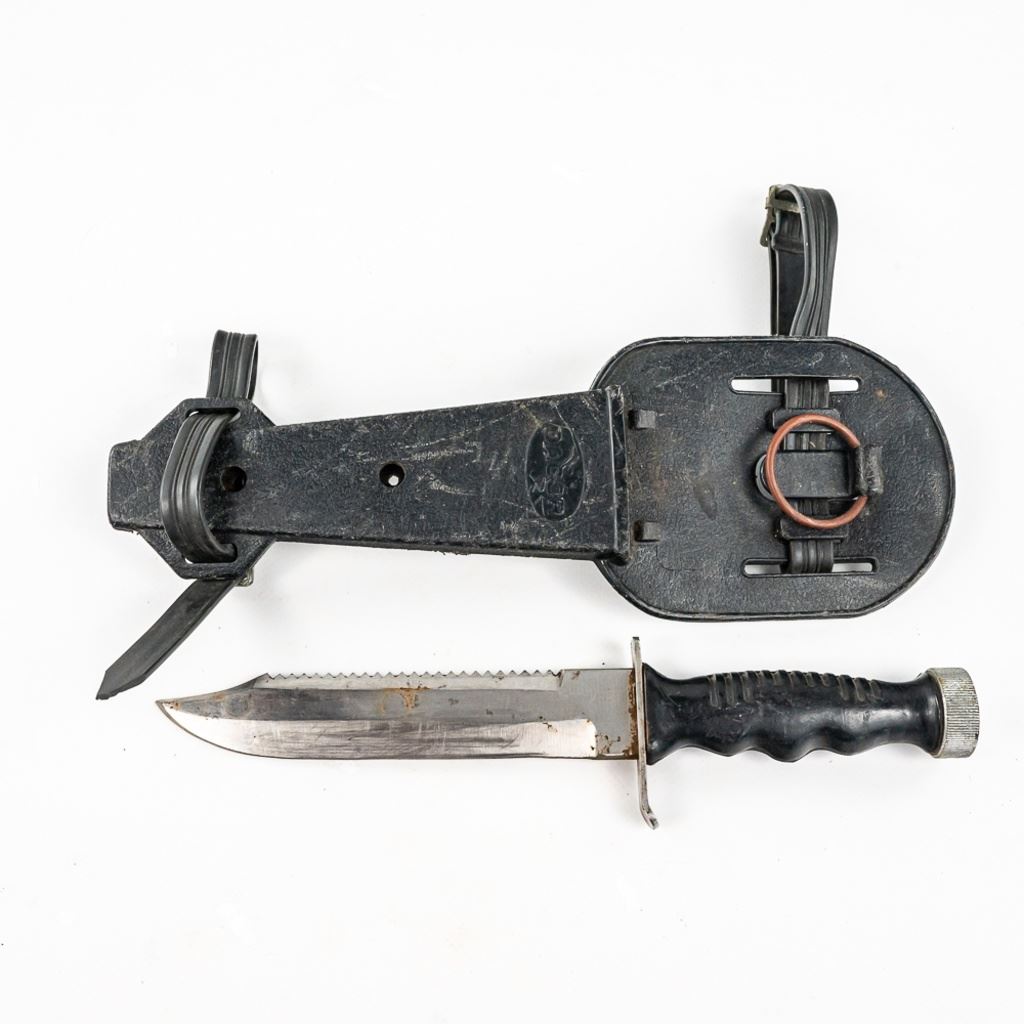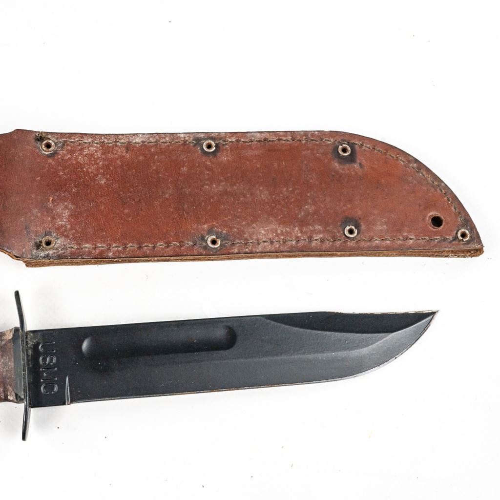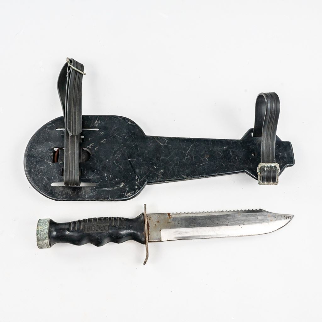 1) USMC marked Ka-bar knife. It is unused and factory sharpened very sharp. Scabbard and handle leather shows age and light oxidation. 2) German Made Dacor scuba knife with 6.75" blade. Shows hard use and salt water corrosion. Very sharp.