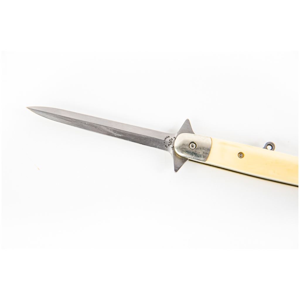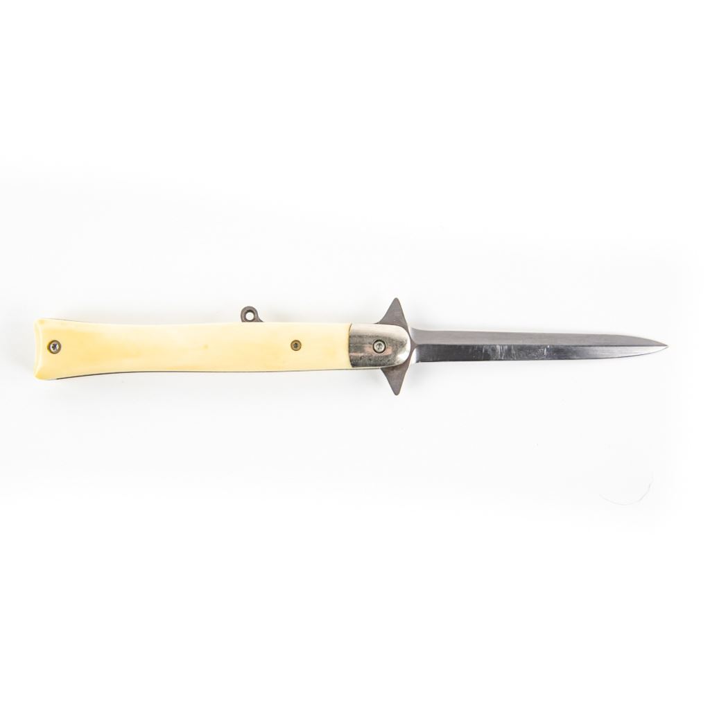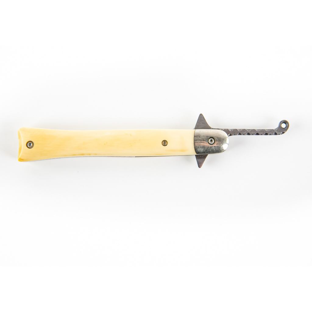 A Jerry Van Eizenga folding knife with Van Eizenga logo on blade. The handle is made of natural white horn/bone with no chips or cracks. Blade is a dagger type - 3.25" and 5.75" overall when folded. The blade shows a lot of cross graining. This is a real beauty from one of the living legends of knife making.