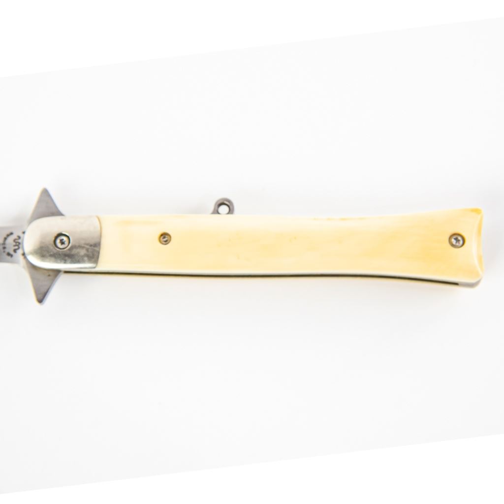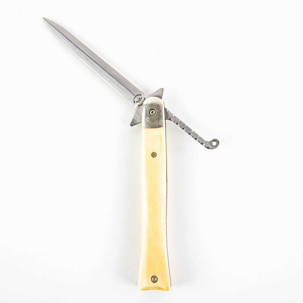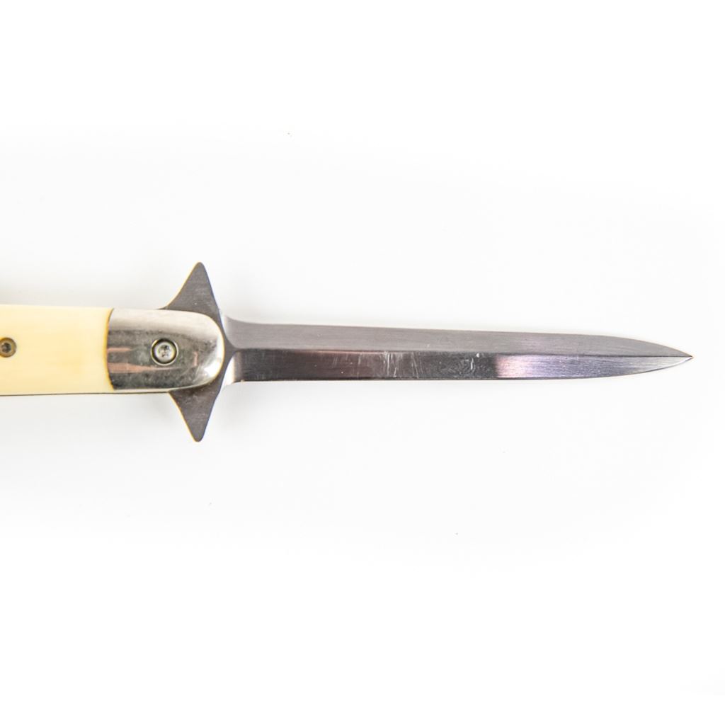 A Jerry Van Eizenga folding knife with Van Eizenga logo on blade. The handle is made of natural white horn/bone with no chips or cracks. Blade is a dagger type - 3.25" and 5.75" overall when folded. The blade shows a lot of cross graining. This is a real beauty from one of the living legends of knife making.