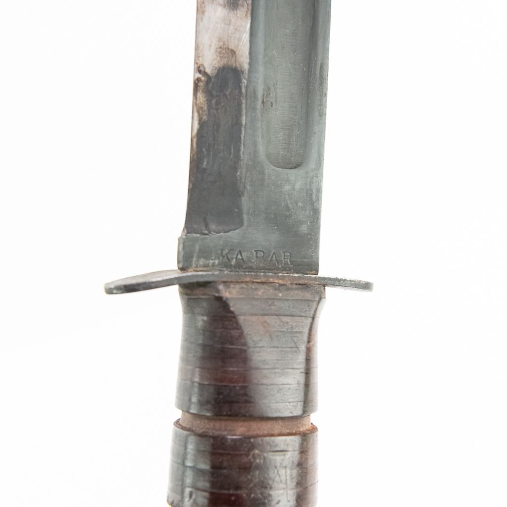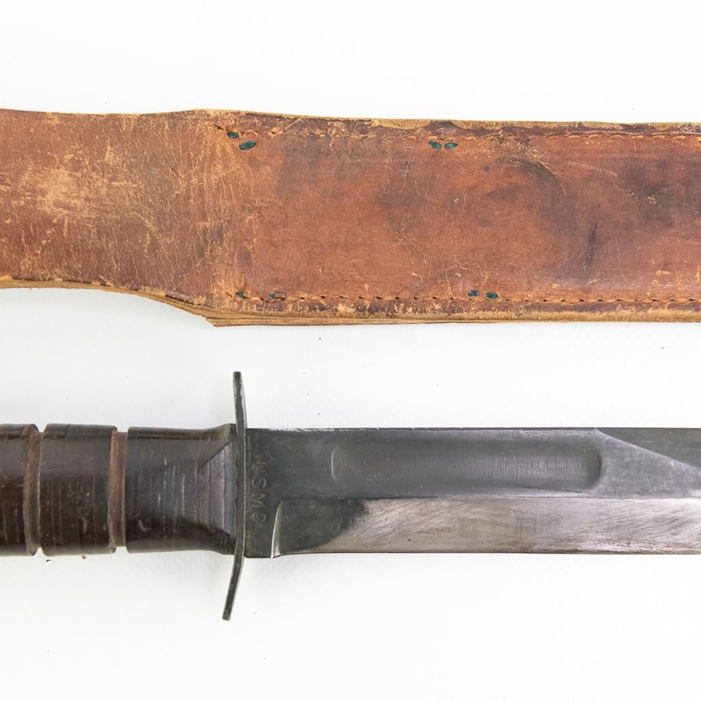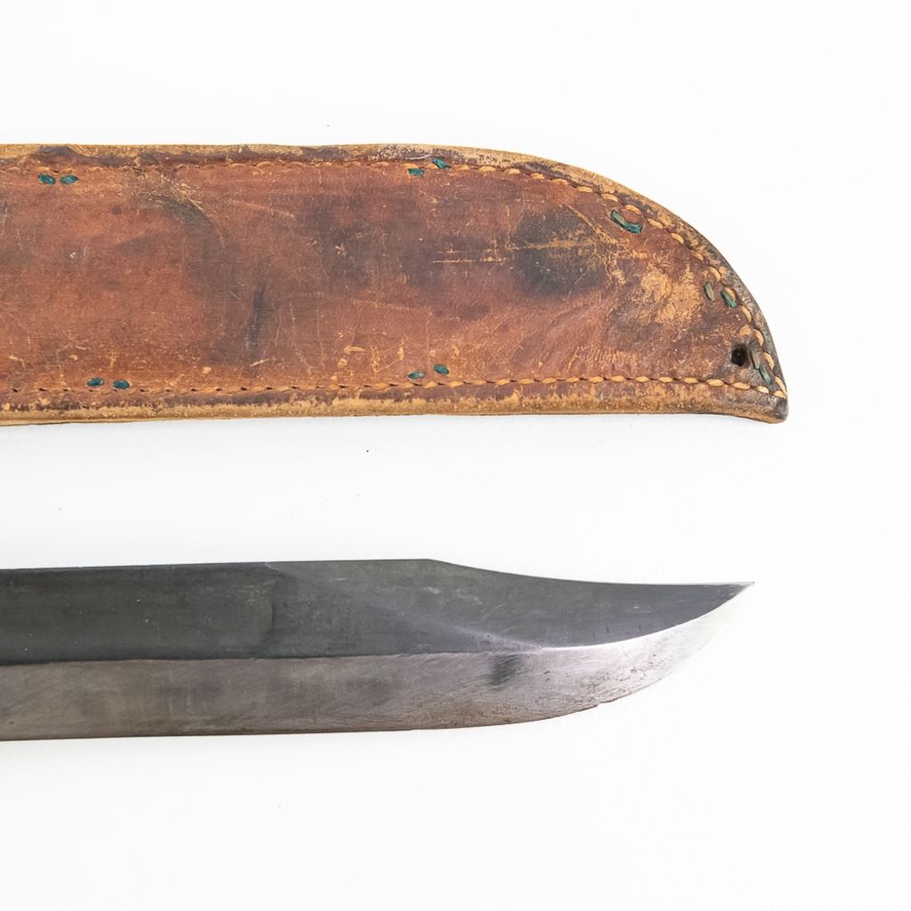 Knife blade has good tip with much wear and discoloration. Has 2 nicks that are 1.25" from tip. Brown sheath is unmarked and shows age and much wear yet still has most factory black bluing. Leather snaps are still fairly strong. Nice, used wartime example.