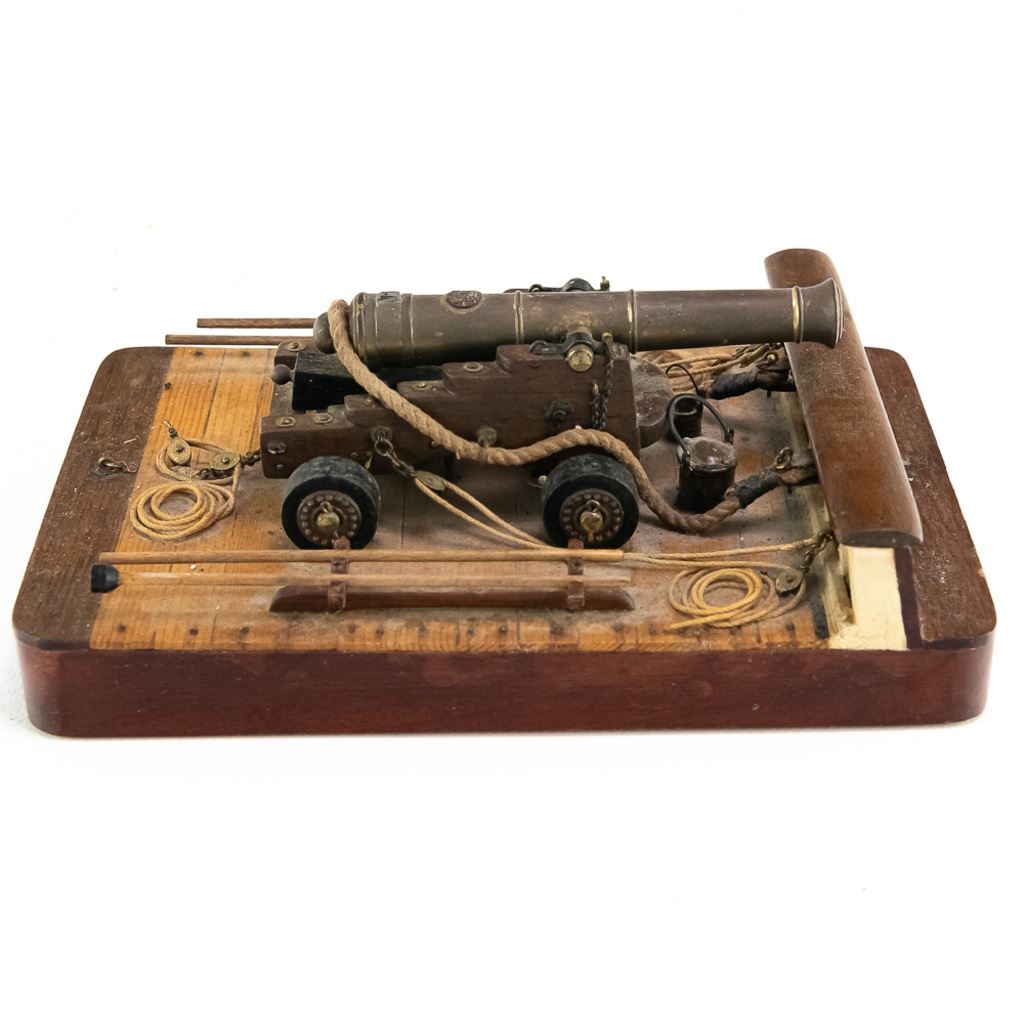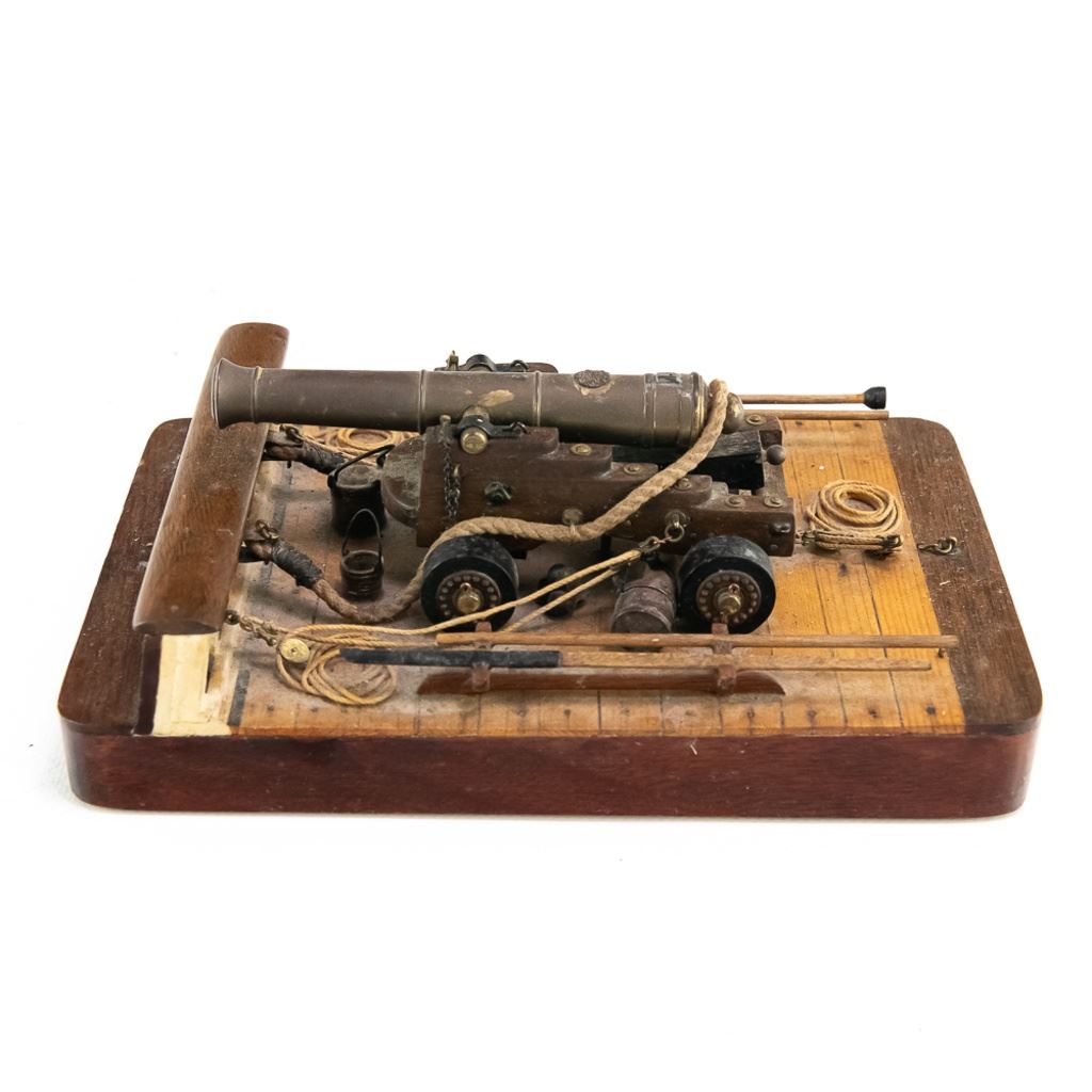 -18th century 12lb Ship's 4.5" Long gun mounted on a ship deck diorama w/tools