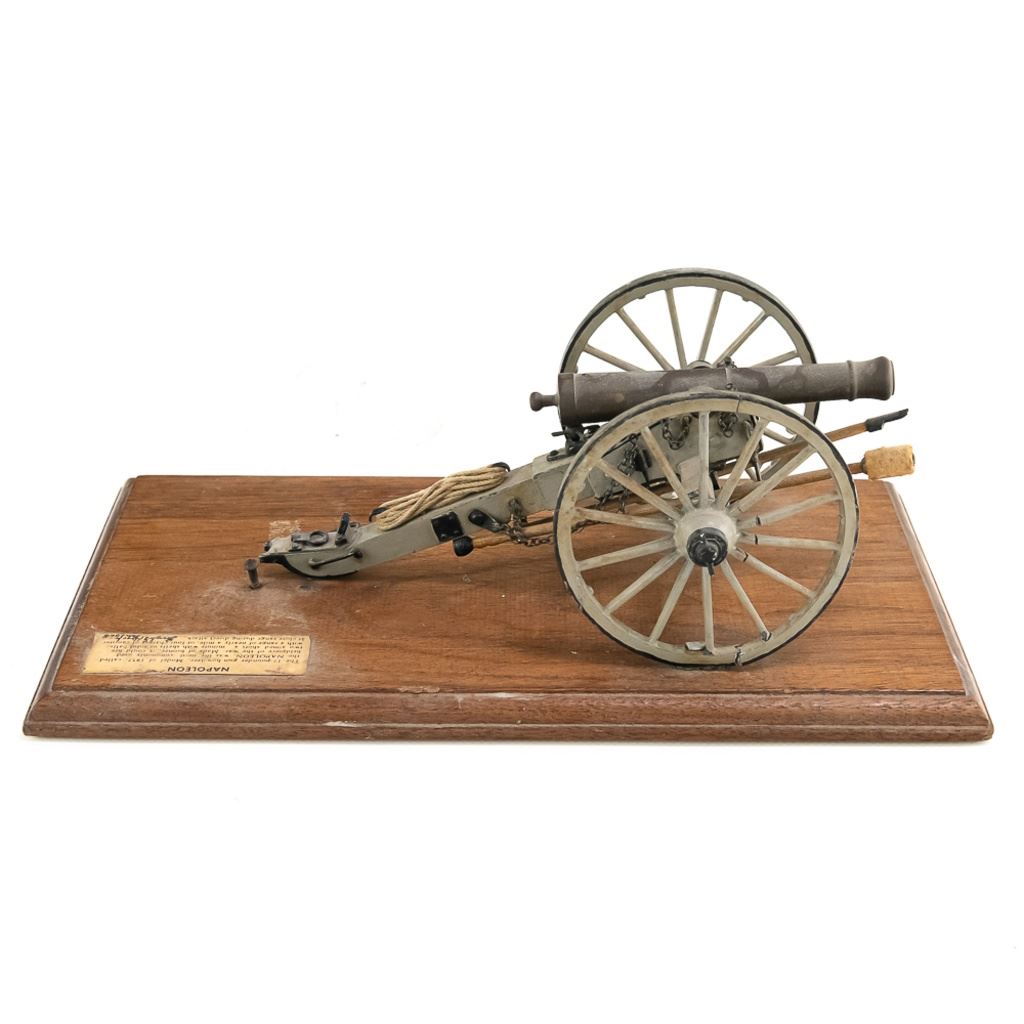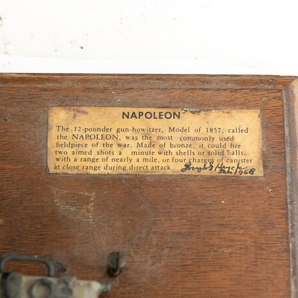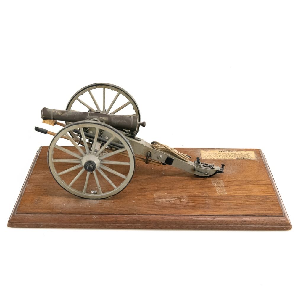 -12lb Napoleon 4" cannon and chassis. w/tools and mounted on a wood plaque. One wheel is cracked.
