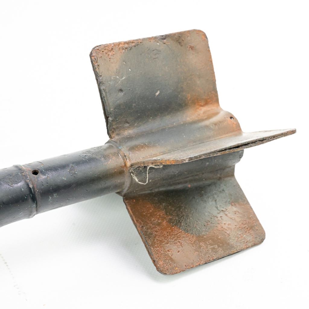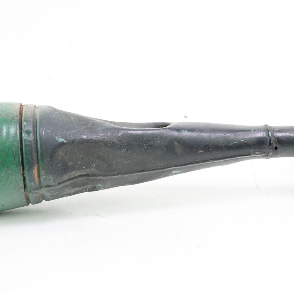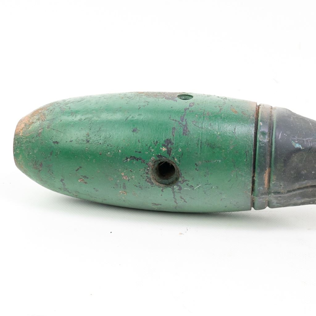 This US practice bomb is 25 LB and 25" long with 4" diameter. It shows much hard use and has been painted over a few times. Traces of the light blue training paint can be seen. These were made to drop and on impact a smoke charge would activate for spotting accuracy. This is from the famous prop house MTS Armorer FX owned by Matthew Stratton.