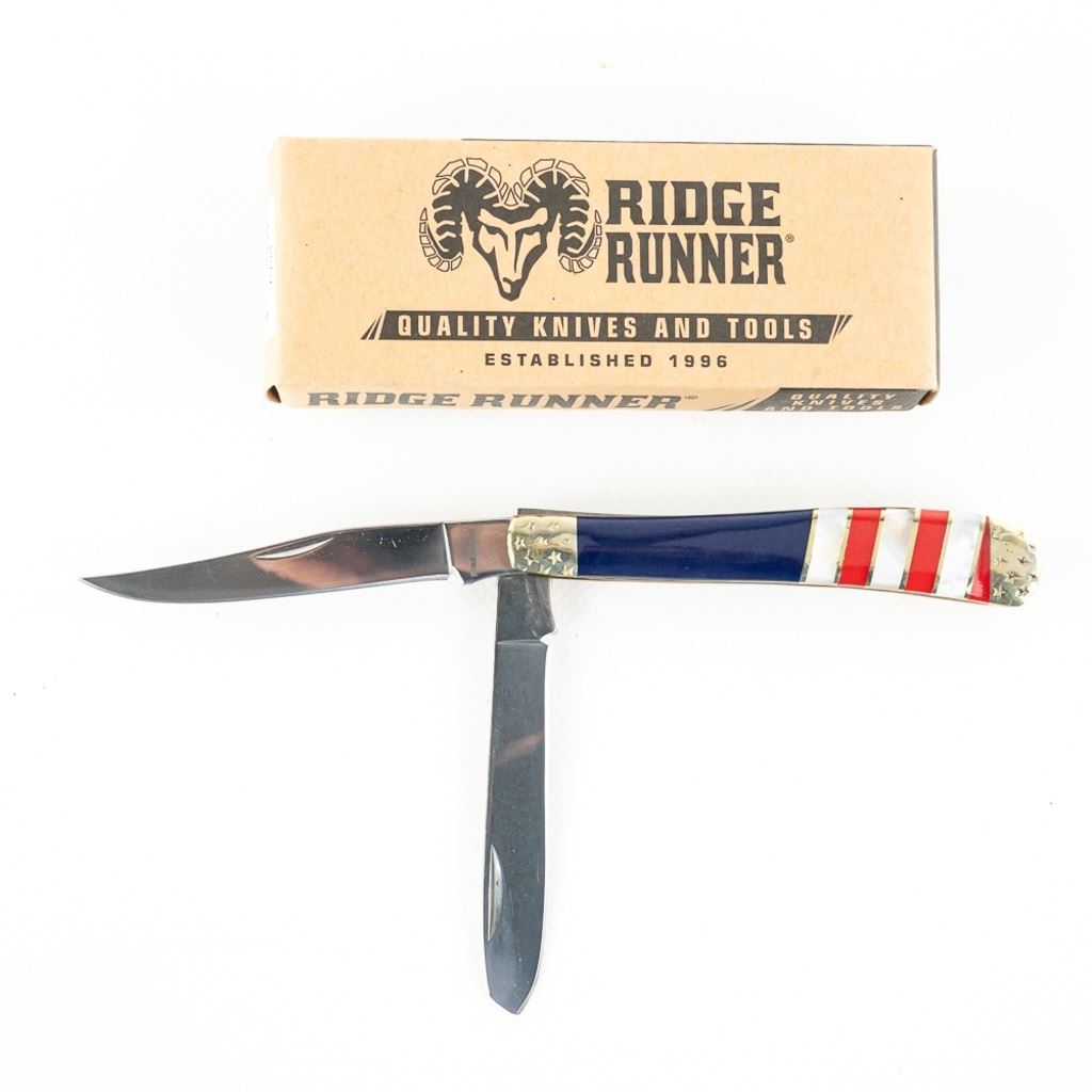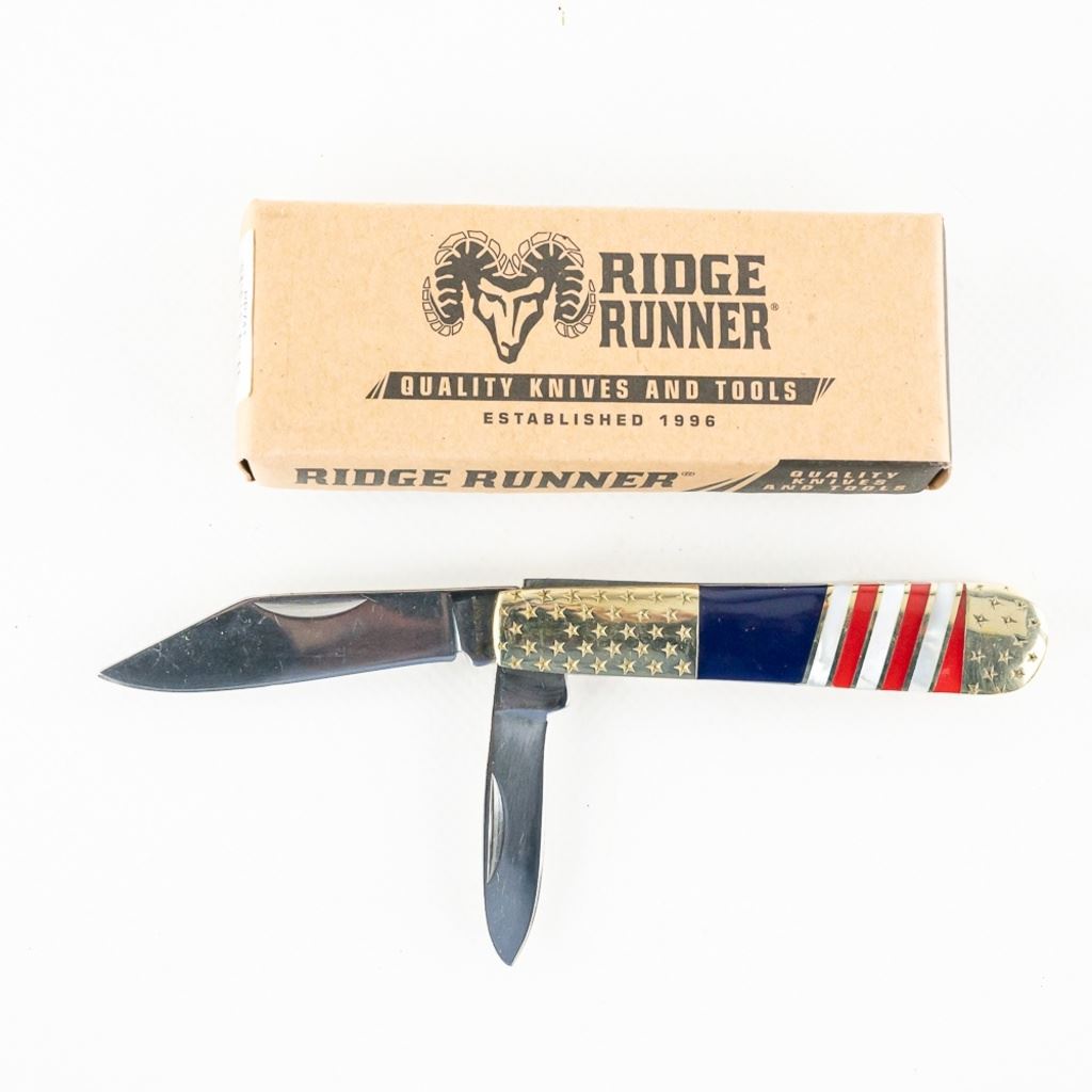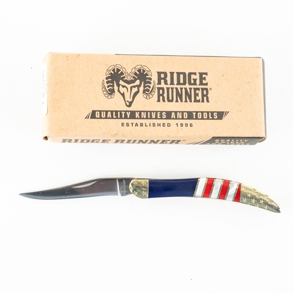 5 American Flag themed pocket knives. All are Ridge Runner brand in new, in box condition. Various styles and blade types. See photos.