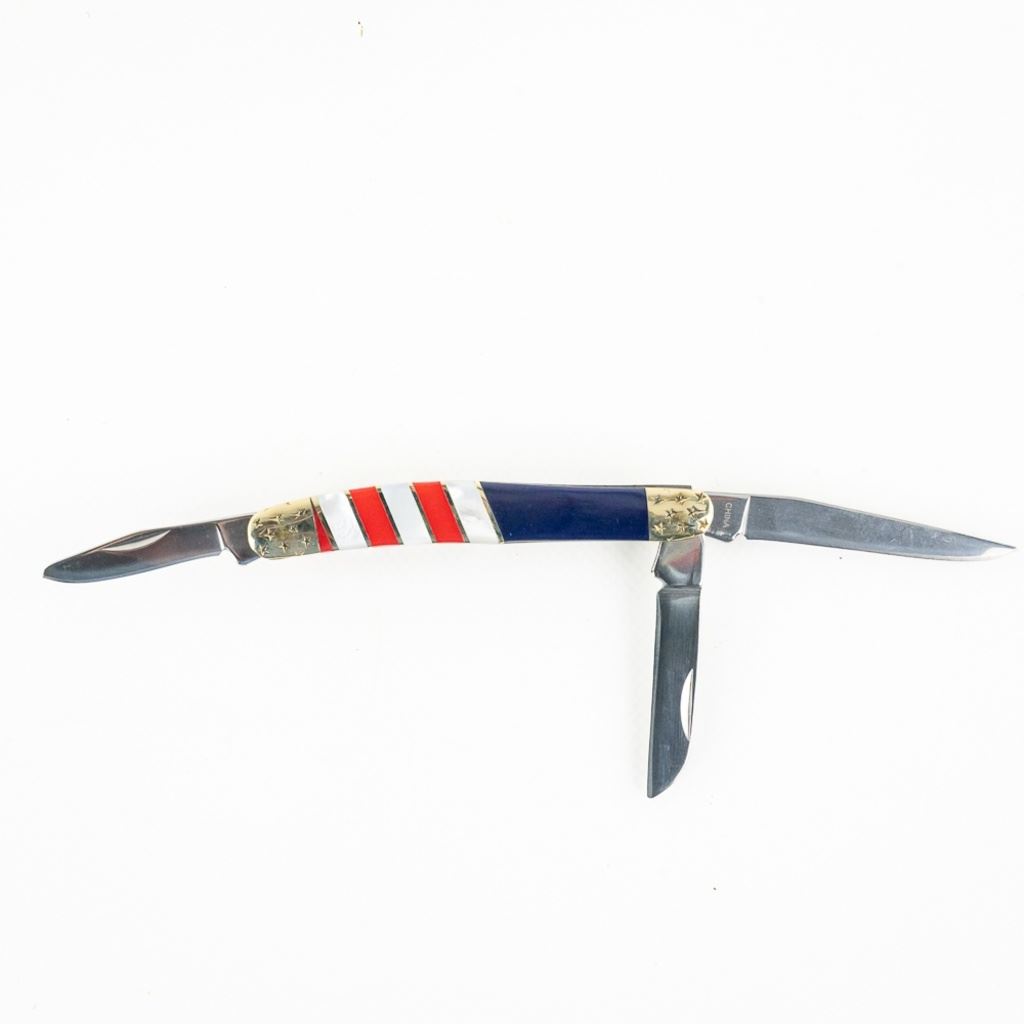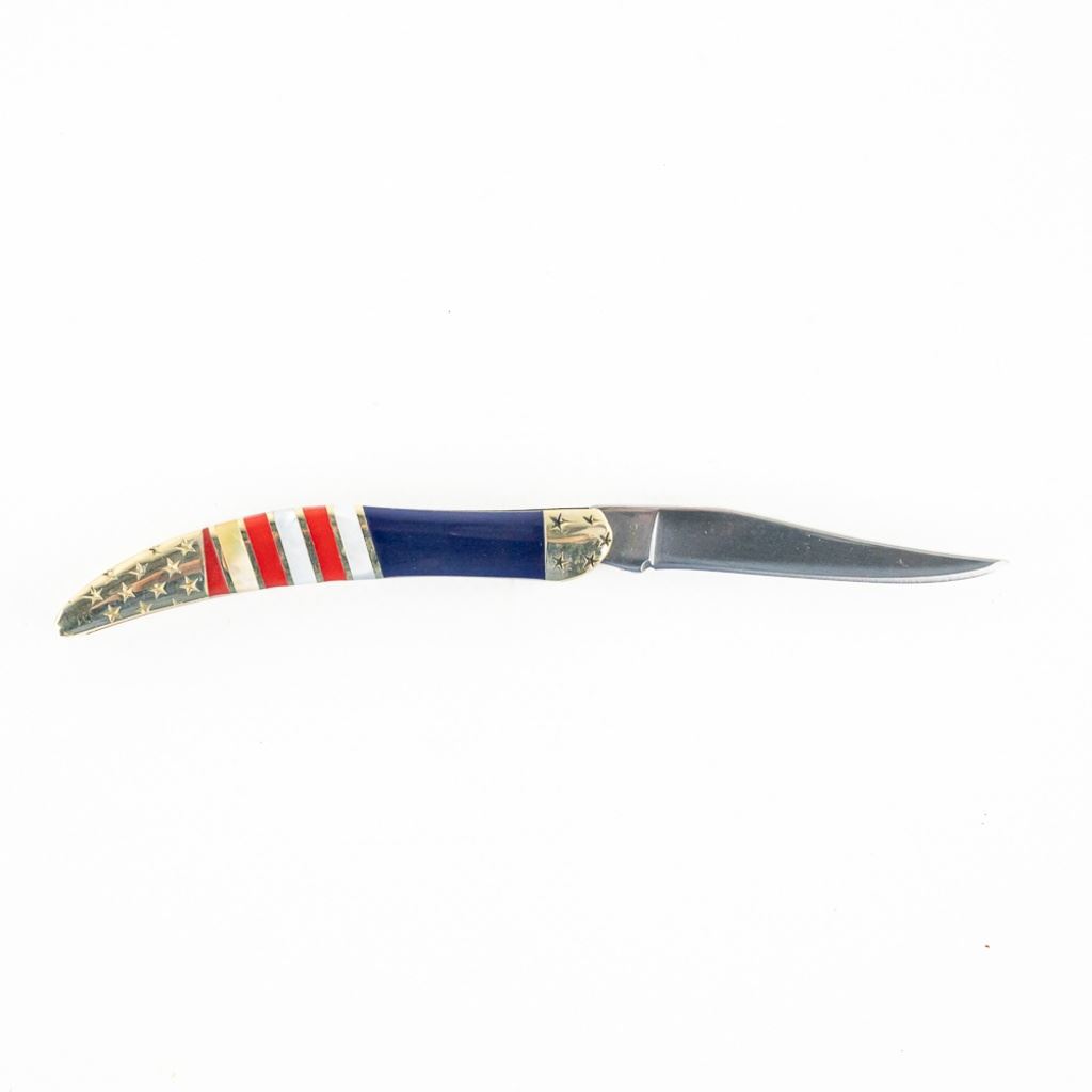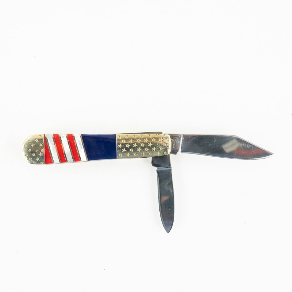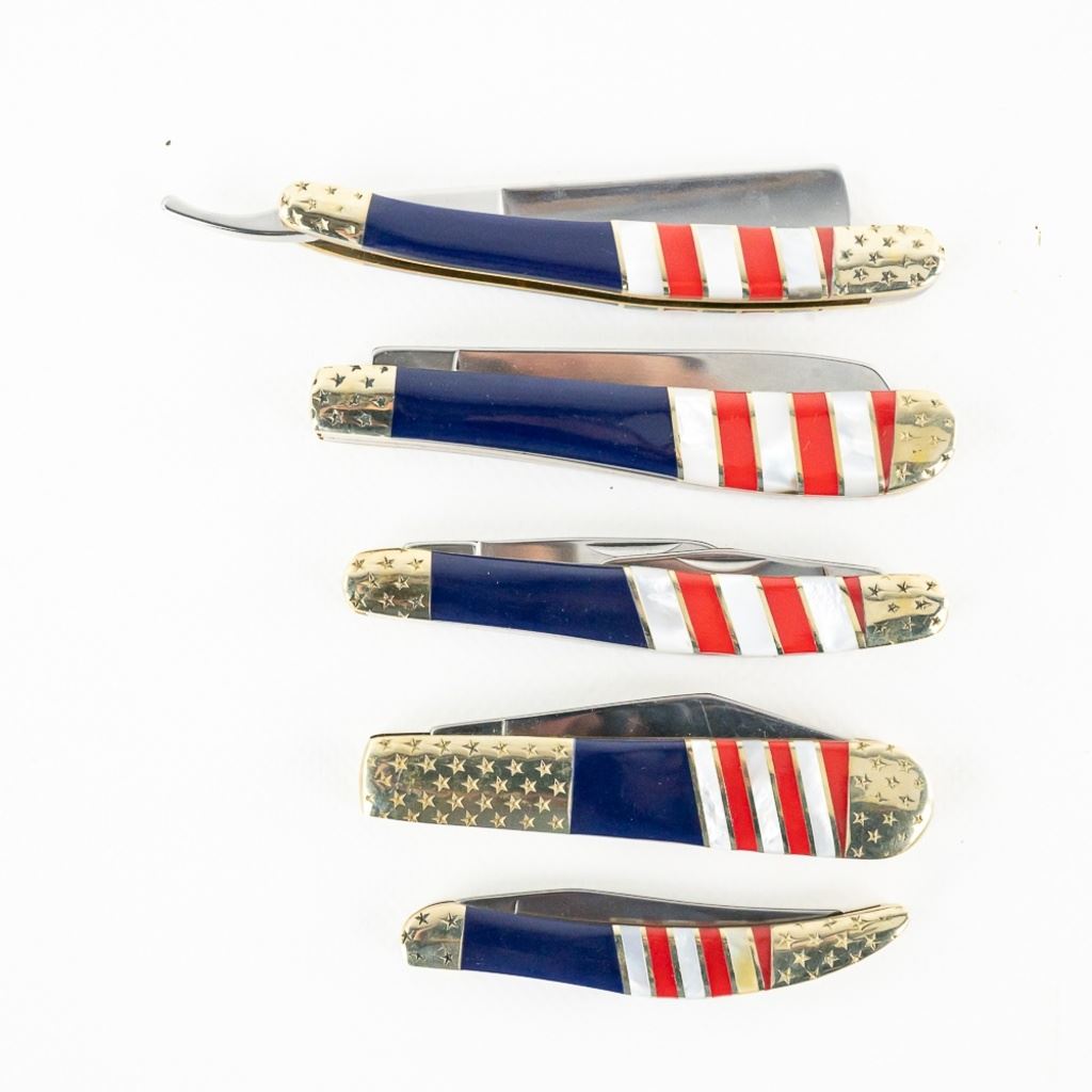 5 American Flag themed pocket knives. All are Ridge Runner brand in new, in box condition. Various styles and blade types. See photos.