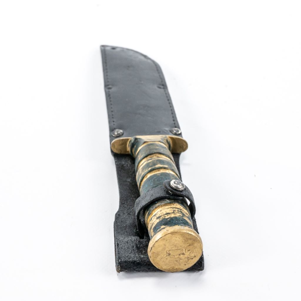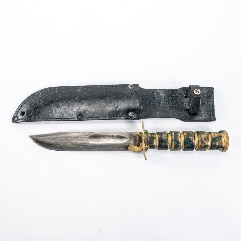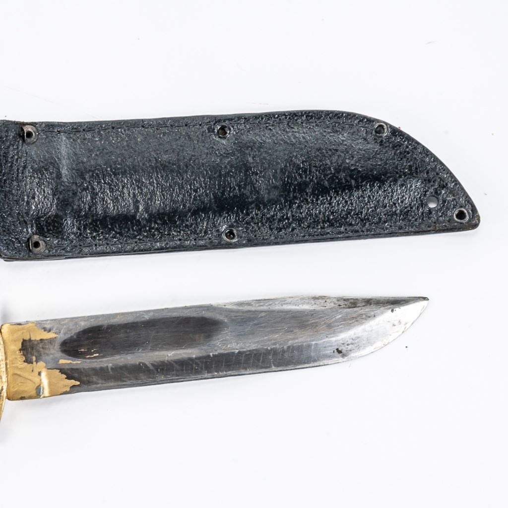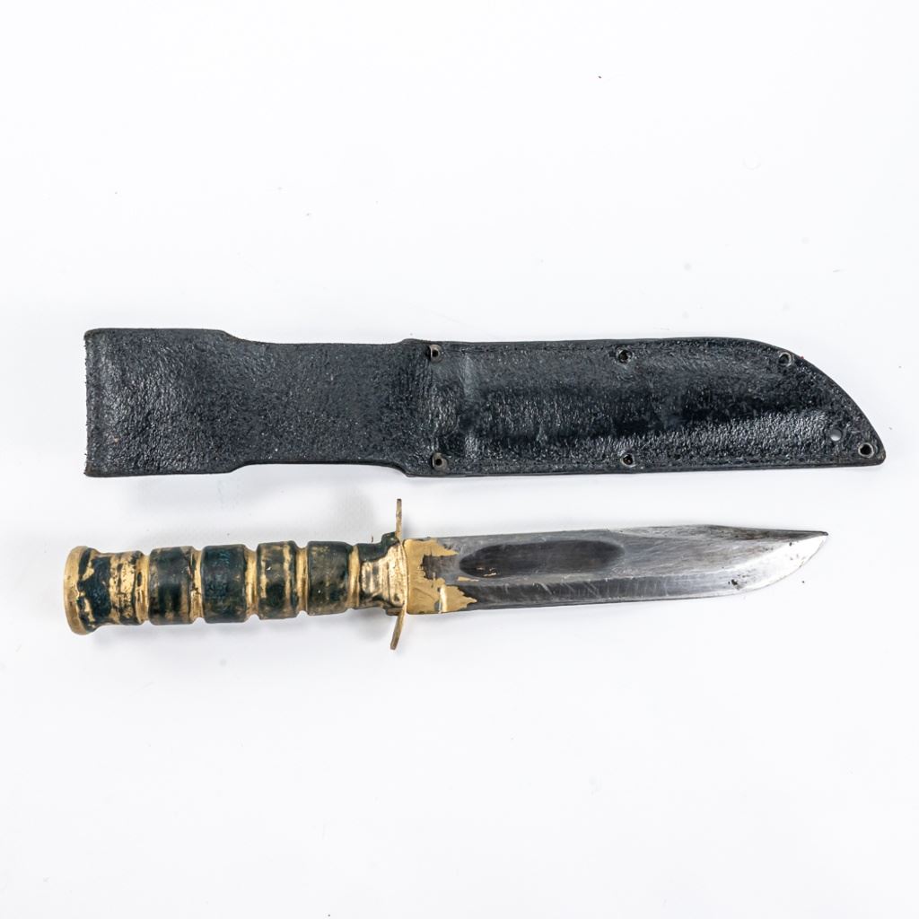Modern Reproduction of WW1 Trench Mace club. Excellent high quality steel and wood replica great for display. Lot also includes Japanese made copy of Ka-Bar fighting knife. Knife is in good vintage condition aside from being poorly painted entirely with gold paint and comes with correct vintage leather sheath in similar condition, but unpainted. See Photos.