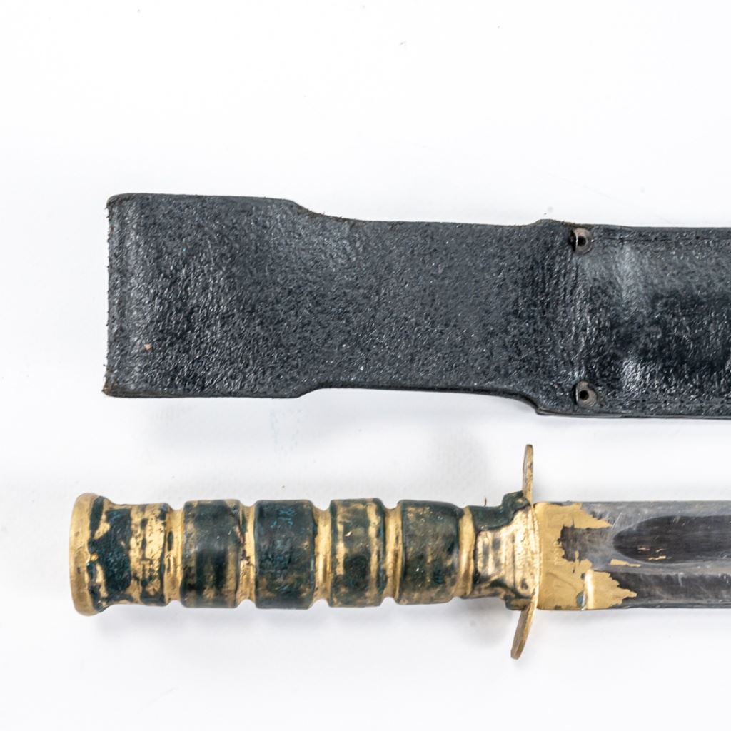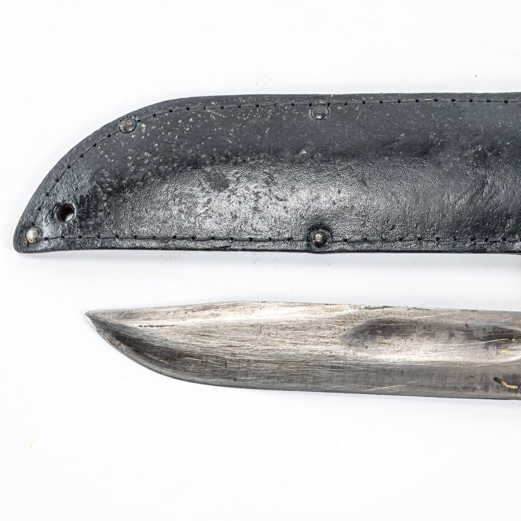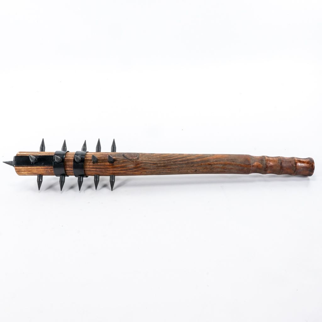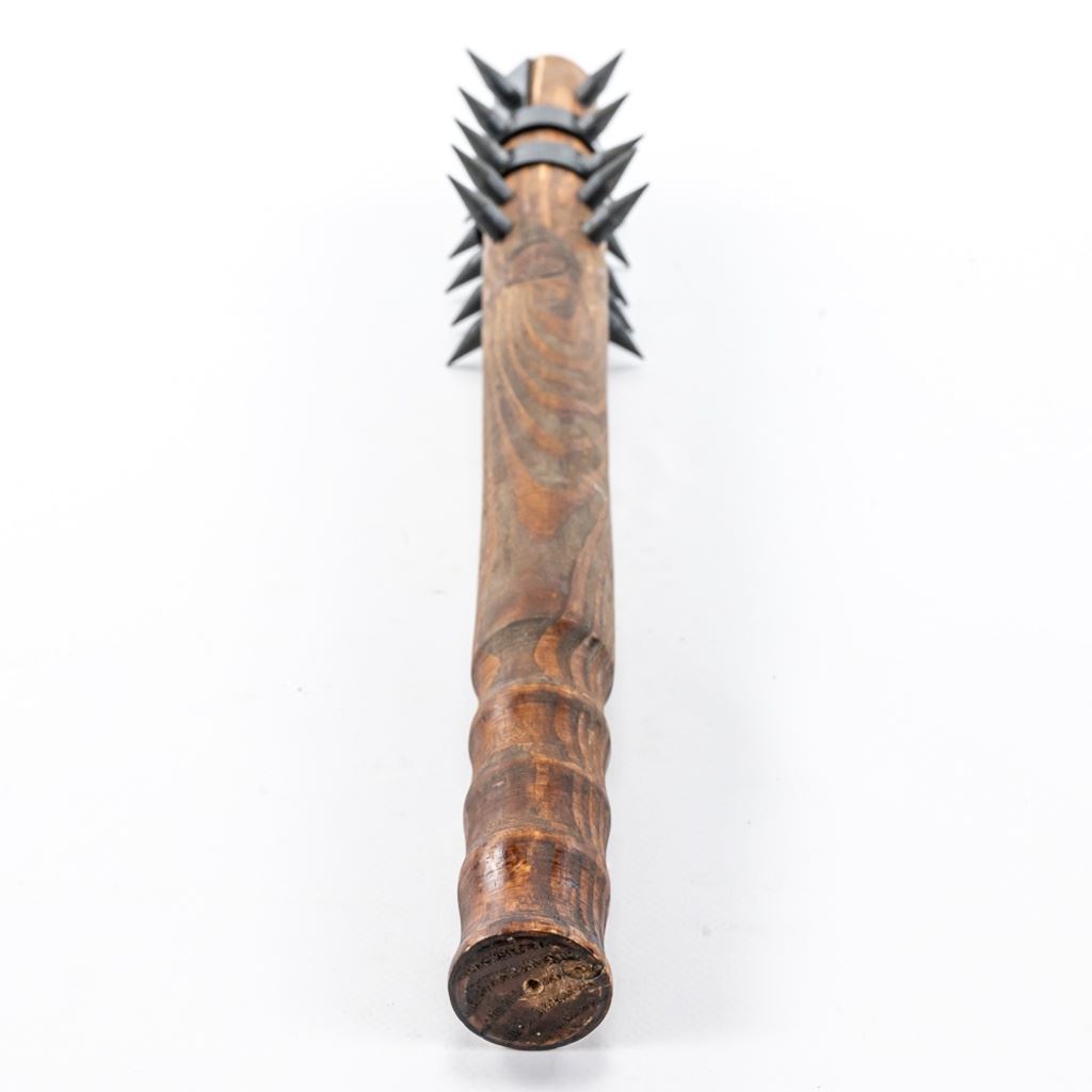 Modern Reproduction of WW1 Trench Mace club. Excellent high quality steel and wood replica great for display. Lot also includes Japanese made copy of Ka-Bar fighting knife. Knife is in good vintage condition aside from being poorly painted entirely with gold paint and comes with correct vintage leather sheath in similar condition, but unpainted. See Photos.