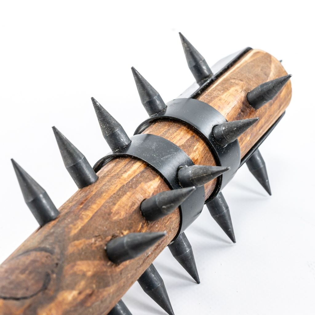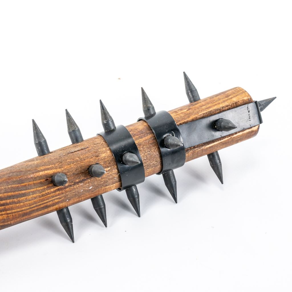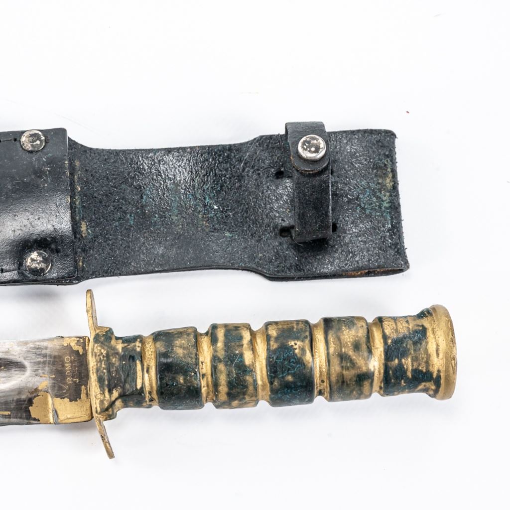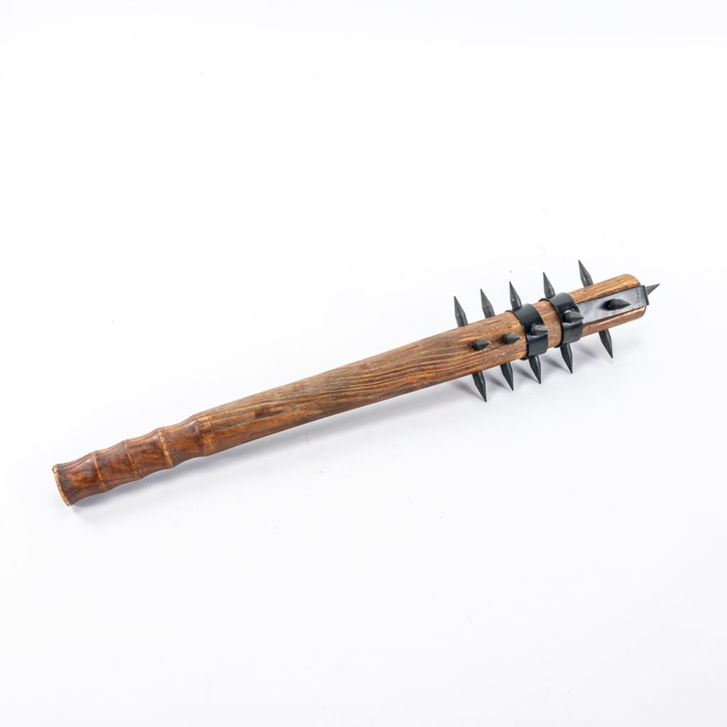 Modern Reproduction of WW1 Trench Mace club. Excellent high quality steel and wood replica great for display. Lot also includes Japanese made copy of Ka-Bar fighting knife. Knife is in good vintage condition aside from being poorly painted entirely with gold paint and comes with correct vintage leather sheath in similar condition, but unpainted. See Photos.