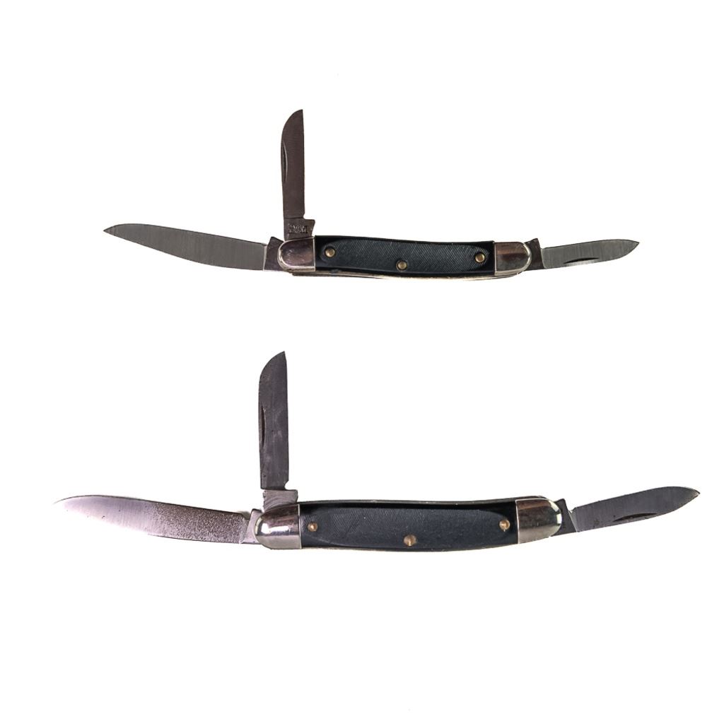 2 Ranger Cutlery USA made Ranger brand pocket knives. Both knives are based off of older Schrade designs but are more modern production with laser etched logos on blades. Both knives are in Excellent, used condition with factory edges on blades and only minor wear on bolsters. See photos.
