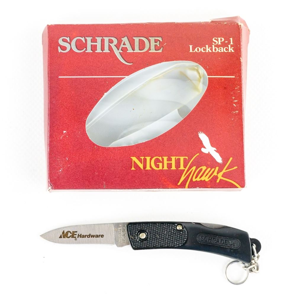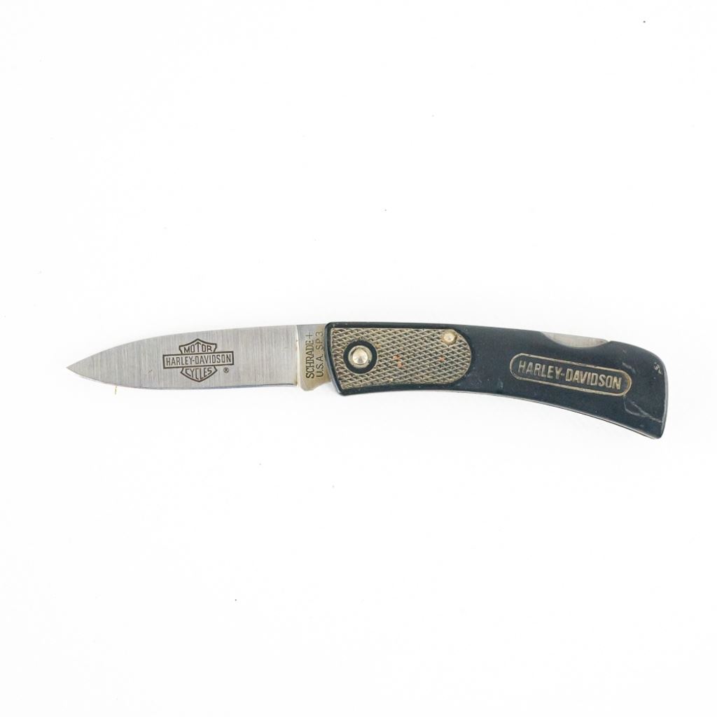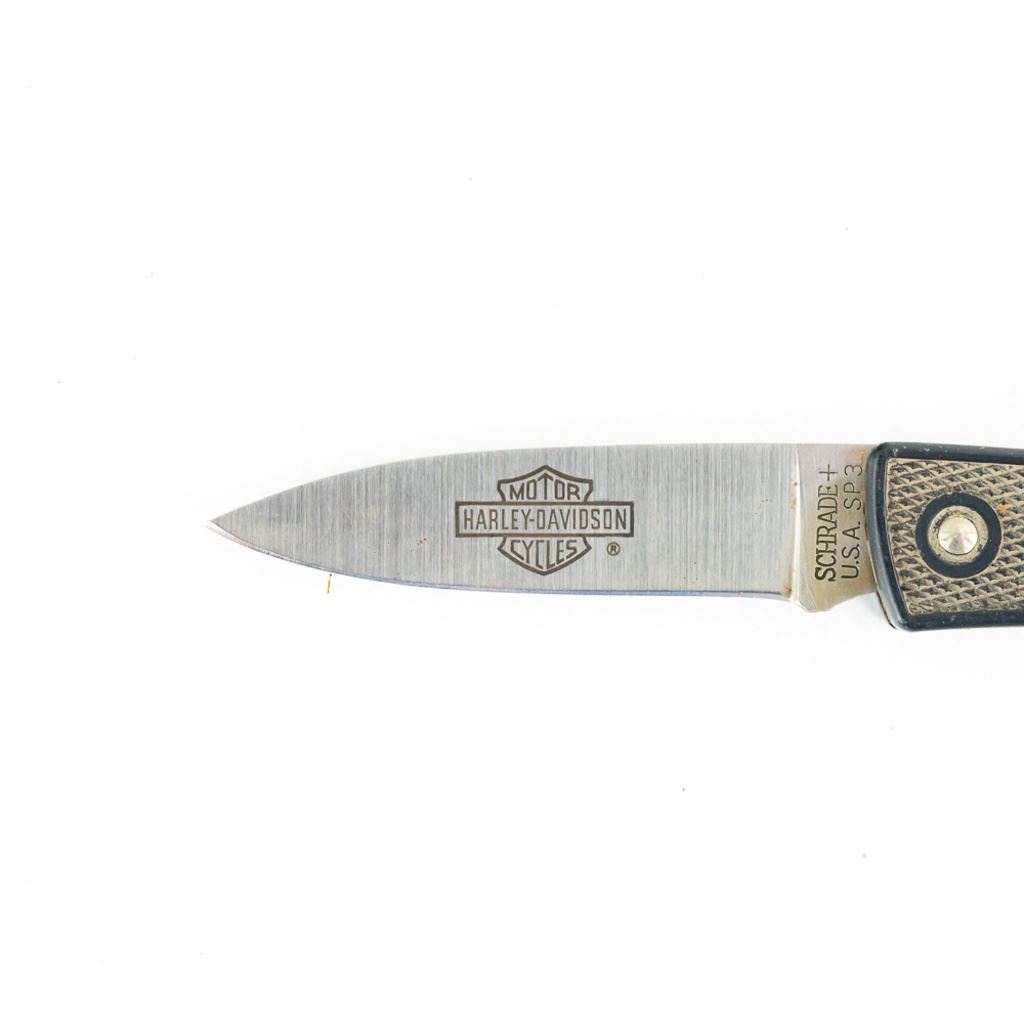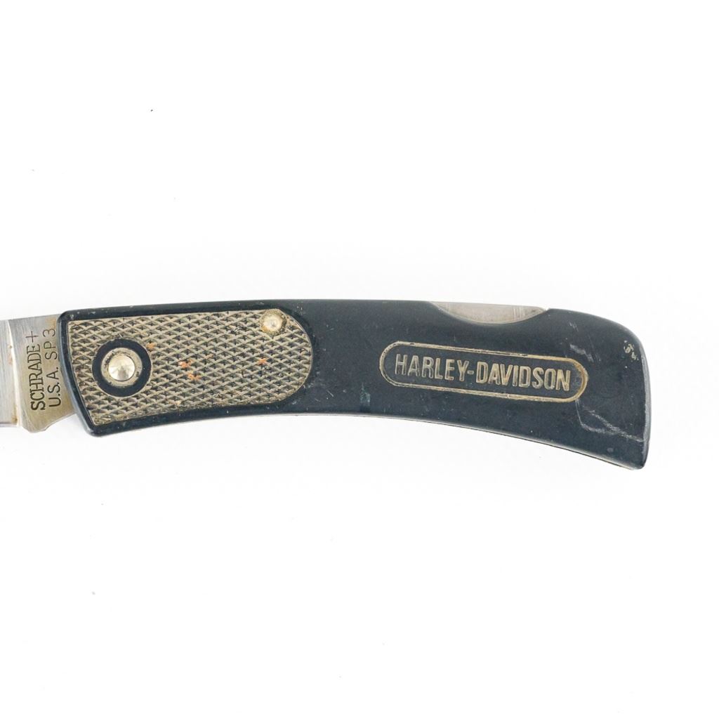 3 Schrade USA pocket knives. Models are SP1,SP2, and SP3. SP 1 and 2 are new in factory boxes. SP3 is Harley Davidson Promotional Item and is dirty but appears unused. See photos.