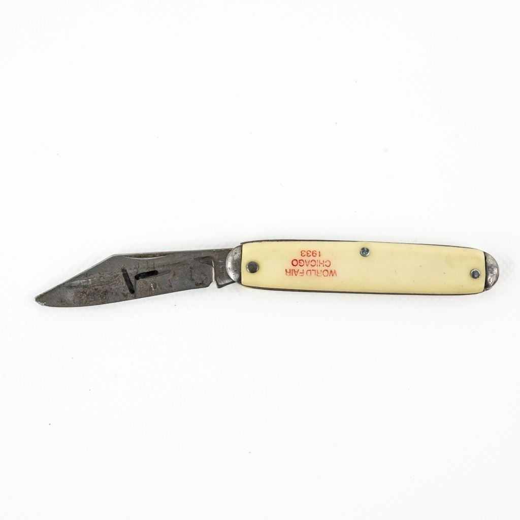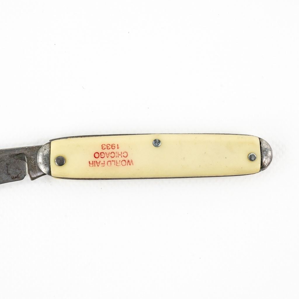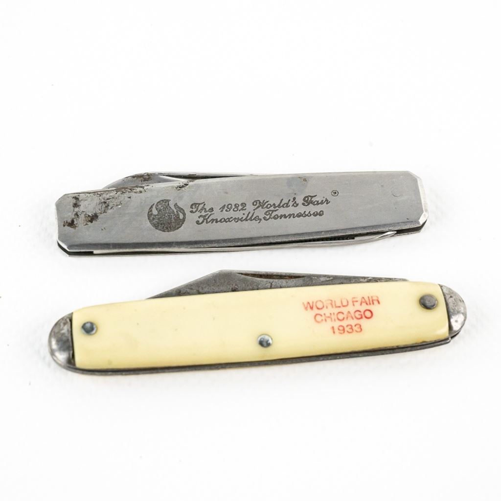 Souvenir collector pocket knives sold at the 1933 Chicago and 1982 Knoxville Worlds Fair events. Both knives are well marked but show signs of being used and carried. Blade on 1933 knife is sharpened and has pocket rust. Neat rare collector knives. See Photos.