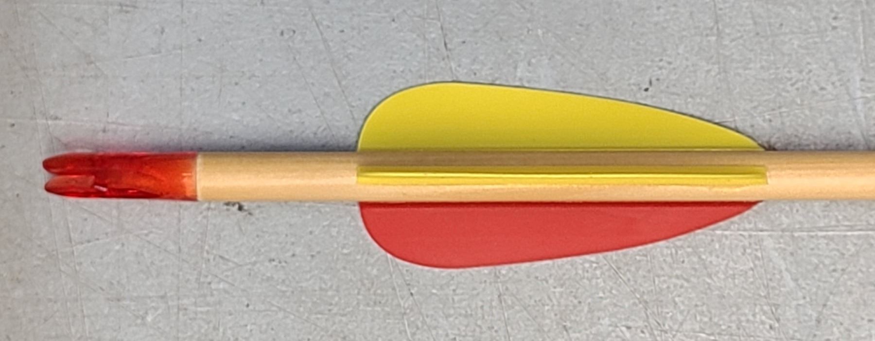These wood shart arrows have plastic fletching and notched plastic ends.