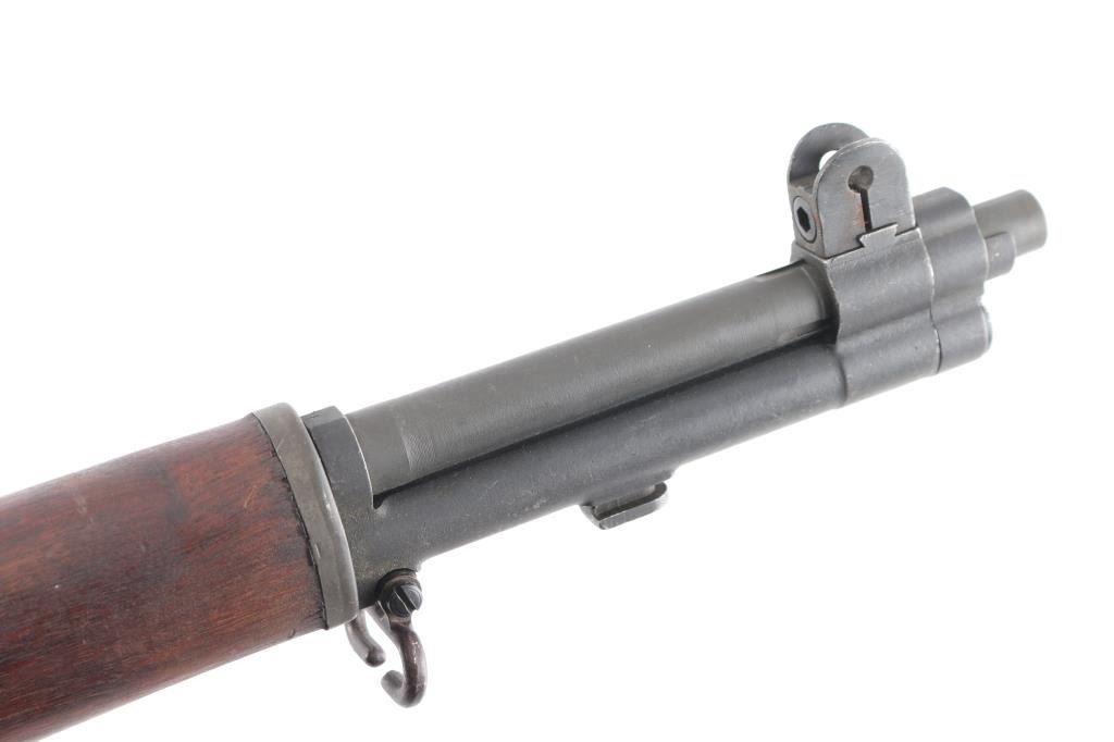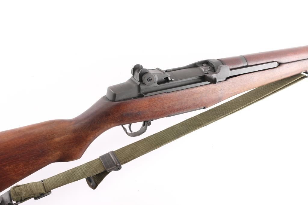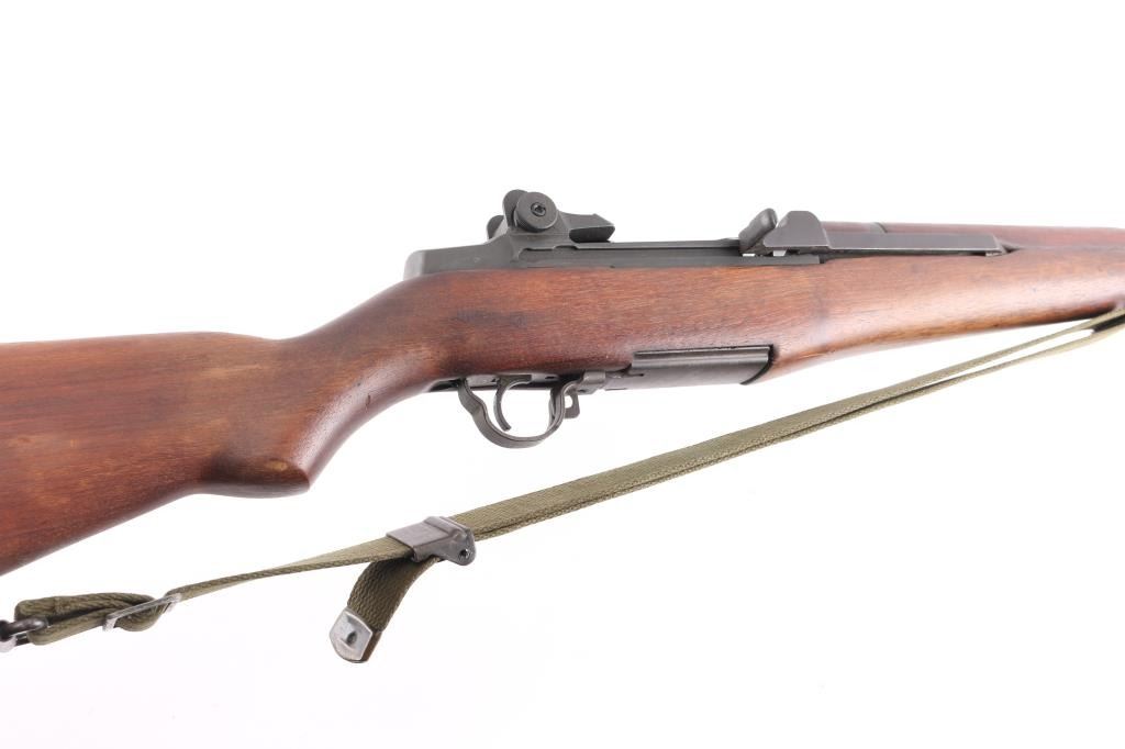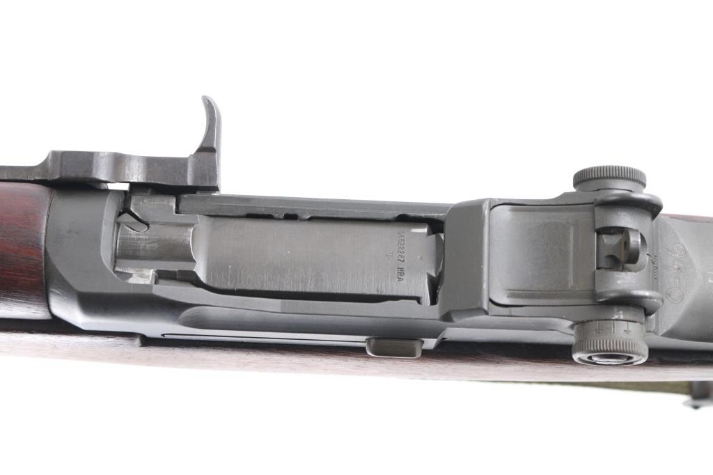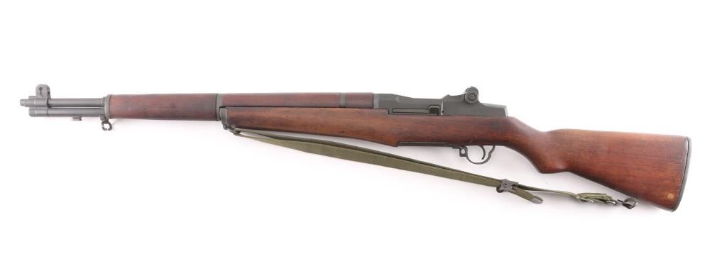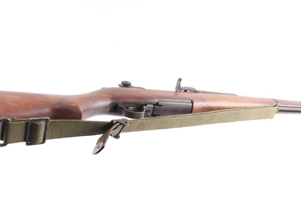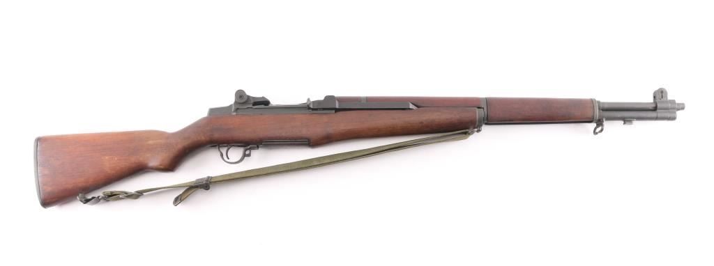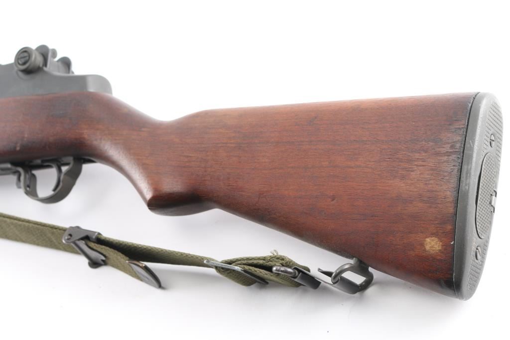 Korean war era US military semi-automatic rifle, manufactured circa 1953. Features parkerized finish, wood stock & hand guards, 24" barrel, adjustable sights with protected front blade & protected rear peep, fixed magazine for en-bloc clip, manual safety. Trigger guard has stamped style trigger guard. Barrel marked "HRA D6535448 12-53 RS26 ". Bolt marked "D6528287 HRA U". Rear sight marked "HRA-W". Includes green canvas sling. Bore is excellent/bright, a little dirty, finish is excellent with very minor edge wear, action is crisp/tight, and the wood is excellent with no cartouches. All markings are crisp/clear.
