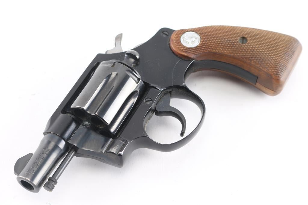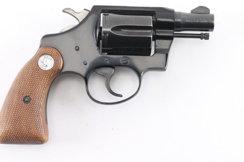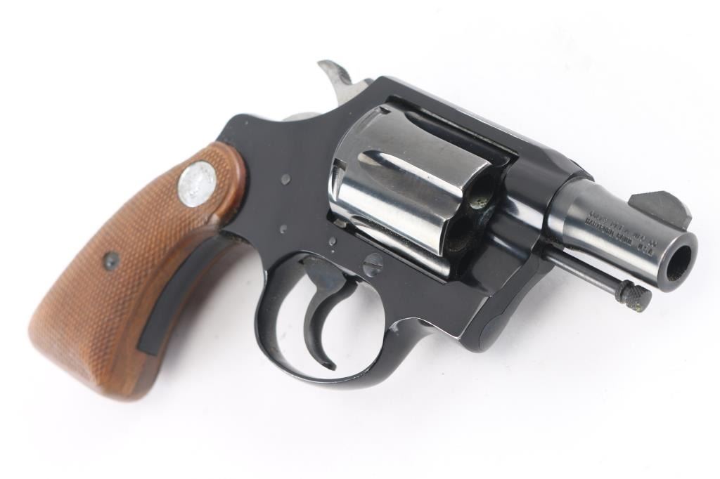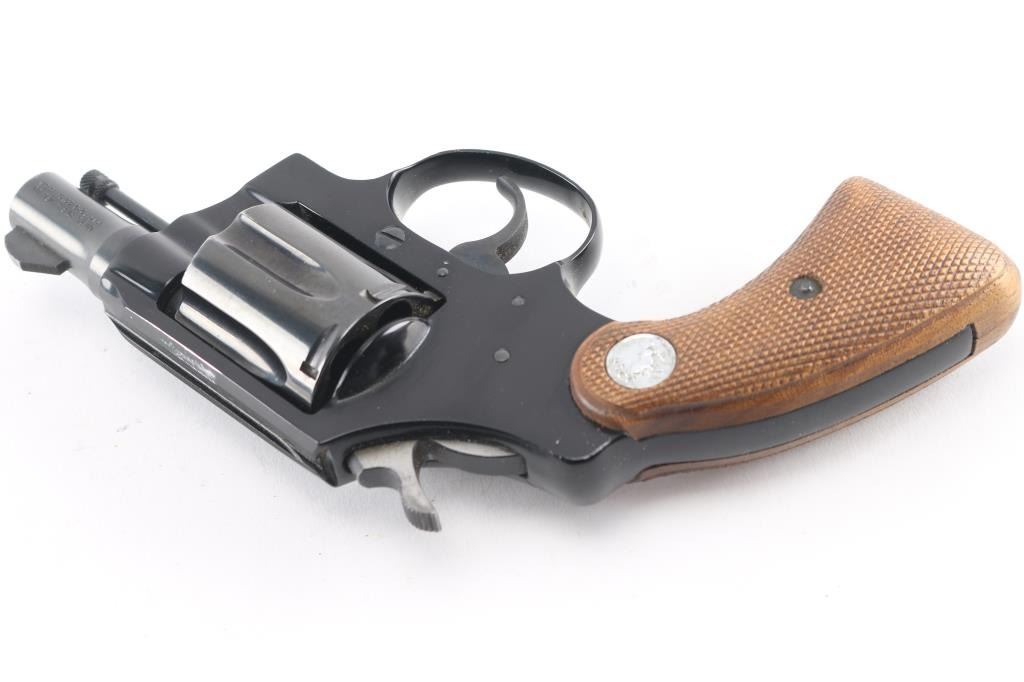 Double/single action revolver manufactured circa 1971. Features lightweight alloy frame, black/blued finish, checkered wood grips with Colt medallions, 2" barrel, fixed sights, 6 shot cylinder. Bore is excellent/bright. Retains 98% finish, with minor edge wear. Barrel and crane show as lighter and more gray than the cylinder & frame. (Normal) Brown checkered grips are excellent. Action is smooth with tight lock-up.