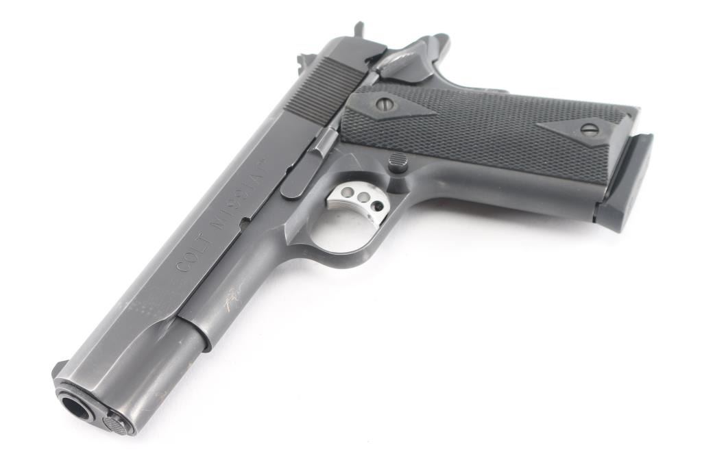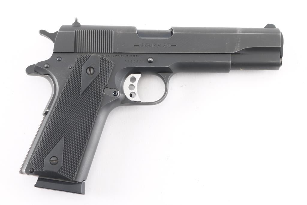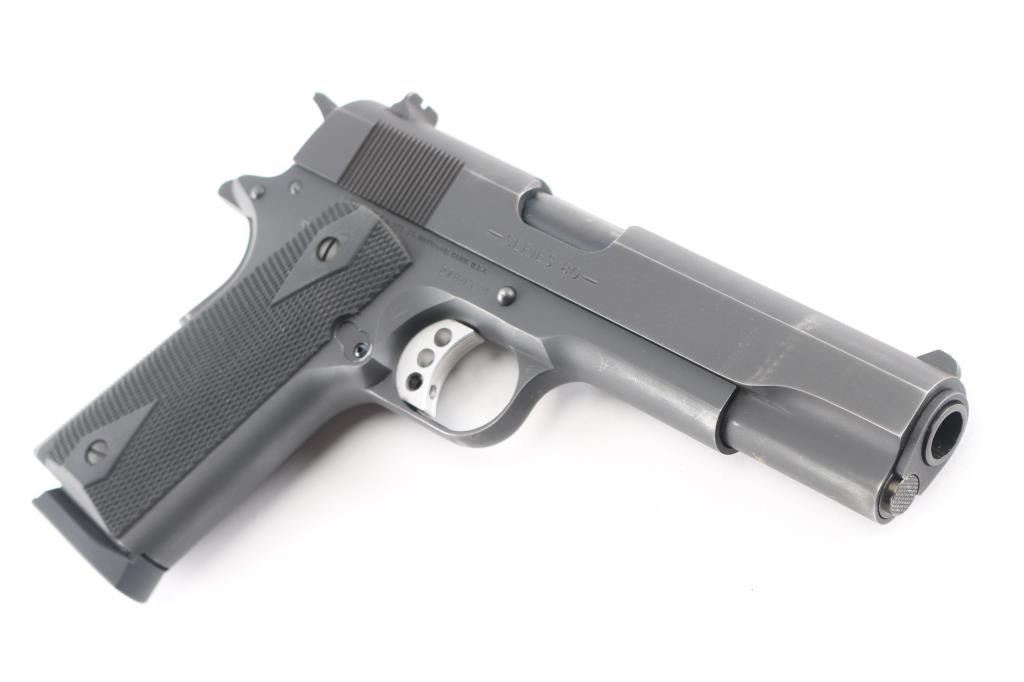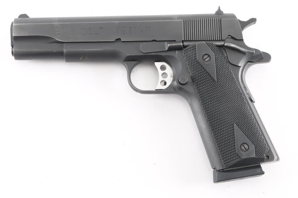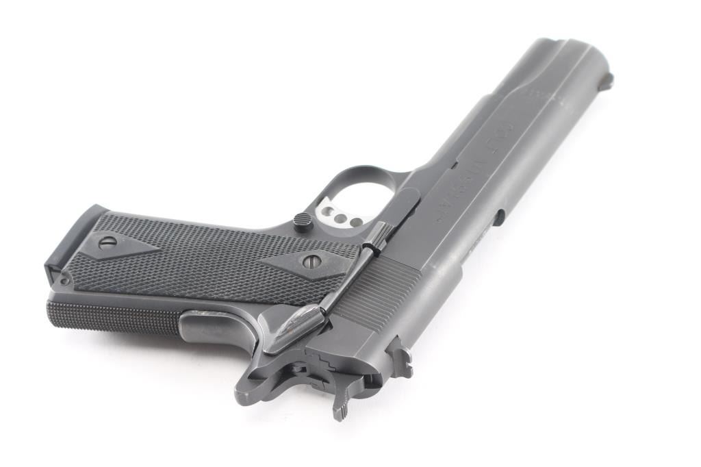 This is a series 80, M1991A1, semi-auto pistol chambered for .45 ACP Ammunition, circa 1998. It features a matte black finish, a 5" barrel, fixed blade front sight, dovetailed rear sight, skeletonized, adjustable trigger and serrated hammer spur, with black checkered rubber grip panels with 'diamonds'. Metal finish looks very good with minor edge wear/scratches. Bore is excellent/bright. Grips are fine.