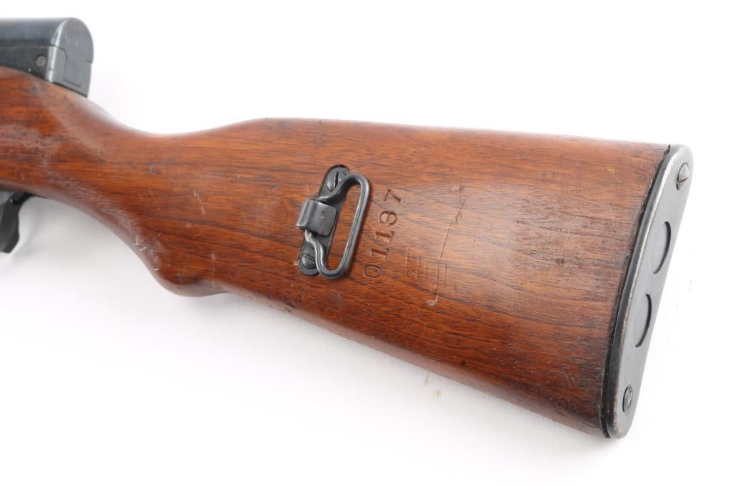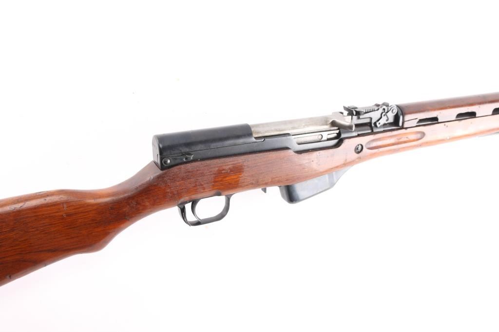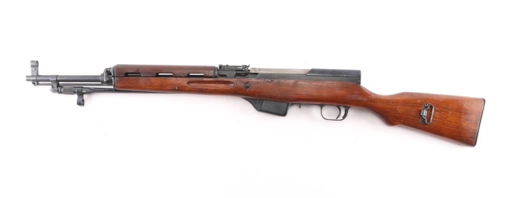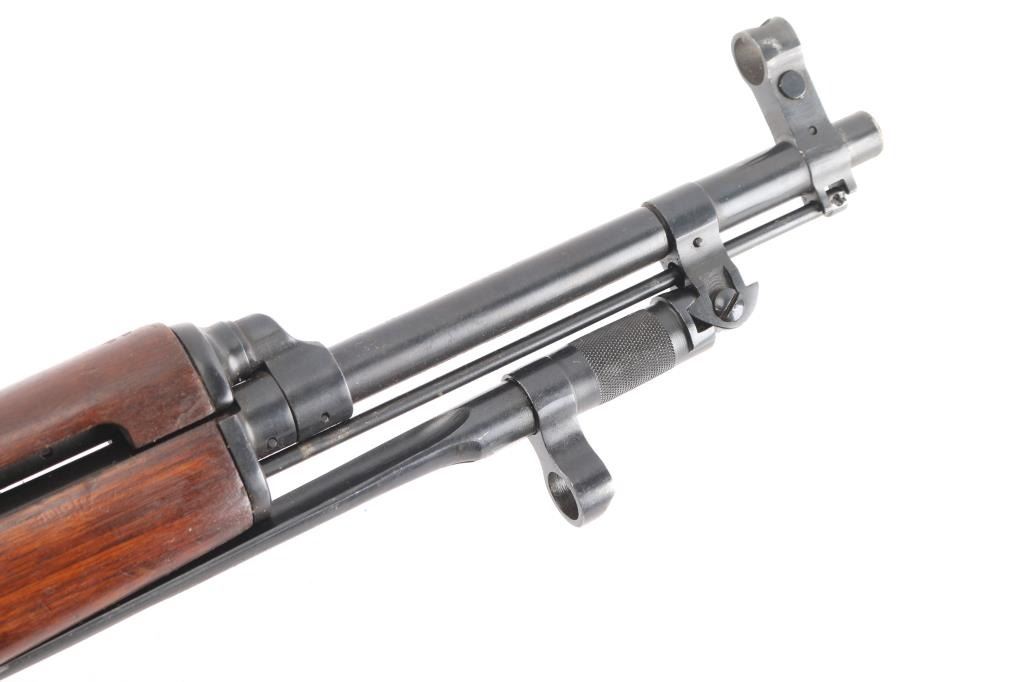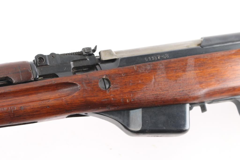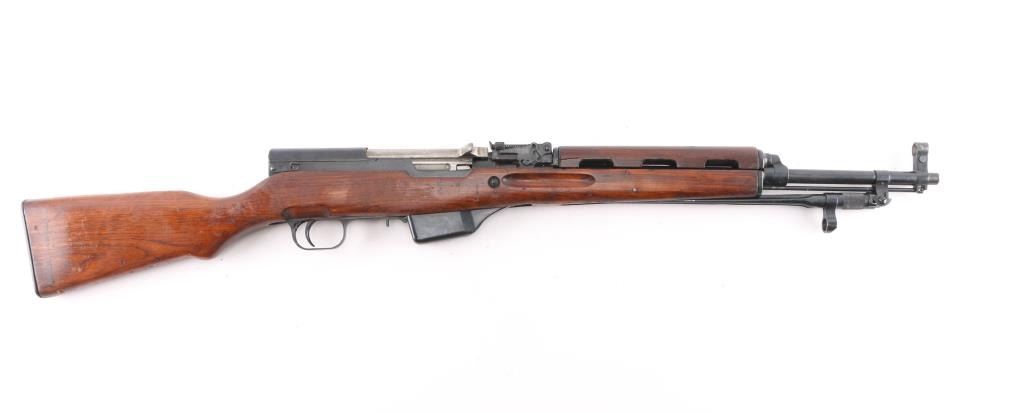 Imported by TG, Knoxville TN. Rare Albanian SKS rifle made in 1968. The Albanian SKS is the rarest of the mass-produced SKS' outside of North Korean, North Vietnamese, and East German made rifles. The Albanian SKS is different from other models as they made some changes like the AK style bolt handle, and the elongated stock and handguard for the gas system. 20.5" barrel, 11" folding spike bayonet, two trapdoors in butt plate for cleaning gear, both have cleaning gear. Serial numbers matched on the receiver, gas tube, gas piston, bolt, bolt carrier, top cover, magazine, trigger guard, rear sight & stock. Bore is excellent/bright, blue finish is mostly all there, with scratches, edge/handling wear, and a couple of patches of very light pitting on the cover, action is smooth, the wood is very good/sound, with minor blemishes & a small crudely repaired break on the right side of the handguard.