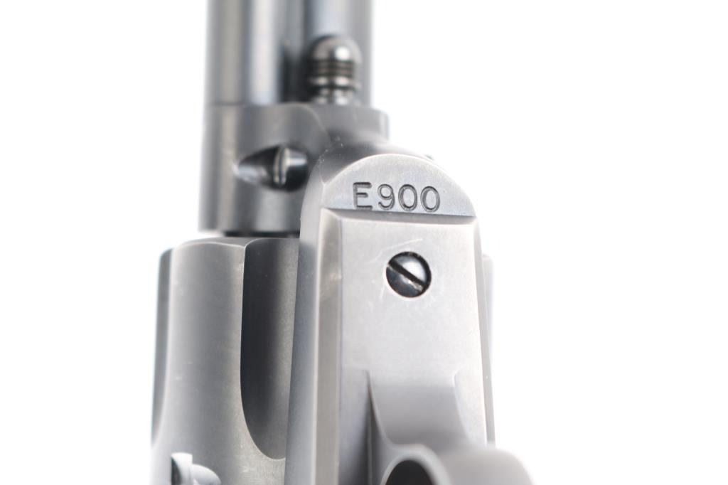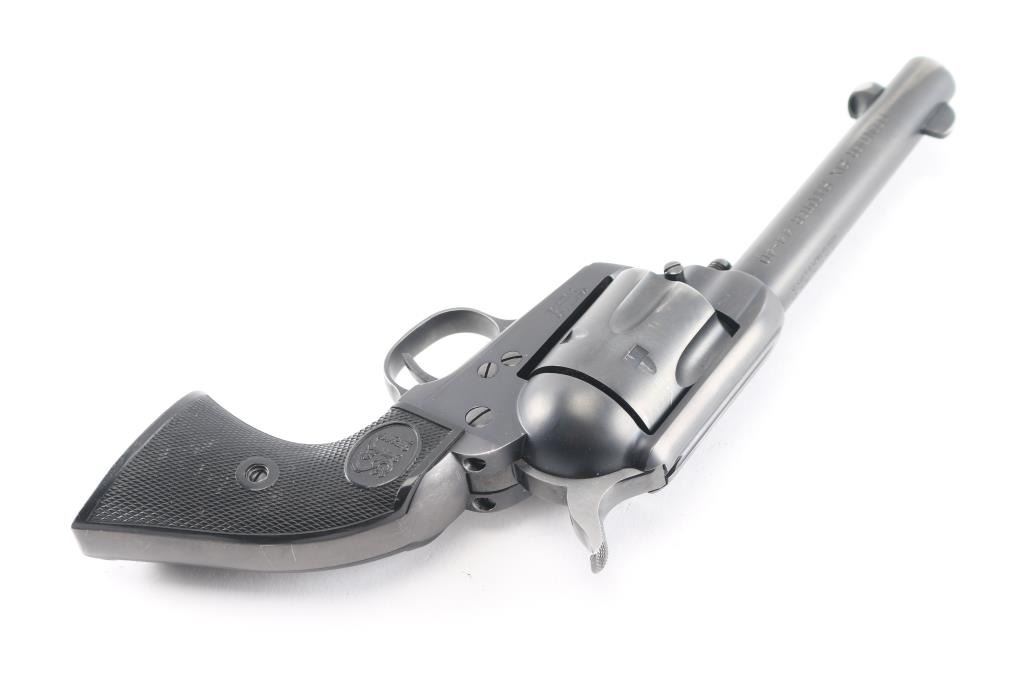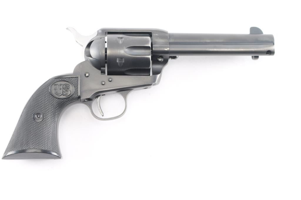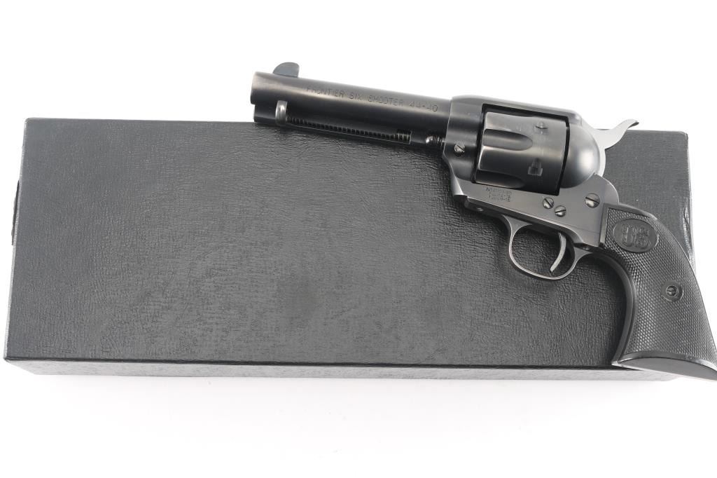 SN: E900. Exceptional single-action revolver chambered in .44-40, produced by United States Fire Arms Mfg. Co. based out of The Colt Armory complex in Hartford, Connecticut. The company is renowned for their superb quality and finish but went out of business in 2011. This revolver features a matte blued finish, 4 3/4" barrel, blade front sight, 'v' notched rear sight, crescent ejector, fluted six-shot cylinder, black powder patent dated, 1st gen hammer spur checkering, cylinder pin retaining screw, and smooth one-piece walnut grip. All visible serial numbers match and the barrel is marked with the two line USFA address on the top, "Frontier Six Shooter 44-40" on the left. Bore and charge holes are excellent/bright. Retains approximately 96% of it's original finish showing light edge wear. Two piece checkered hard rubber grips with "US" motifs are excellent. Action is smooth with tight lock up. Includes vintage styled black cardboard factory box with label. NRA Condition-Excellent. Modern Firearm.