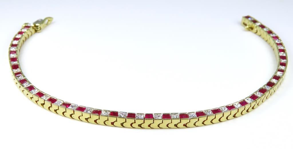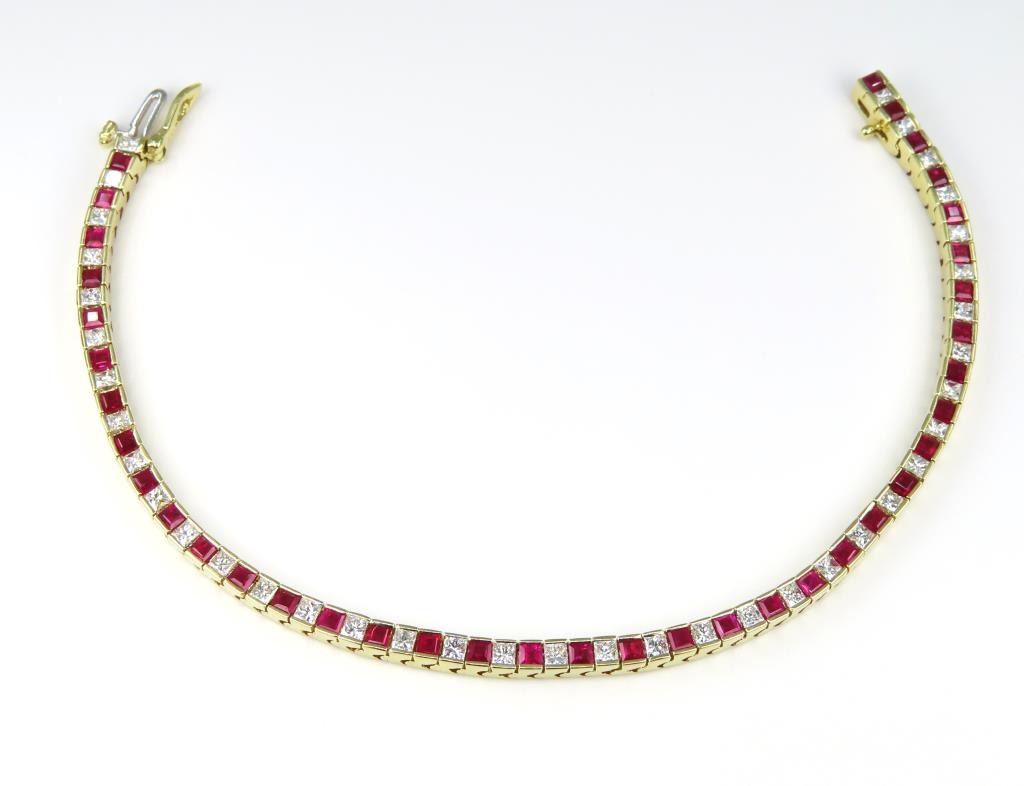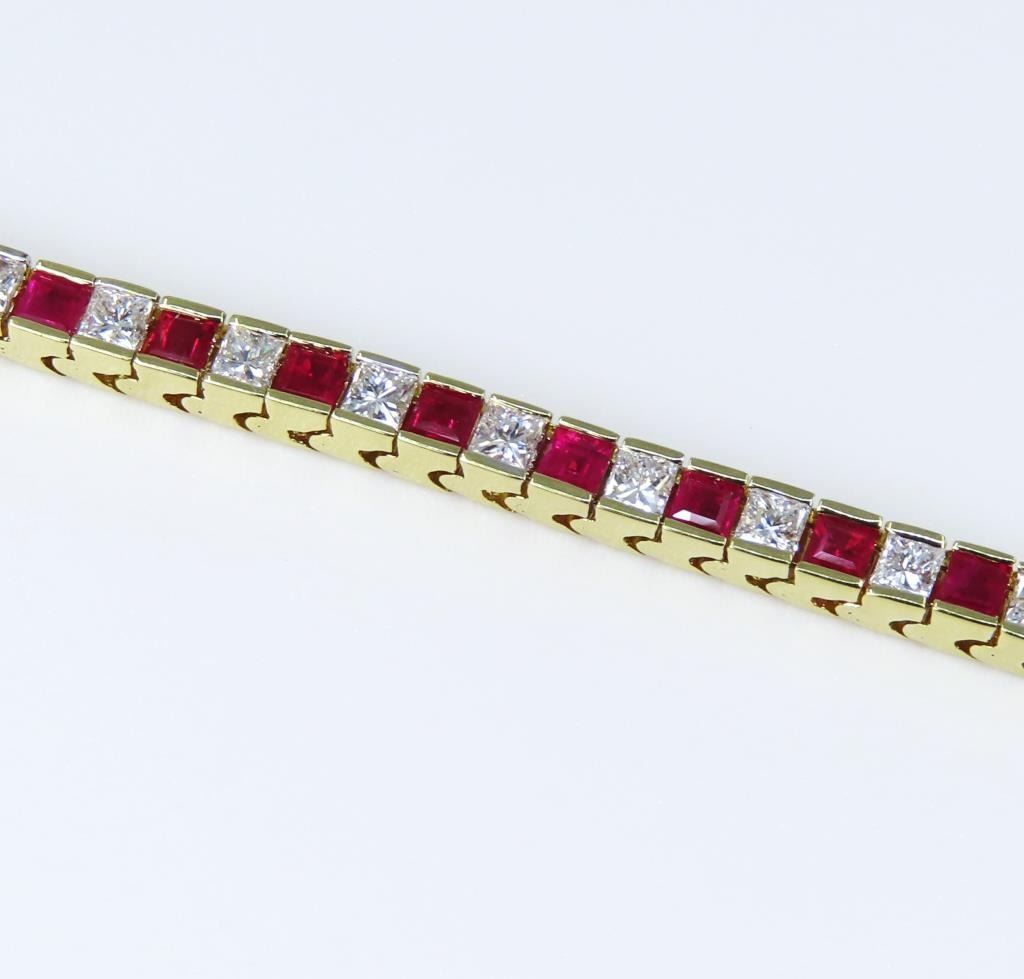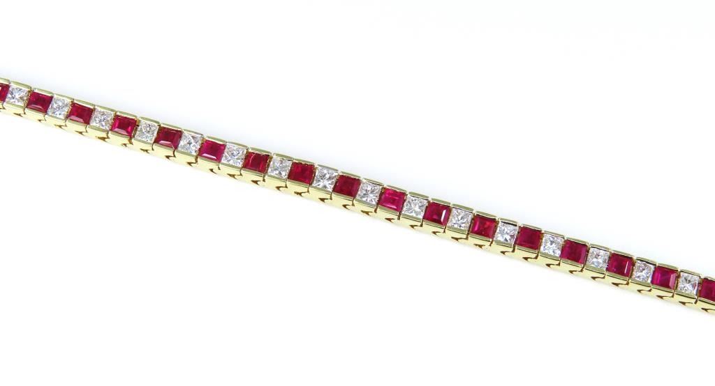 featuring 76 Princess cut Rubies and Diamonds with F-G colors and VS clarity, combined gem weight approx. 4.00 carats. This impressive channel set bracelet is finely crafted in 14 karat yellow gold. Retail $10,000-$15,000