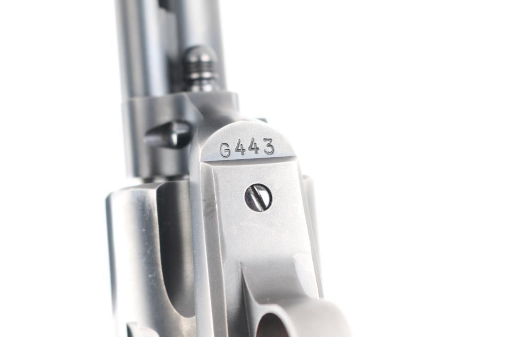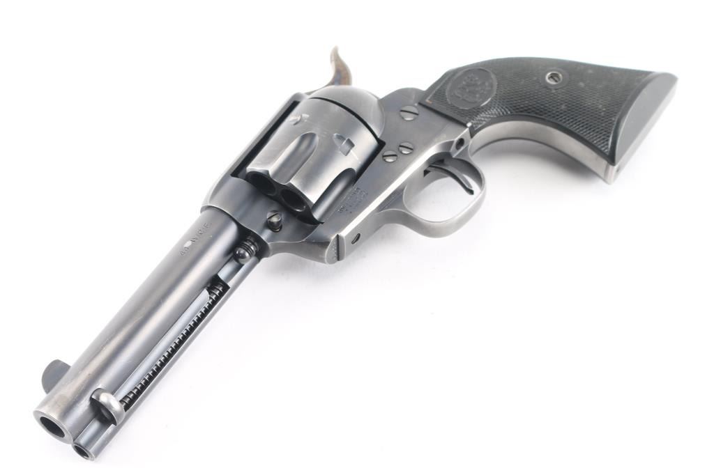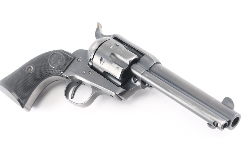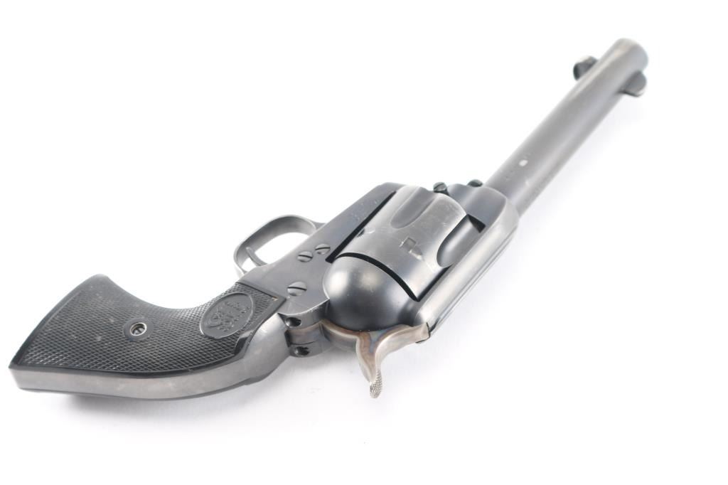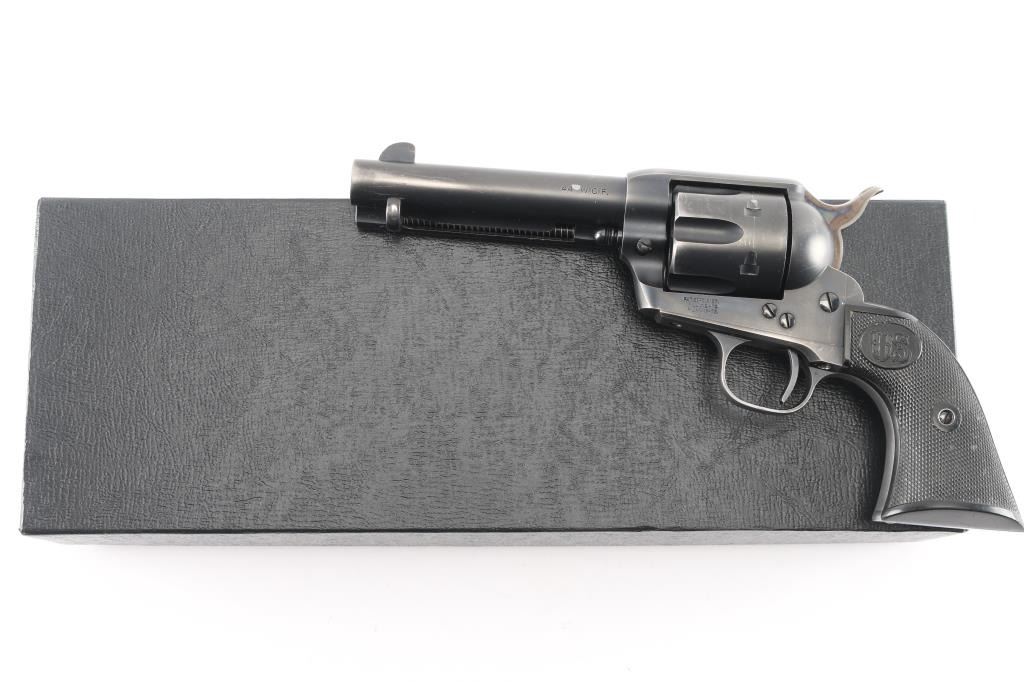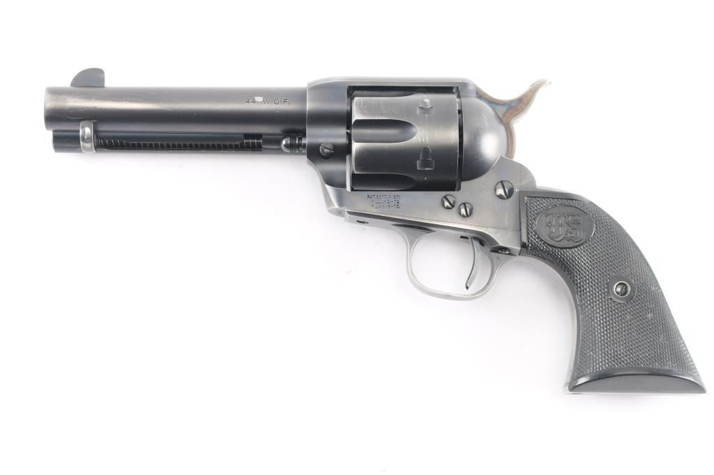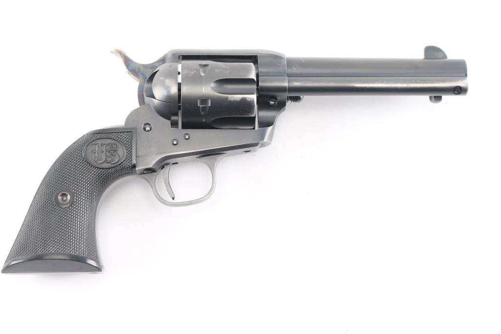 Exceptional single-action revolver chambered in .45 Colt, produced by United States Fire Arms Mfg. Co. based out of The Colt Armory complex in Hartford, Connecticut. The company is renowned for their superb quality and finish but went out of business in 2011. This revolver features blued finish, 4 3/4" barrel, blade front sight, 'v' notched rear sight, crescent ejector, fluted six-shot cylinder, black powder patent dated, case hardened hammer with 1st gen spur checkering, cylinder pin retaining screw, and checkered hard rubber two-piece grips with "US" motifs. The barrel is marked with the two line USFA address on the top. Bore and charge holes are bright, very good condition. Retains approximately 80% of it's original finish showing holster/edge wear, a small rub on the barrel over the caliber designation, & a rub on the cylinder with finish loss. Grips are excellent. Action is smooth with tight lock up. Includes vintage styled black cardboard factory box with paperwork. These guns retailed for $1250 new, when you could get them.
