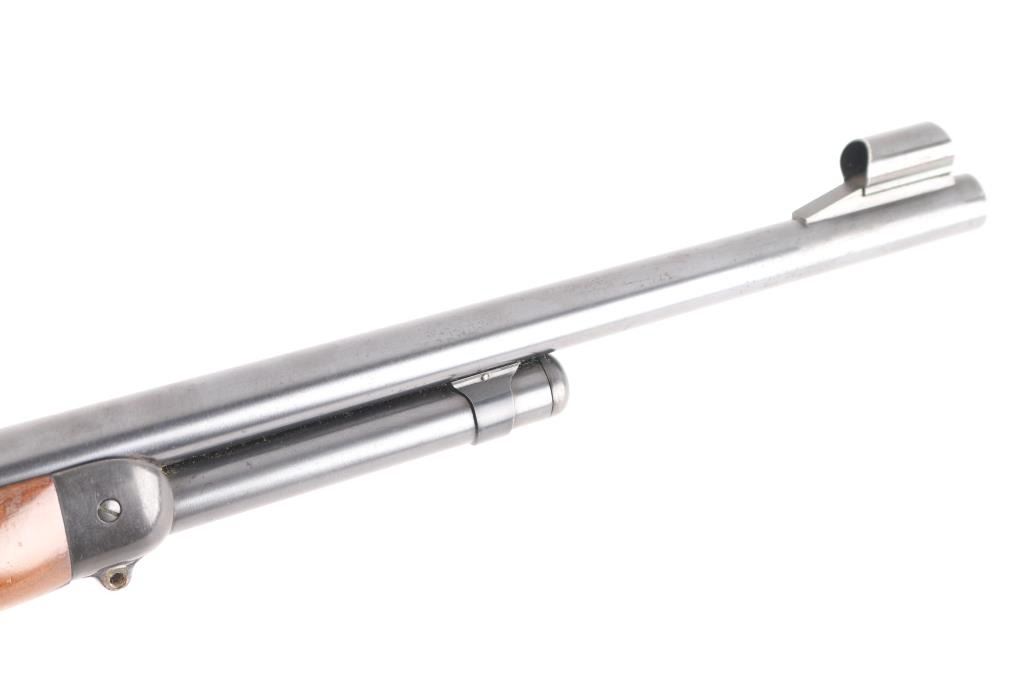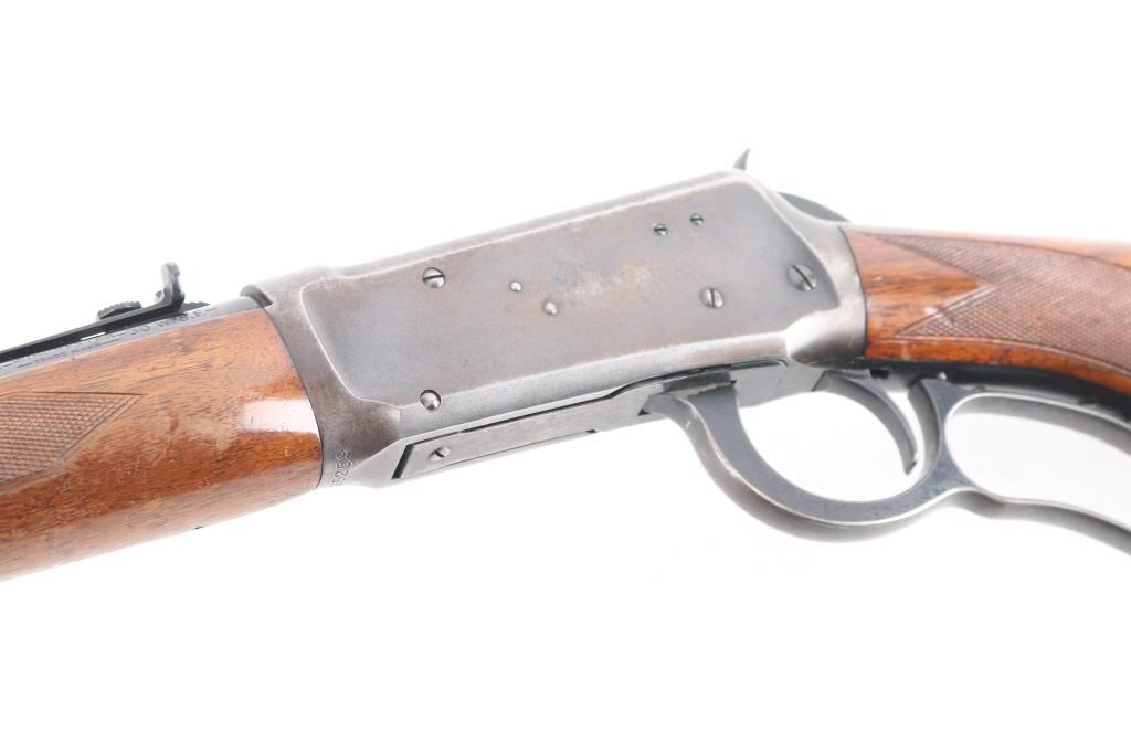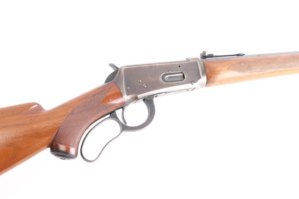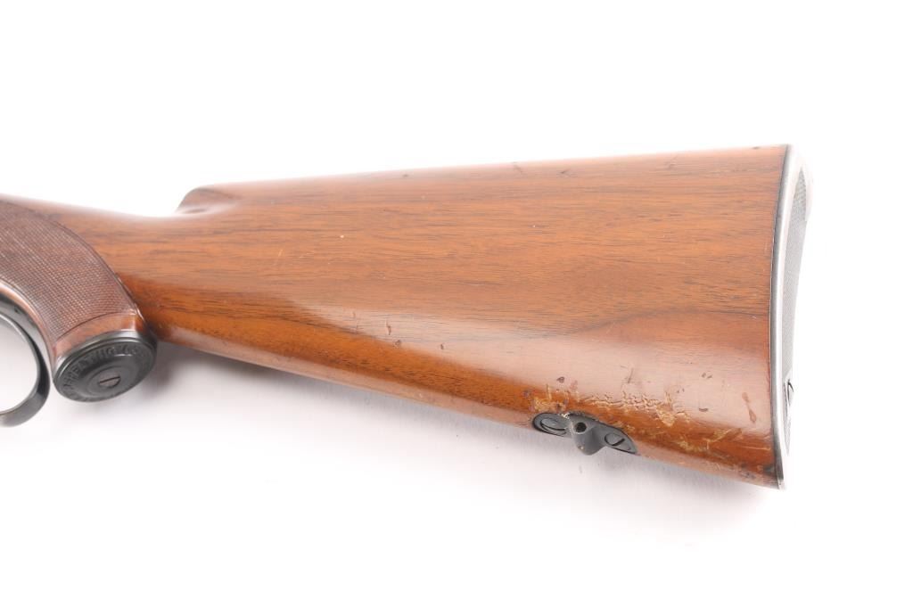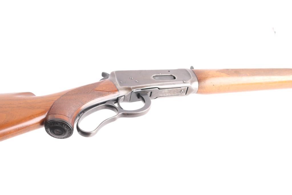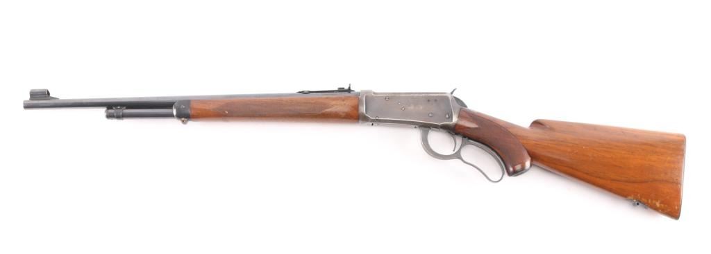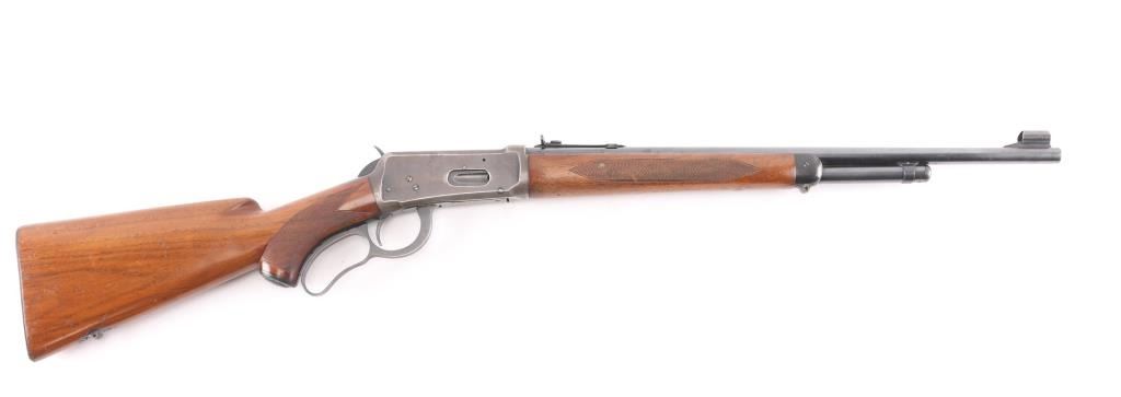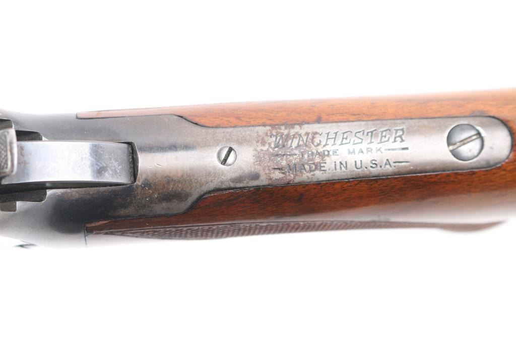 ‘Deer Rifle, Carbine’ Desirable pre-war lever action repeating rifle chambered in .30-30 Winchester. Manufactured in New Haven, CT circa 1935. Features a blued finish, 20" round tapered barrel, 2/3 length tube magazine, ramped & hooded blade front sight with brass bead, elevation adjustable rear sporting sight, smooth curved trigger, knurled hammer spur, curved finger lever, grip safety, factory drilled & tapped receiver, checkered walnut semi-beavertail forearm, metal forend cap with milled swivel stud and pistol grip shoulder stock with factory grip cap, inlet swivel stud, knurled steel ‘shotgun’ buttplate & 13 1/8” LOP. Rifle retains approximately 70-80% original bluing showing drifting and loss of finish mostly on the frame. The action is tight, the bore is bright, the markings/edges are sharp and the walnut stocks are good to very good with minor scratches, dings & mars.