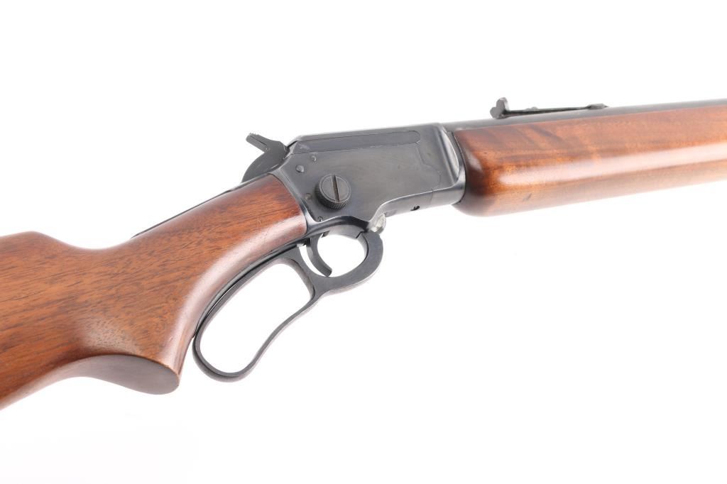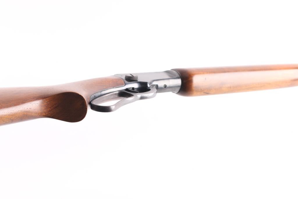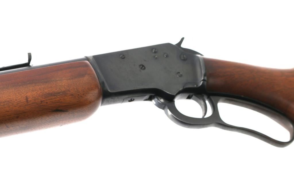 Lever action rimfire rifle manufactured circa 1984. Features blued finish, smooth walnut forend & curved grip shoulder stock, 24" round barrel, brass dot front sight with sight hood stored on mag tube, sporting rear sight, factory plastic buttplate, steel forend cap. Large take-down screw on right side allows disassembly into two halves for storage or travel. Bore is in very good condition. Retains 95% finish, with edge losses, handling marks. Wood is very good with few minor blemishes. Markings are crisp. Hole pre drilled for swivel stud in rear stock.