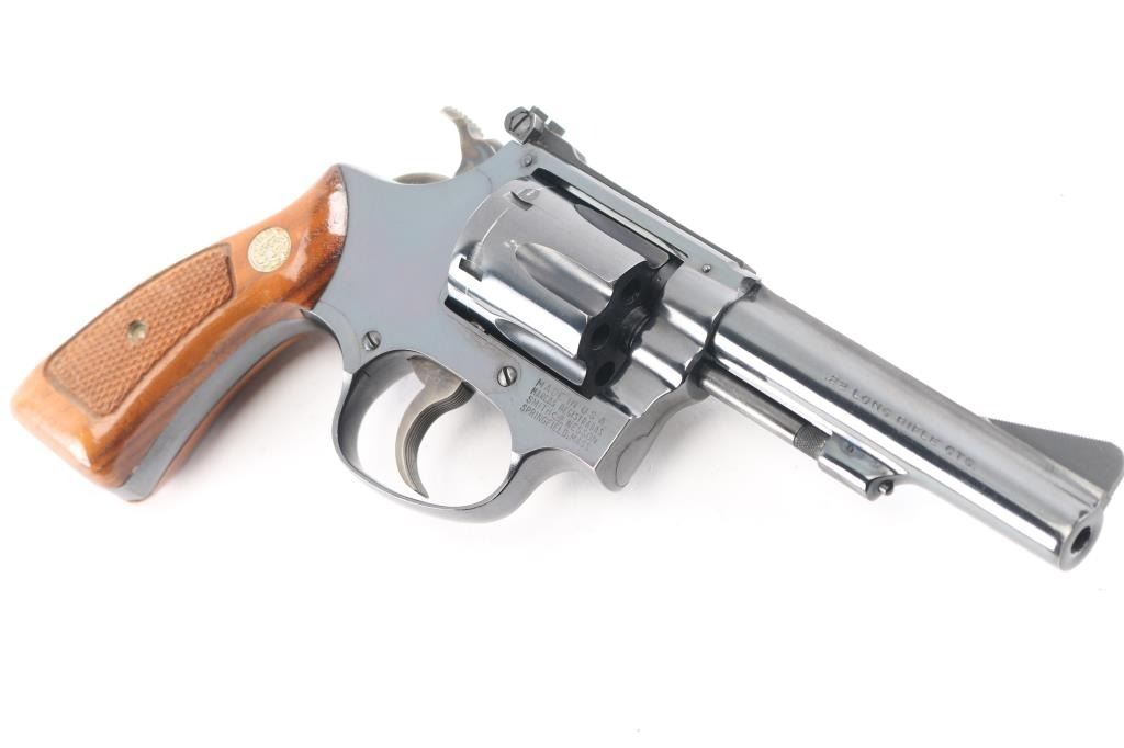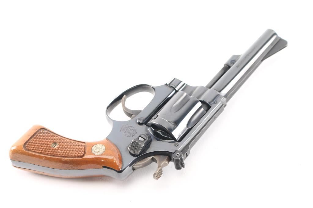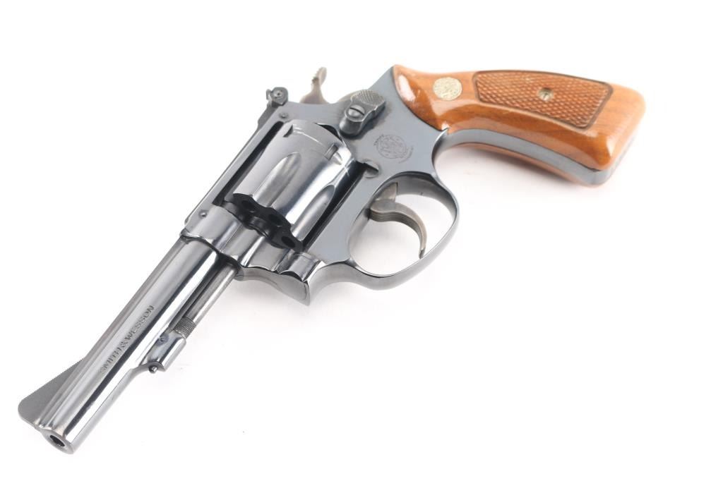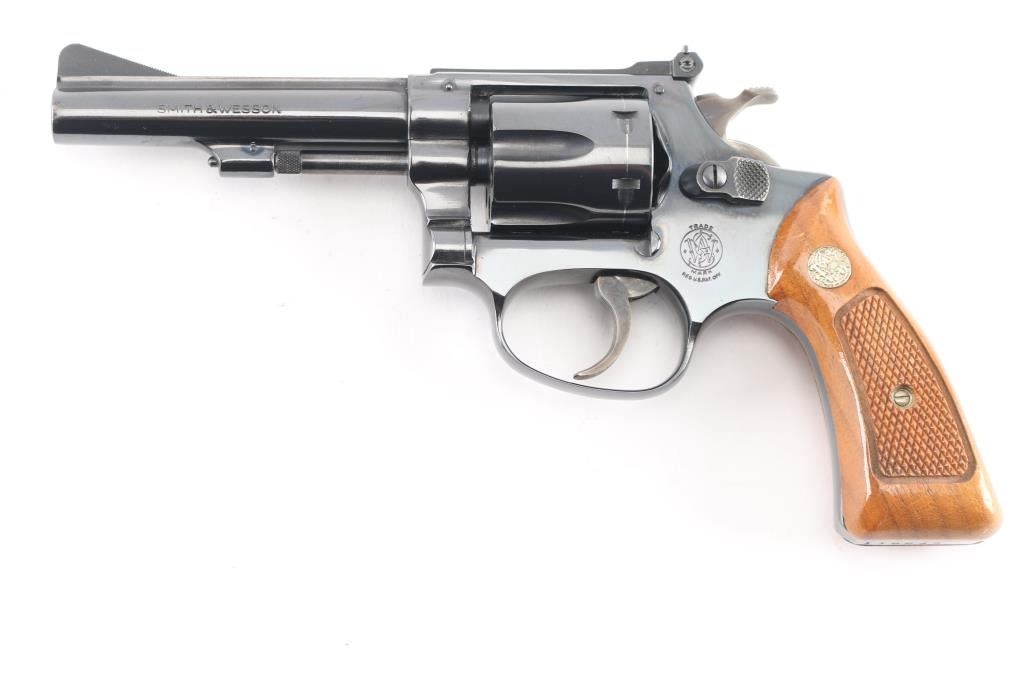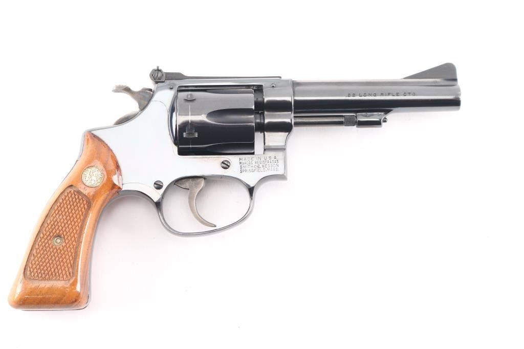 'Kit Gun' Double action rimfire revolver circa early 1960's. Features blued finish, checkered wood "magna" grips with S&W medallions, 4" pinned barrel, serrated ramp front and adjustable rear sights, square butt, "J" frame, 6 shot fluted cylinder. Overall condition is excellent with smooth operation and tight lock-up, 95% coverage of deep blued finish with some edge losses & a few minor scratches, small bare metal patch on cylinder, drag line, very good bore. Grips are very good condition.