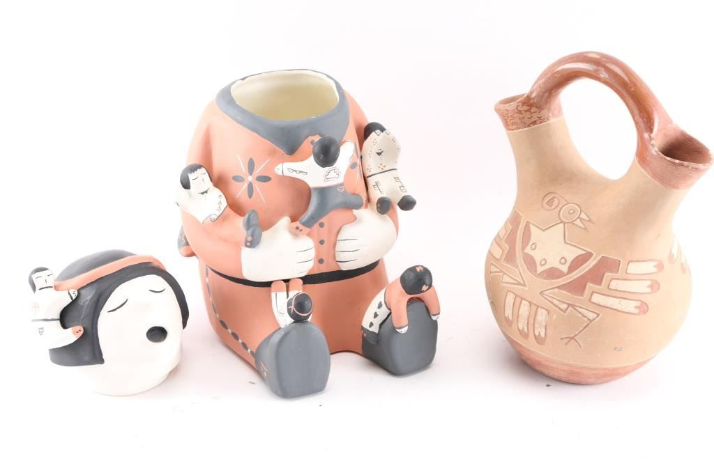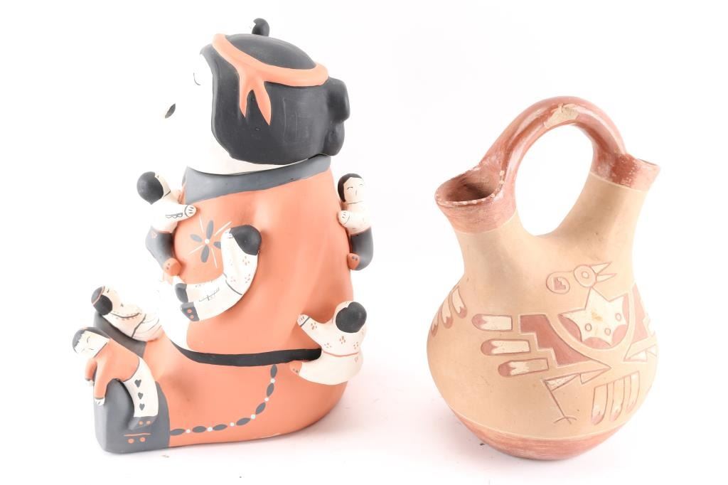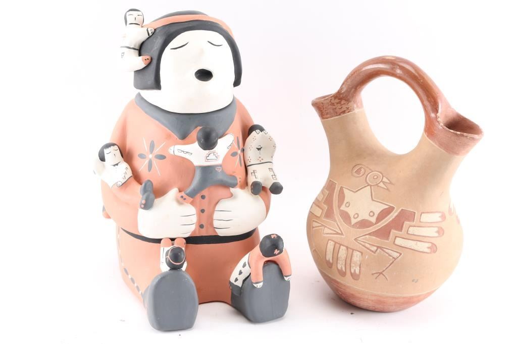 Cochiti marked storyteller handpainted jar, 13"T and a Wedding Vessel has a painted thunderbird design, 12"T