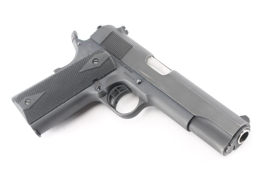 1911A1 pattern single action semi-automatic pistol manufactured circa 2012. Features blue finish, 5" barrel, fixed 3-dot sights (front sight is missing the white dot), knurled, adjustable, skeletonized trigger, serrated hammer spur, thumb safety on the left side of the frame, grip safety, push button magazine release, checkered hard rubber grips, flat, knurled mainspring housing & wrap-around grips, 'beavertail' grip safety. Bore is excellent/bright. Retains 95% finish with minor edge wear/scratches. Grips are very good condition. Includes one factory magazine, and a spare Wilson Combat magazine with extension. Comes in a black nylon range bag with carry strap, side magazine holders.
