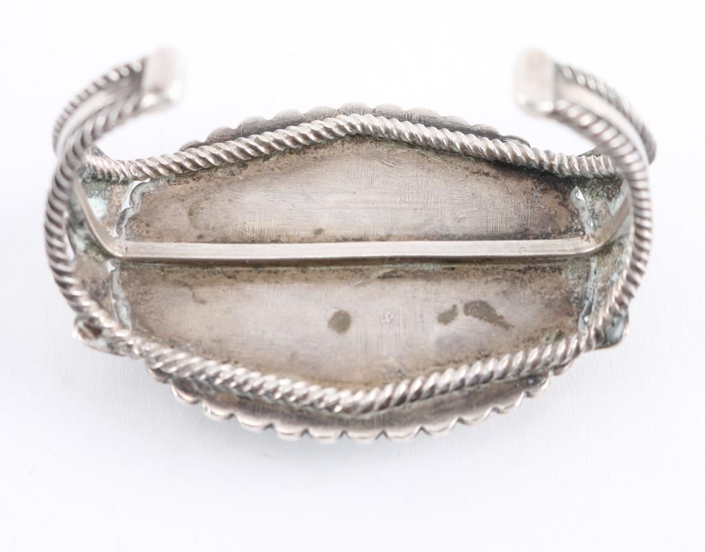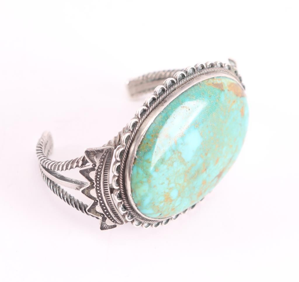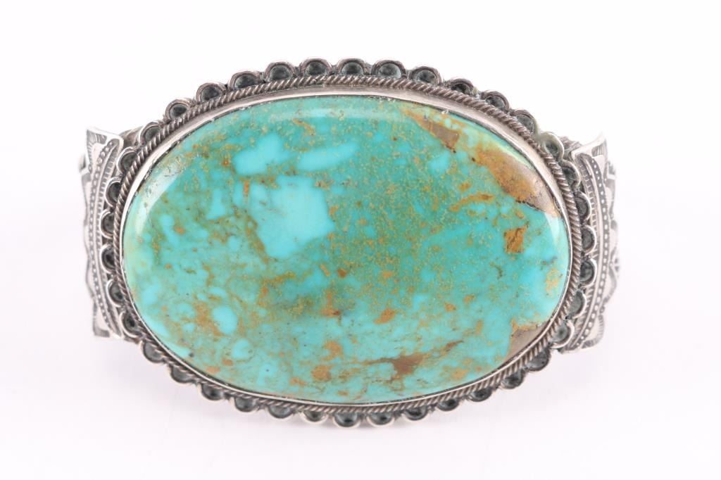 Large Oval Cut Turquoise Stone Set In Sterling Silver, unmarked, Old Pawn Design, measures 7", including gap.