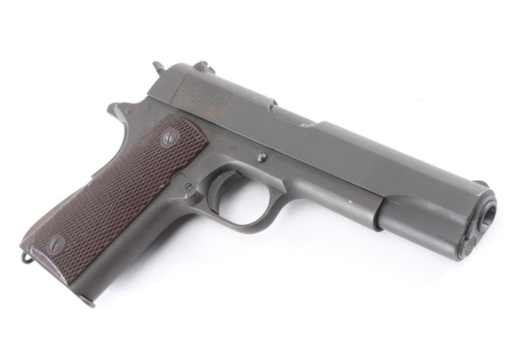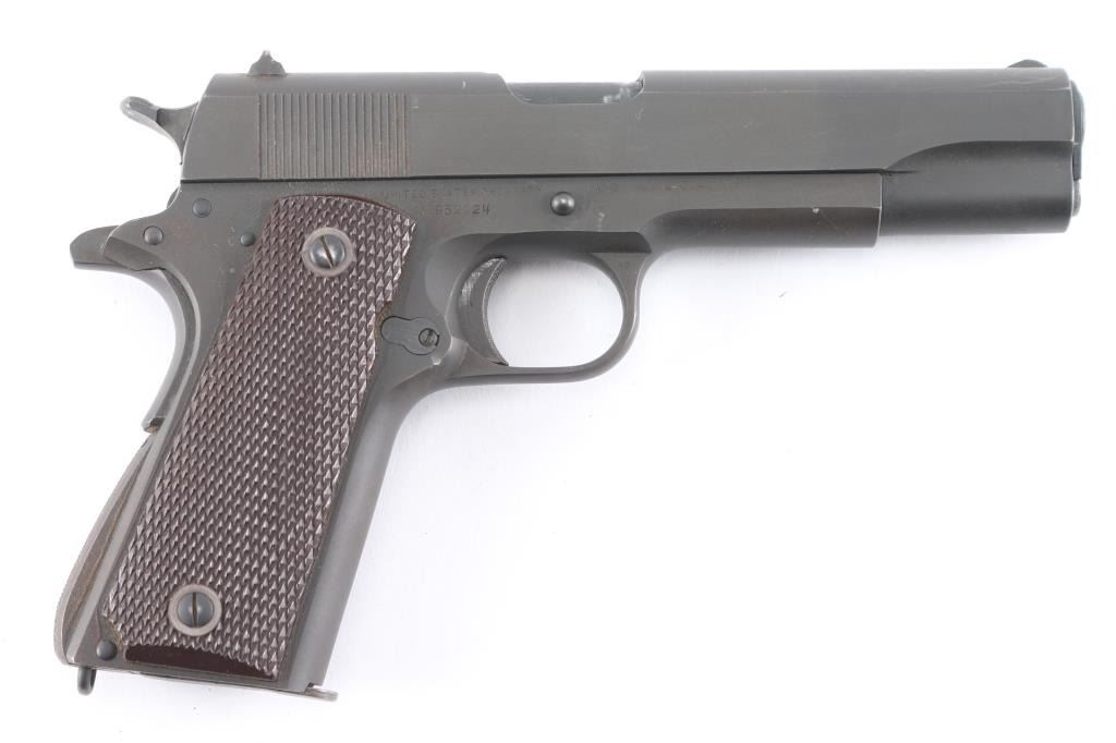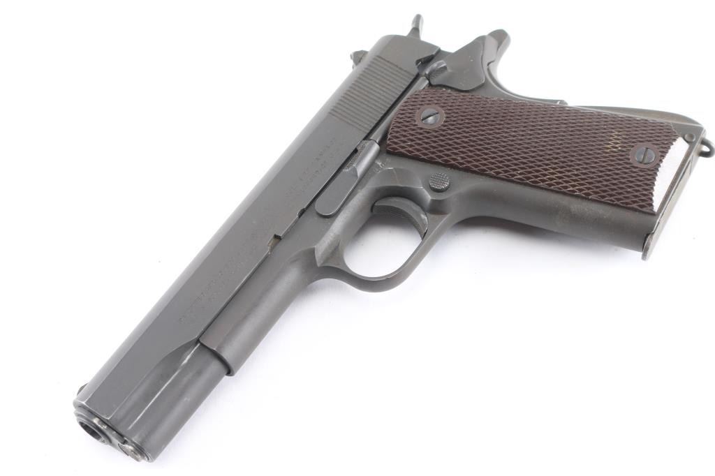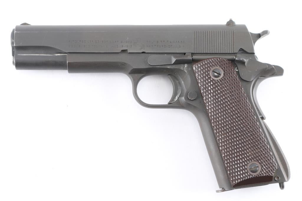 WWII era U.S. military contract single action semi-automatic service pistol chambered in .45 Auto, manufactured in Hartford, CT circa 1943. Features a parkerized finish, blued 5" barrel, low-profile round blade front sight, dovetailed rear sight with ‘u’ notch, knurled trigger, knurled wide hammer spur, manual safety on the left side of the frame, grip safety, push button magazine release, 7 round magazine (unmarked, parkerized), steel frame, knurled arched mainspring housing with lanyard loop, and checkered brown plastic USGI grips. Markings: Slide - "PATENTED APR.20,1897. SEPT.9,1902/DEC.19,1905. FEB.14,1911. AUG.19,1913”, [rampant colt], “COLT'S PT. F.A. MFG. CO./HARTFORD, CT. U.S.A.," "P," "952/924". Frame - "UNITED STATES PROPERTY," "No952924," "M1911A1 U.S.ARMY", crossed cannon emblem (partial), boxed "G.H.D.", "P", "W", "VP" inside a triangle and "93". Barrel - "45 AUTO / 7791193" (1960's USGI replacement barrel), "P" and "M". Bore shows good rifling, overall bright, with darkness in grooves that may clean out. Pistol retains approximately 95% of matte medium gray finish with slightly brownish tone, showing edge wear, handling marks. No blemishes in the steel observed under what appears an arsenal refinish, with original contours and edges retained. Slight thinning across rampant colt. Some portions of some letters missing, appears due to wear of the roll marking die. Final "24" in serial is noticeably deeper than other numbers. Grips are very good with handling marks. Magazine appears refinished, shows roughness when viewed under magnification.