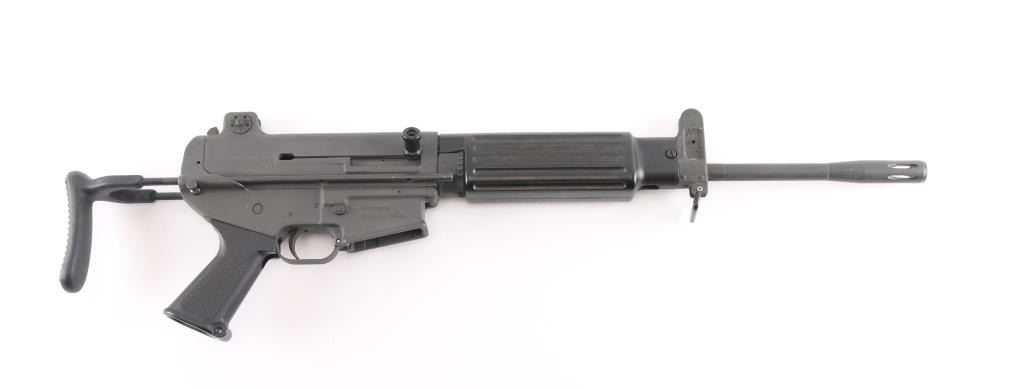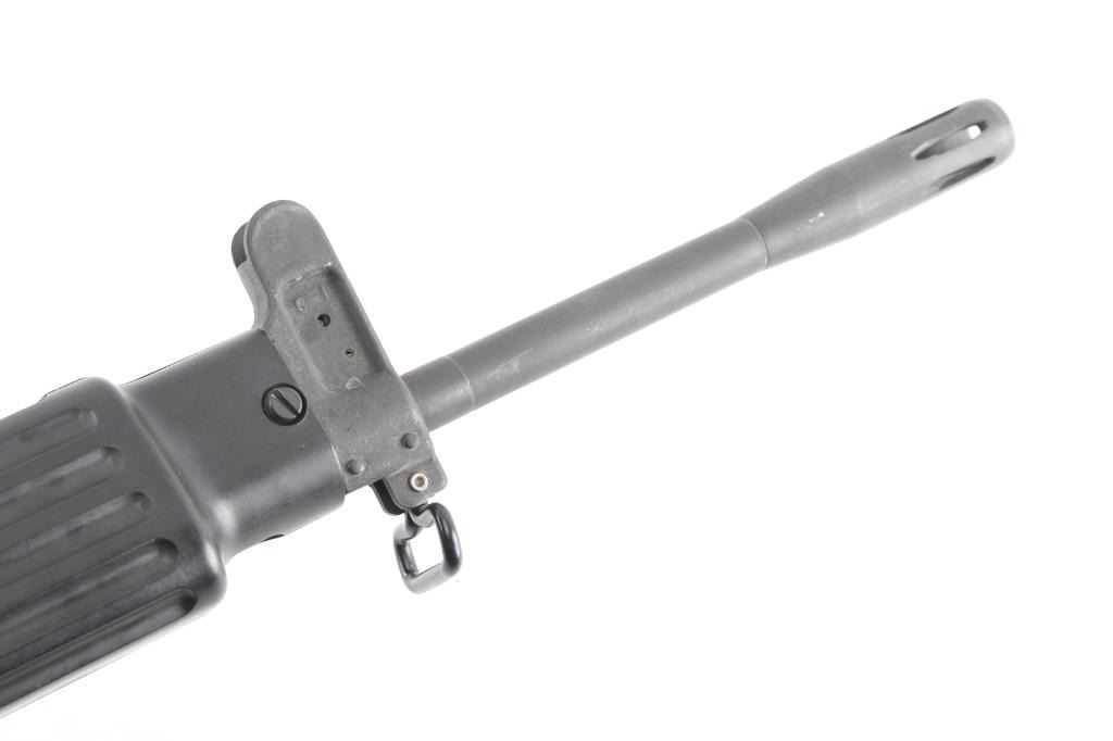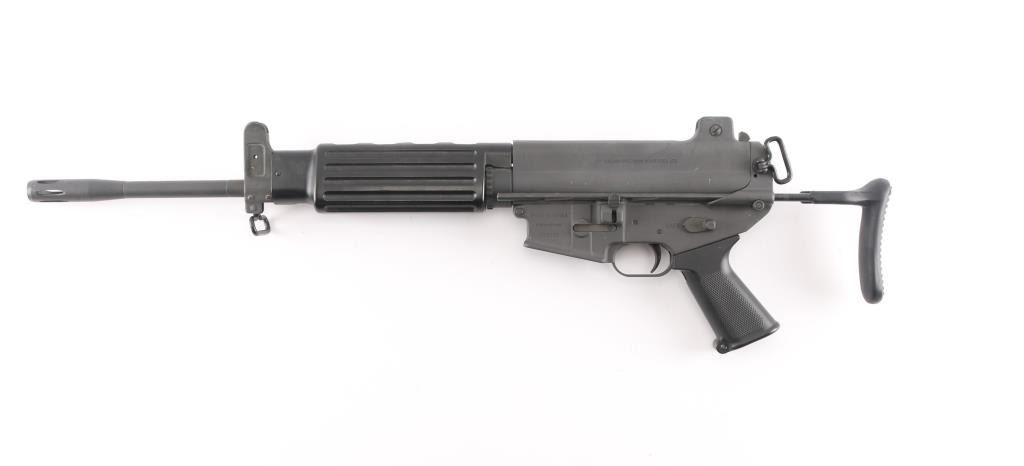 Parkerized finish is near 95% with normal handling marks. 17 inch barrel with permanently attached muzzle brake. Military style aperture sights. Polymer handguard, pistol grip with storage, manual flip safety, sling swivels, collapsible rear stock with rubber textured butt plate. Takes AR15 Mags. No mag included.