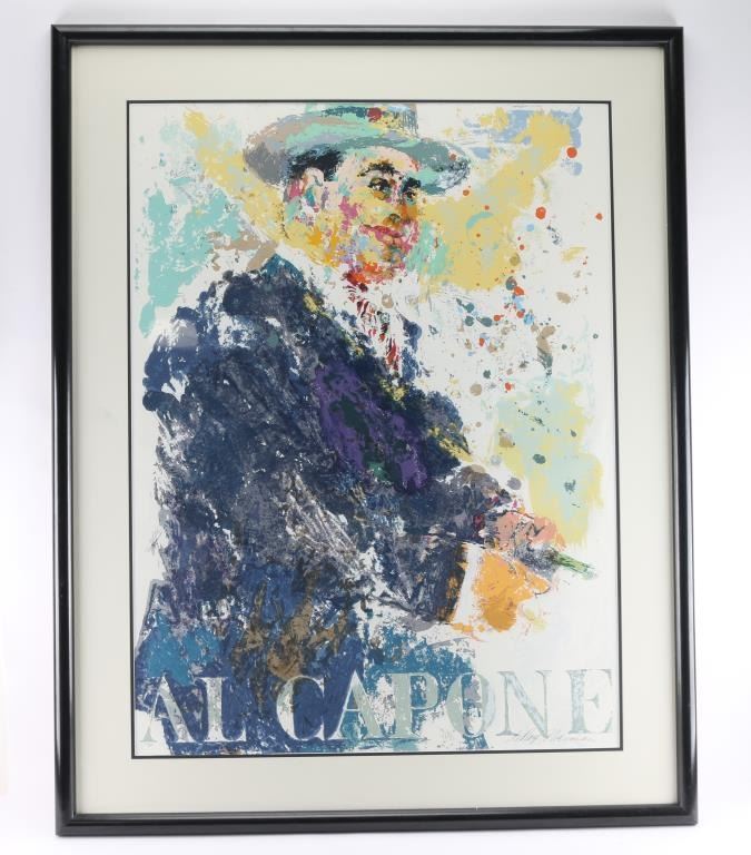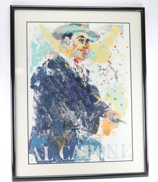 by famous artist Leroy Neiman entitled Al Capone. Measures 38"x29", hand signed in pencil lower right hand corner. Limited edition 80/300. Double matted in black frame.